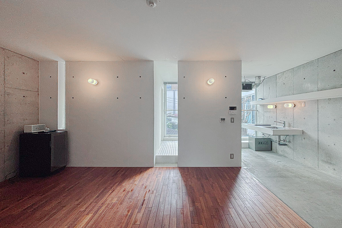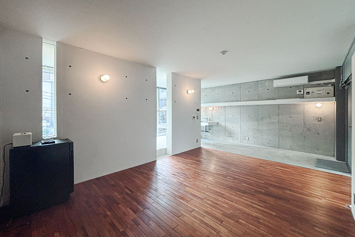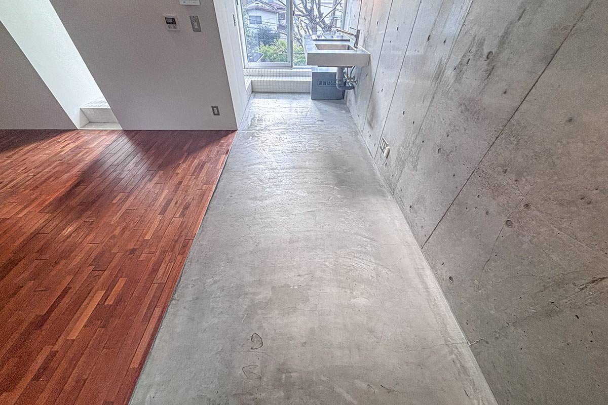 コンクリ壁に玄関の土間仕様、無垢床の内装はTHEデザイナーズの佇まい。