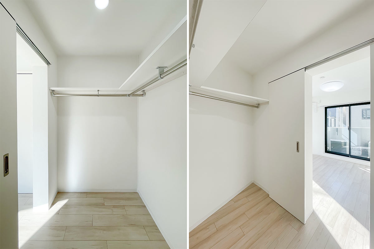 洋室にはコの字にハンガーパイプが配置された大きなウォークインクローゼットも!