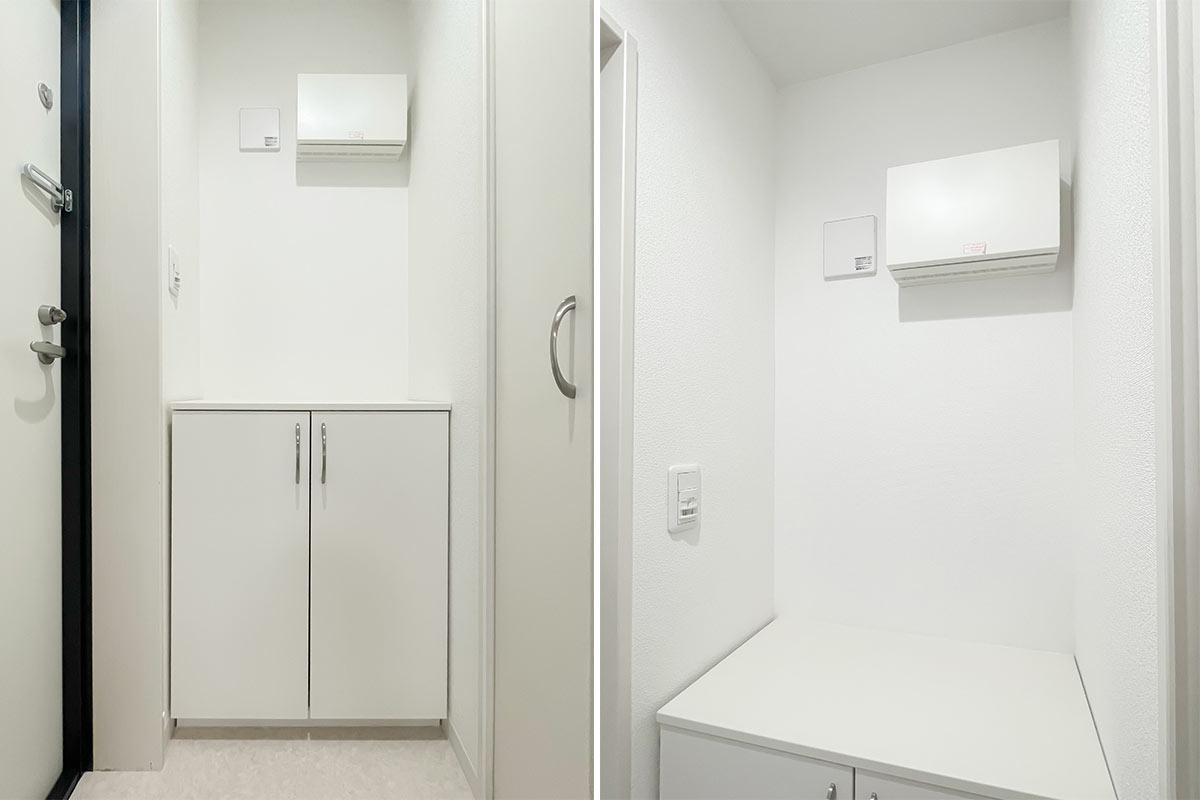 キッチン横の冷蔵庫スペースは幅115cmほどあり、冷蔵庫に加えて、45〜55cm幅の家電ラックも置くことができる幅広スペースでした。