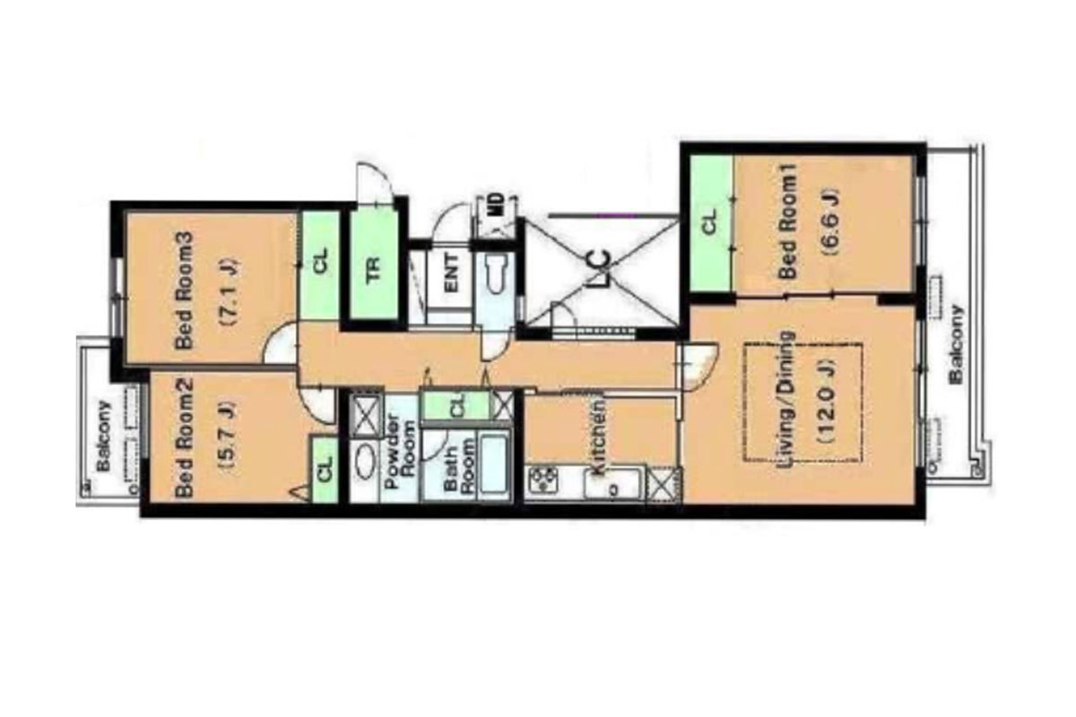 12帖のリビングと隣接する6.6帖の洋室、廊下を挟んで反対側に7.1帖と5.7帖の洋室のある間取り。
