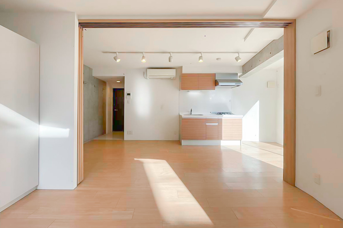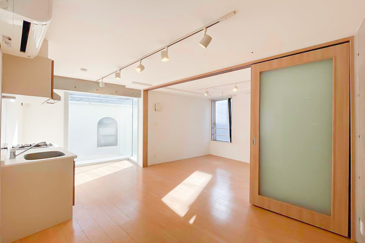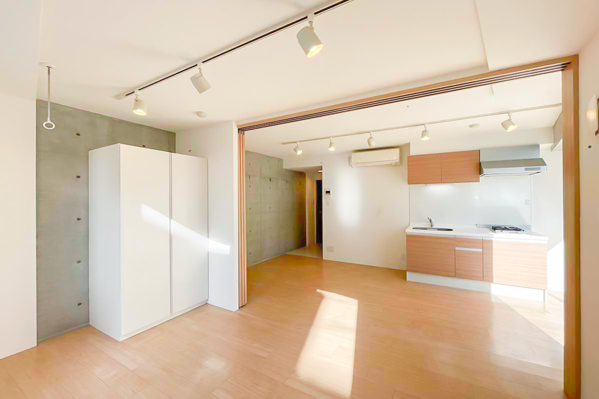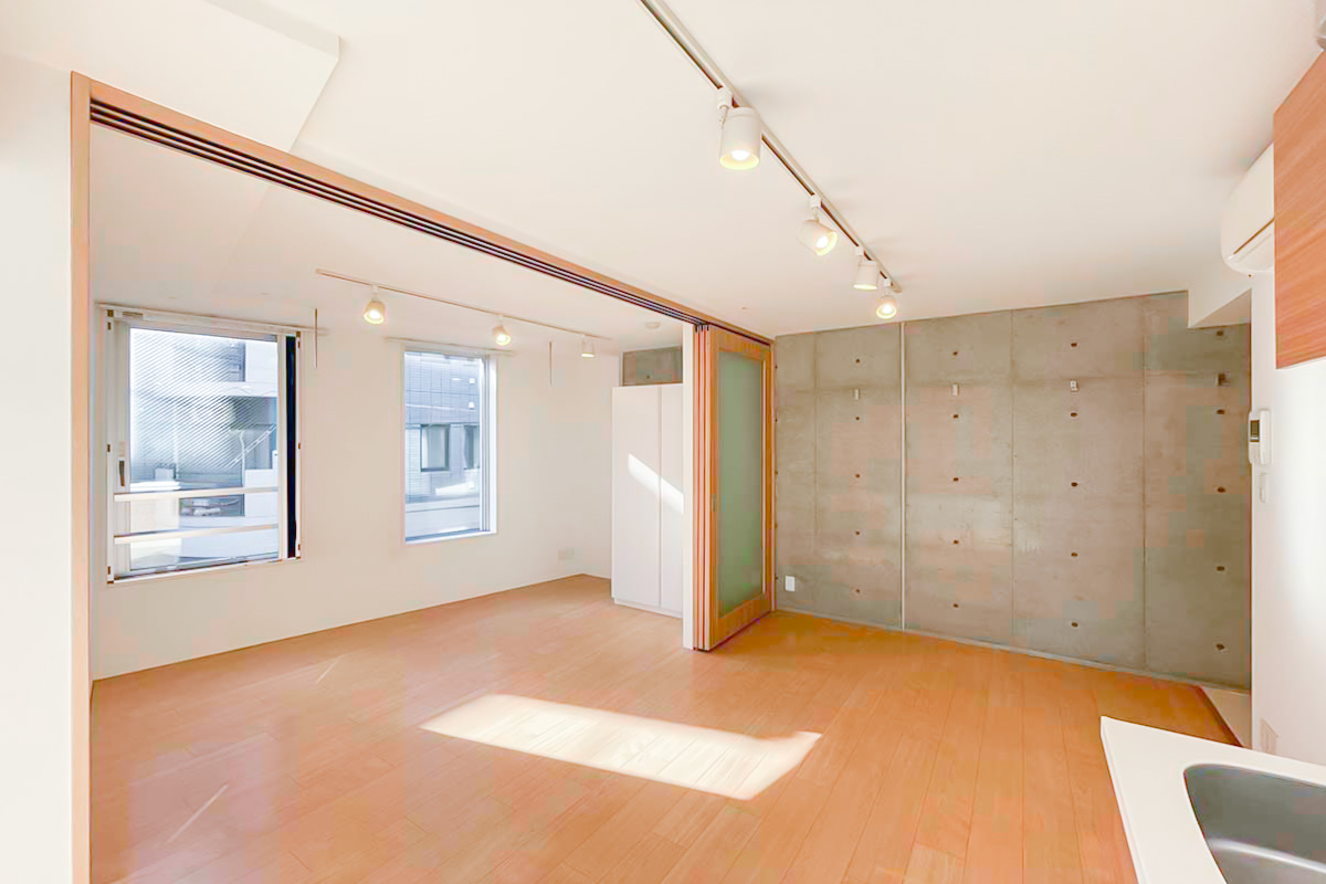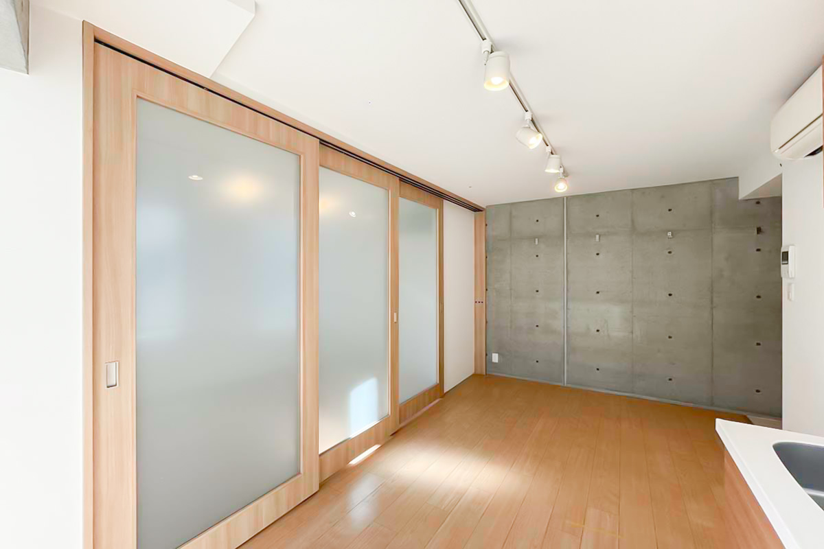 台形の形になっており凹凸もあるため、寝る時以外はドアを開け放って約13帖のワンルームとして使うのがおすすめです。