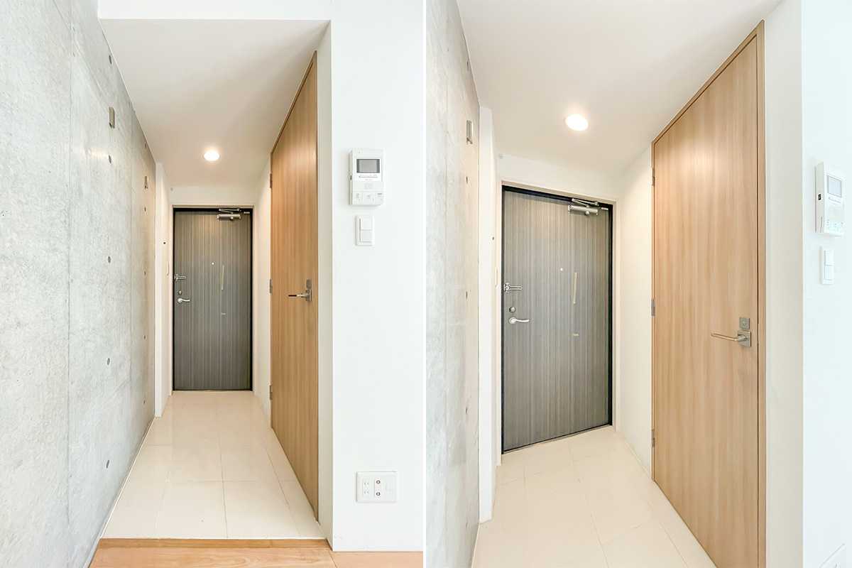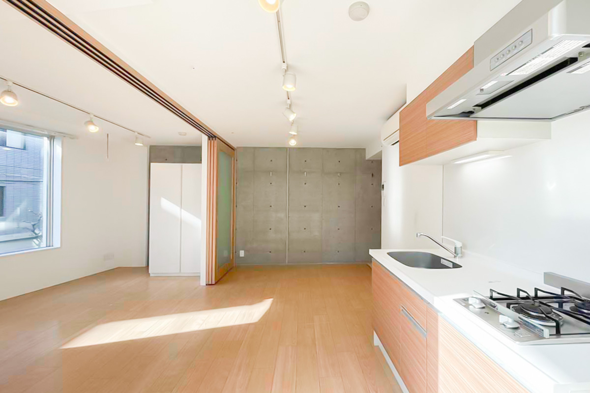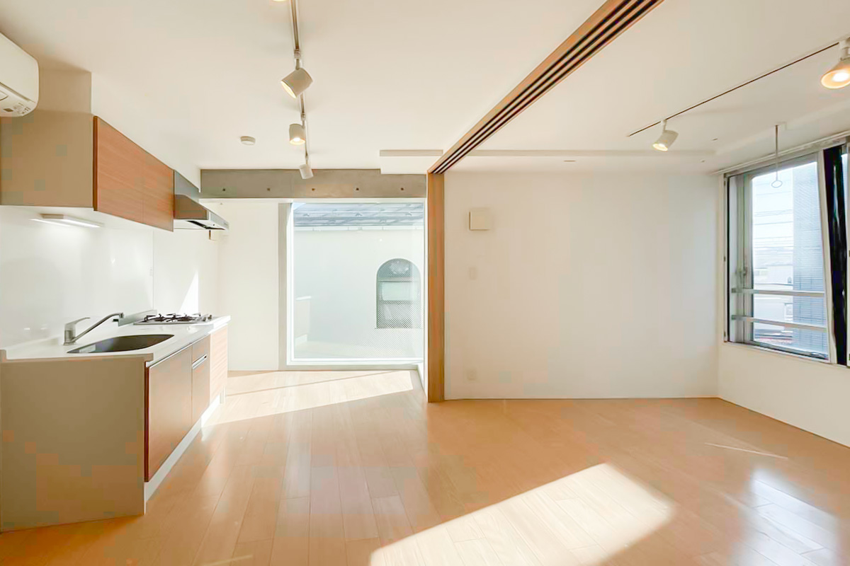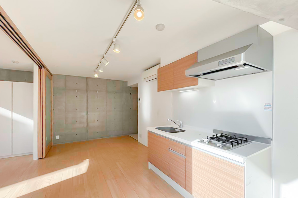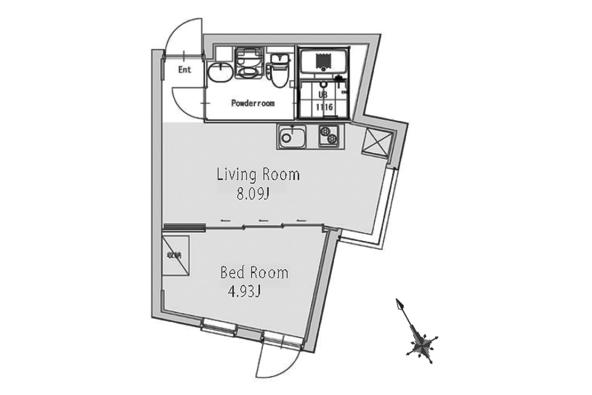 台形の形になっており凹凸もあるため、寝る時以外はドアを開け放って約13帖のワンルームとして使うのがおすすめです。