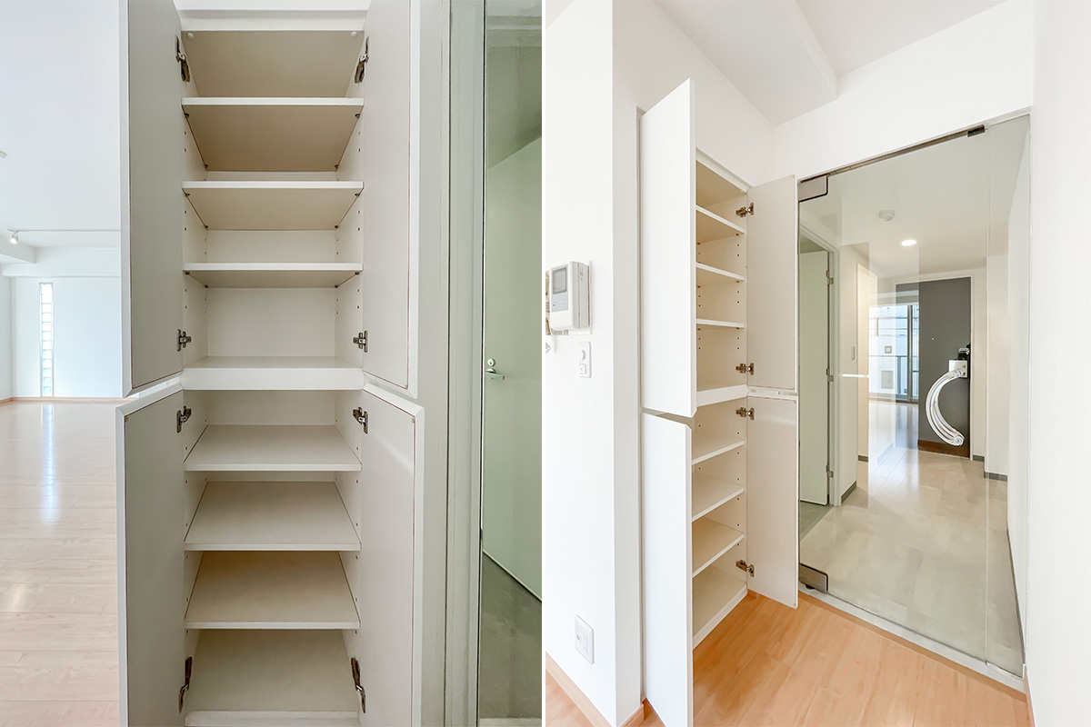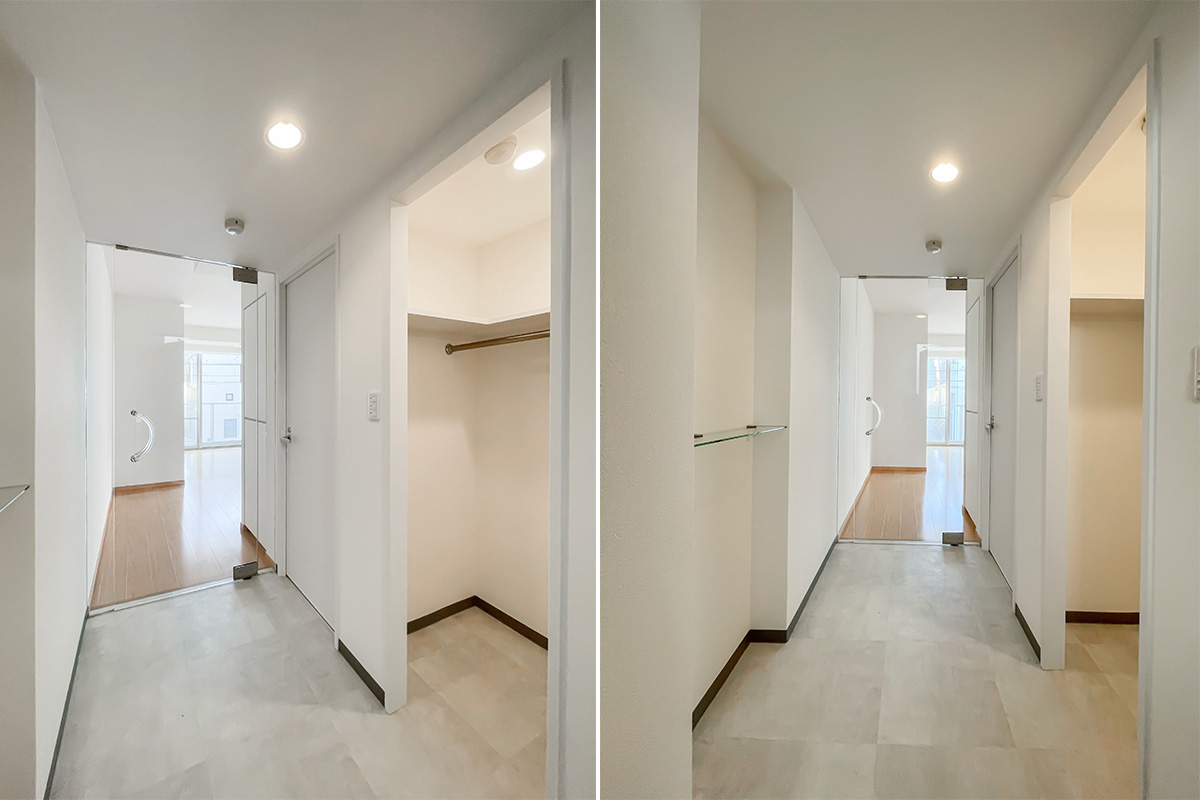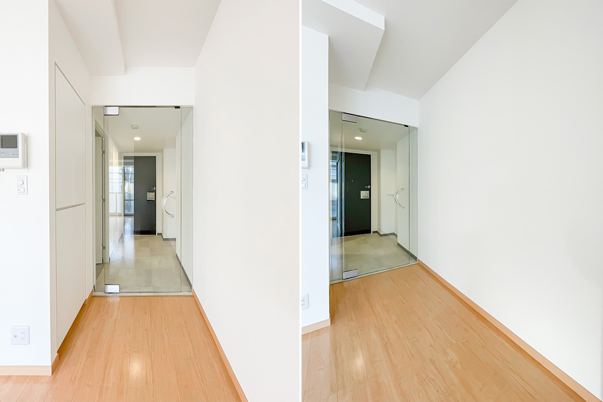 ガラスを多用した扉や靴箱は、美術館や博物館を思わせるデザインです。