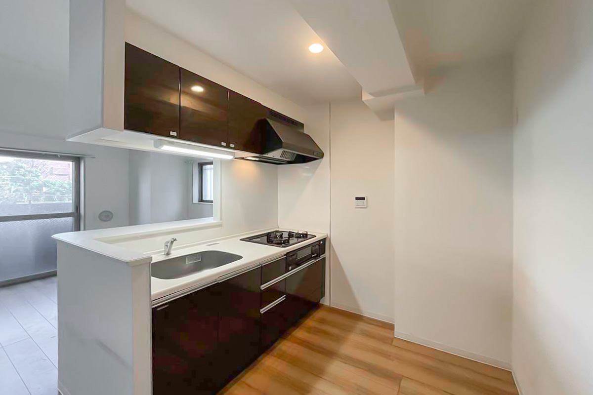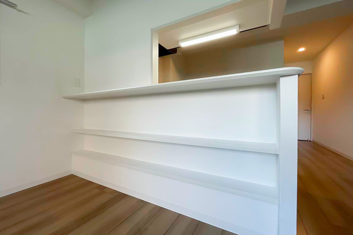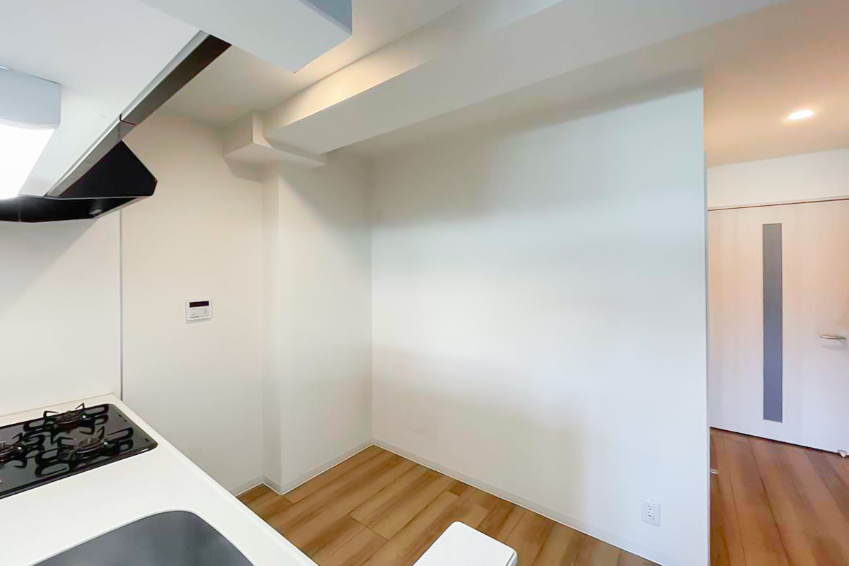 キッチンは3口コンログリル付き。そして自炊派にも嬉しいカウンターキッチン、背面スペースに冷蔵庫+家電ラックや食器棚が配置できるゆとりがあります。