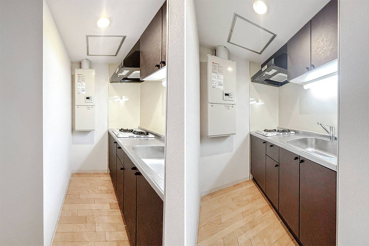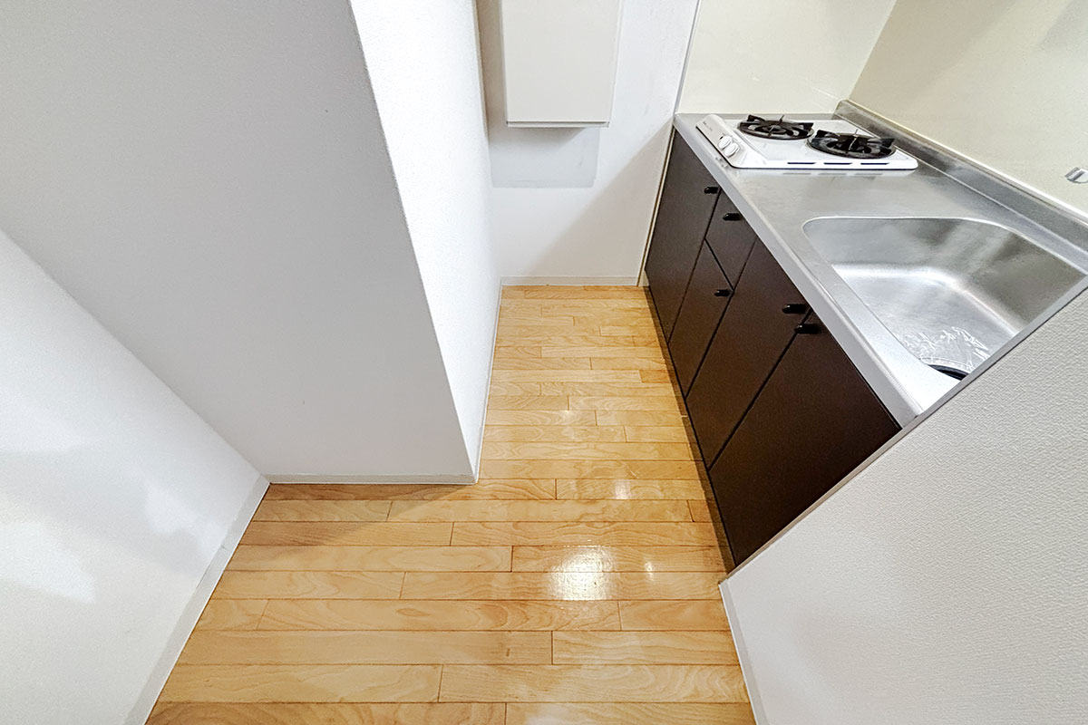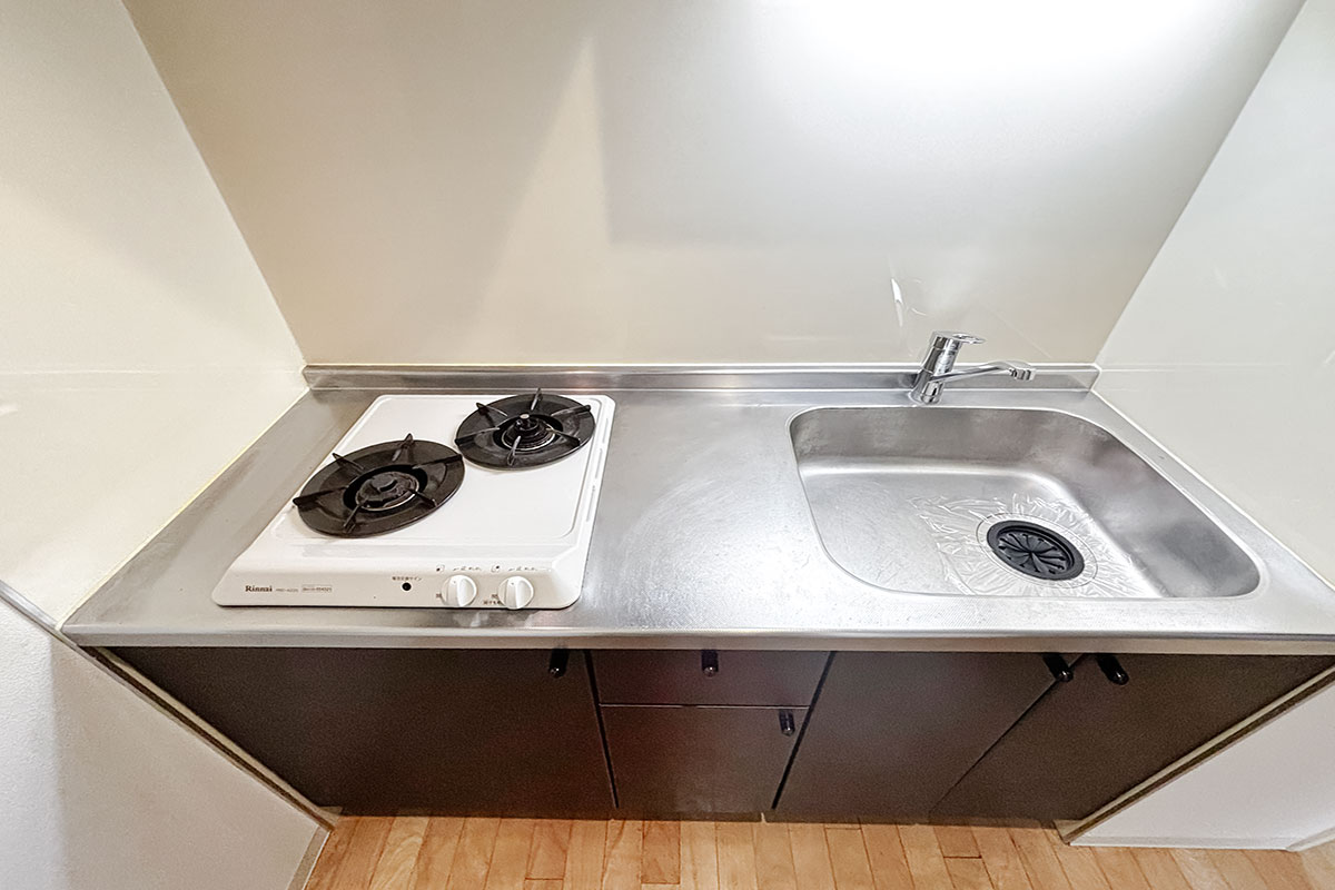 キッチンスペースはややコンパクトながら2口付きで自炊派にも安心です◎