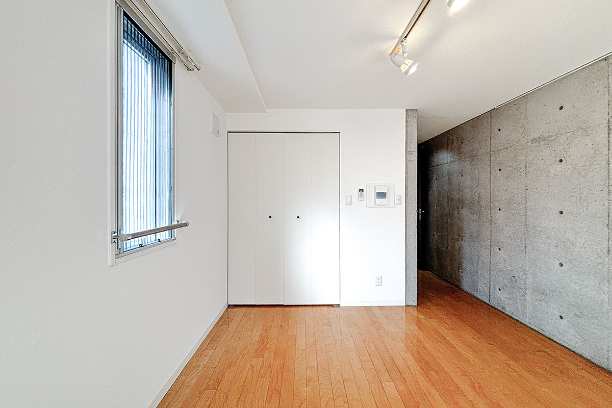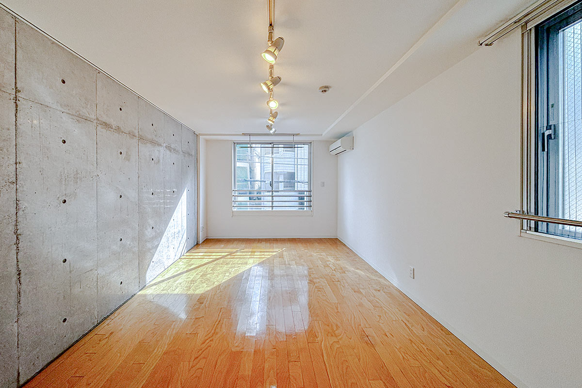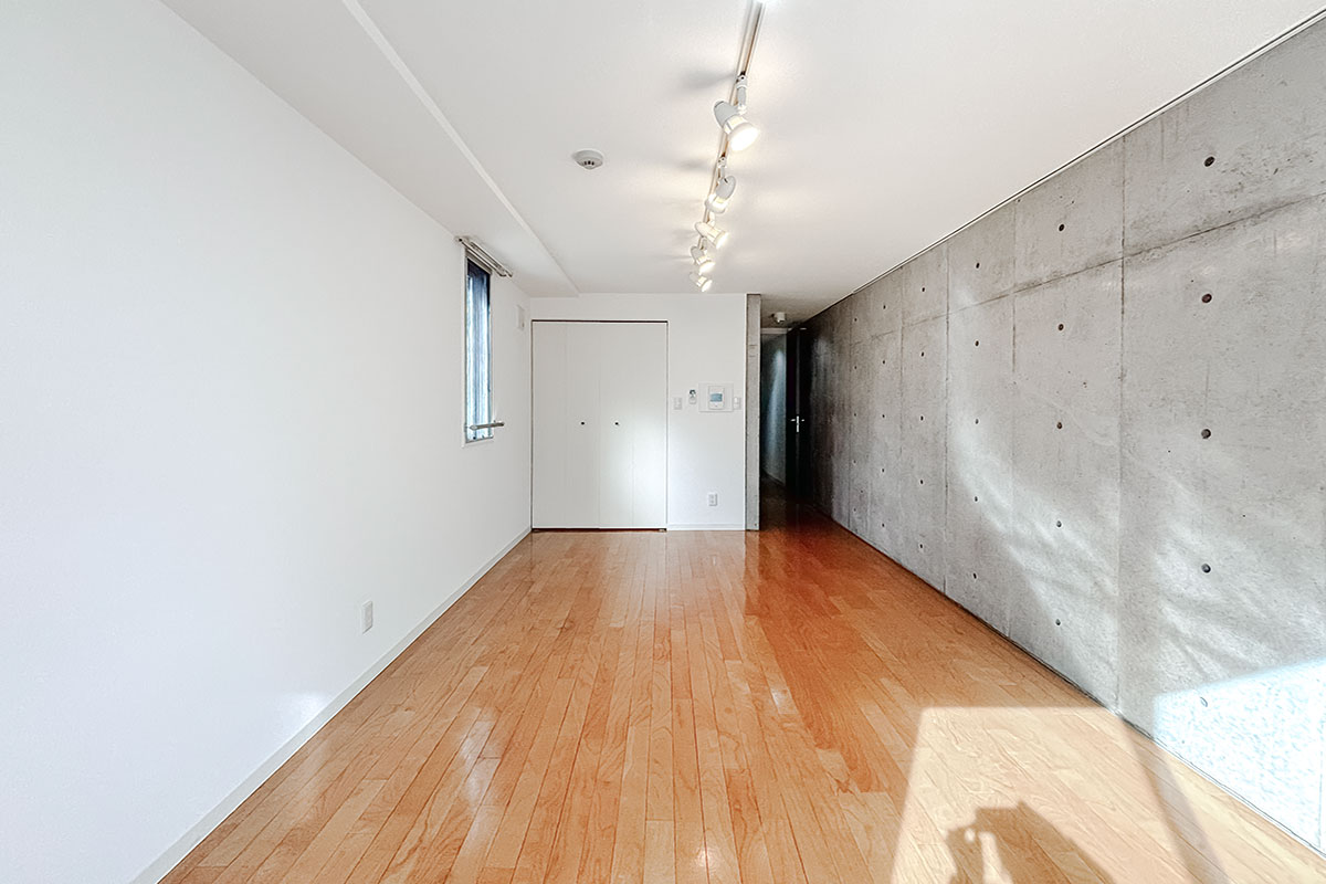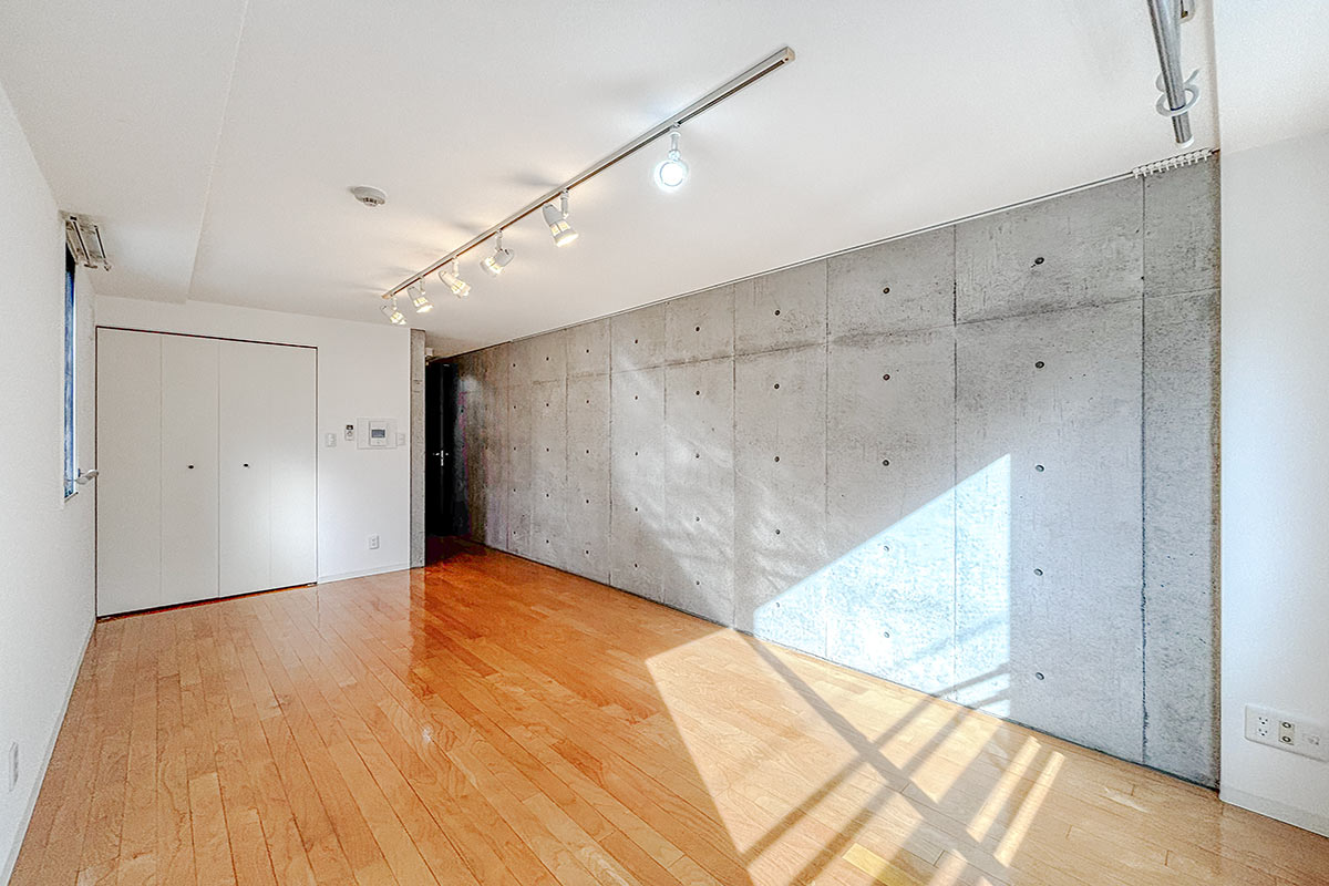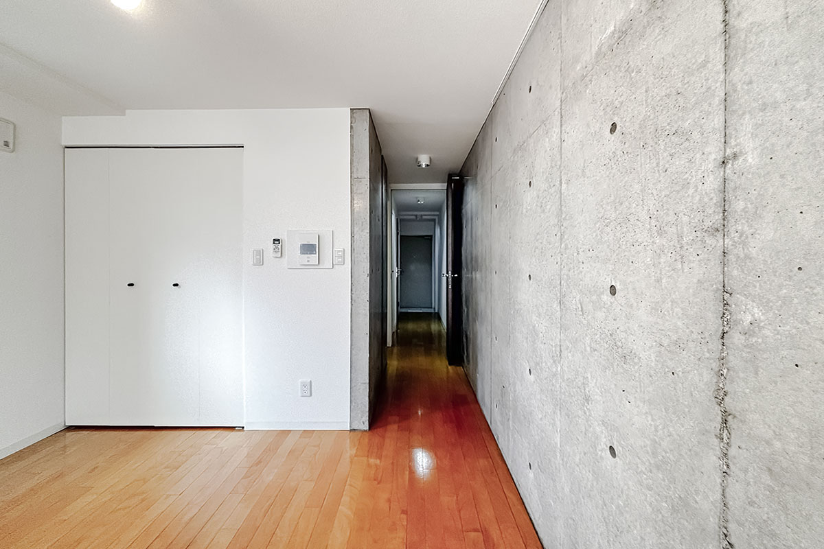 コンクリ壁がスタイリッシュな居室は9~10帖程度はあるでしょうか。