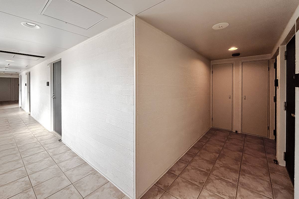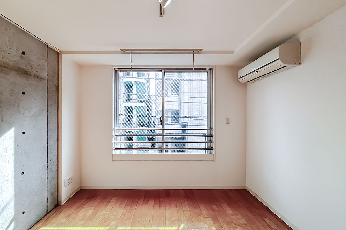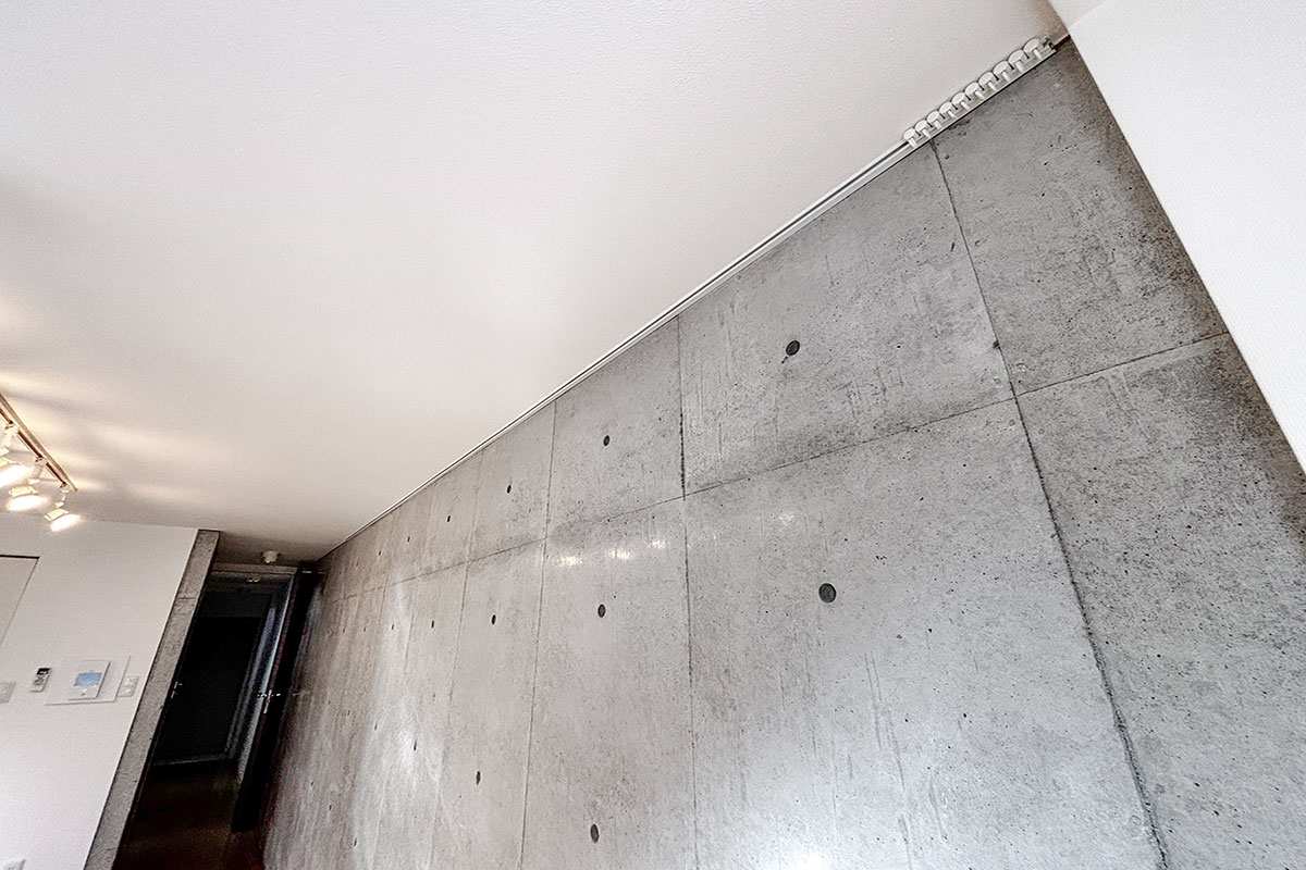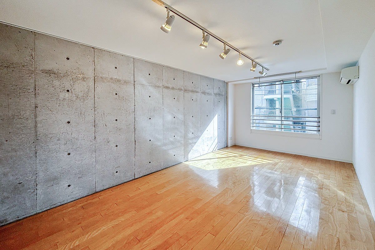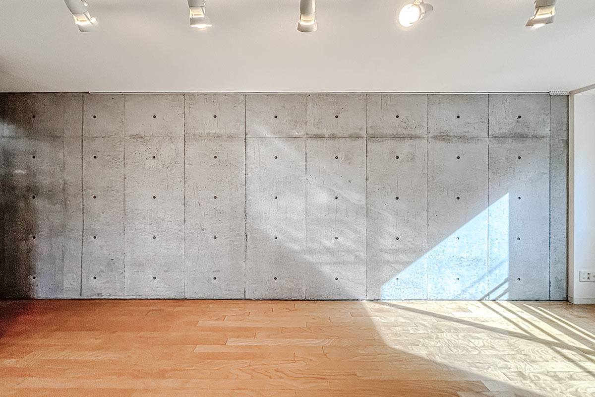 コンクリ壁がスタイリッシュな居室は9~10帖程度はあるでしょうか。