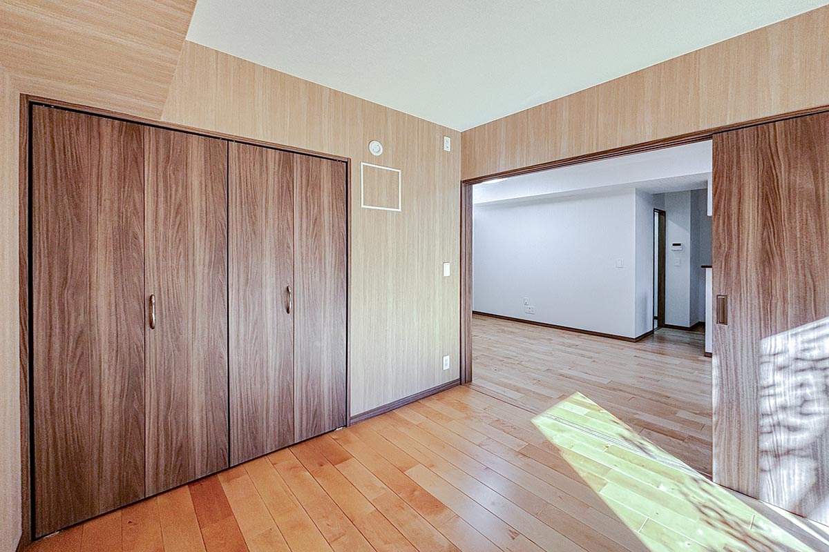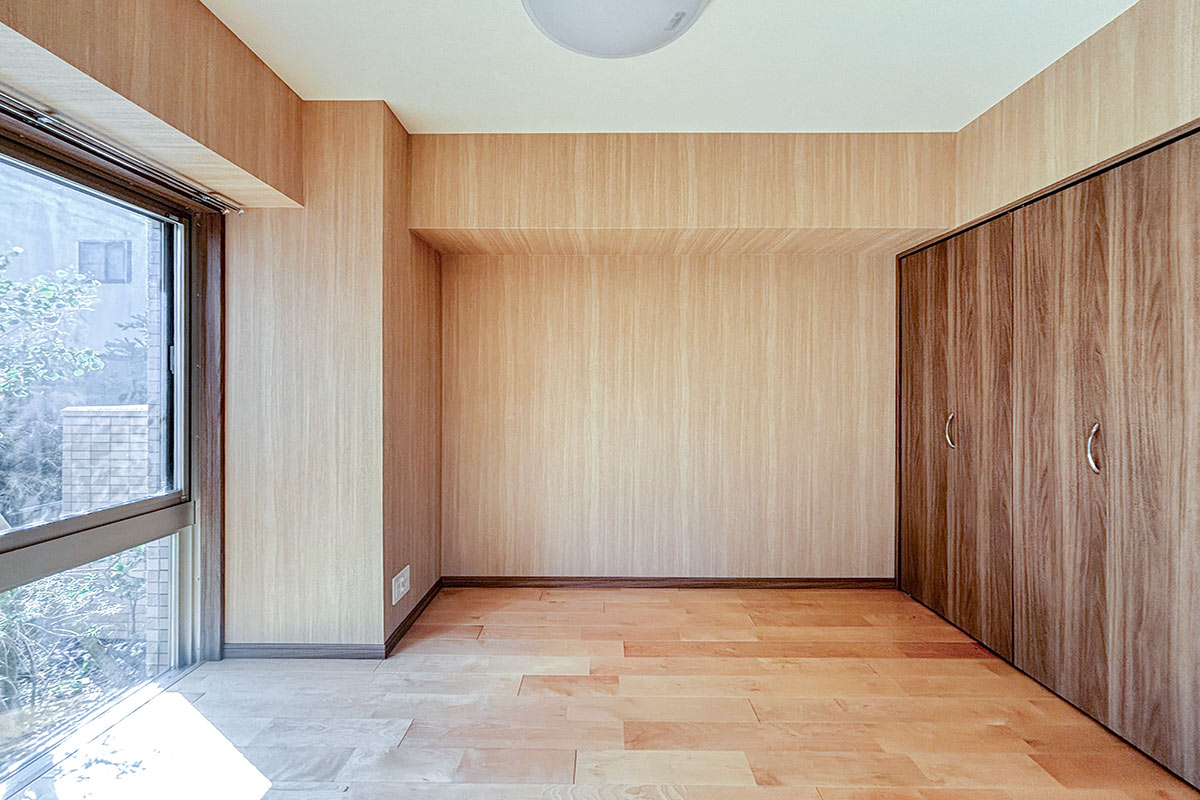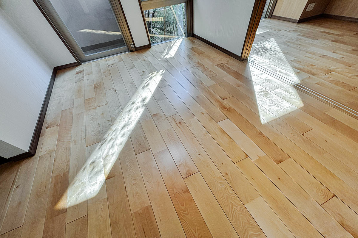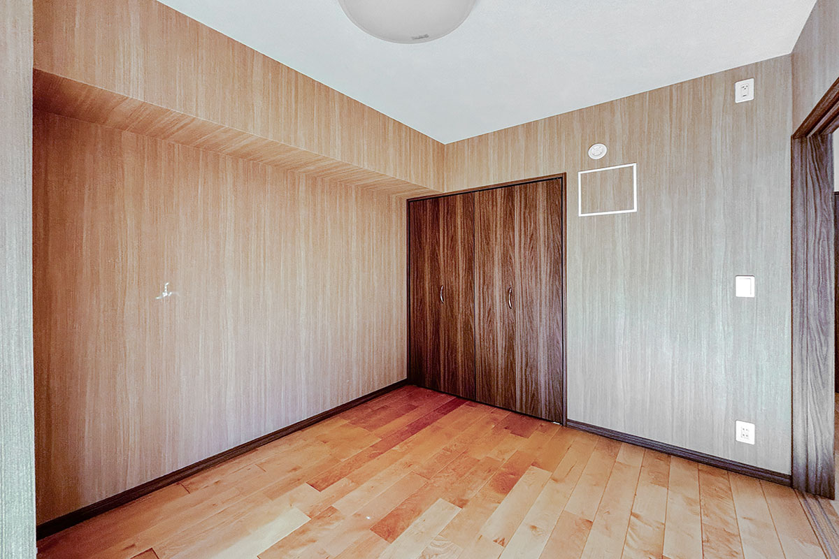 木調のフローリングに、ブラウンや木肌の表情を模したような凹凸あるクロス。