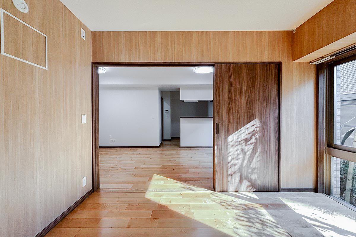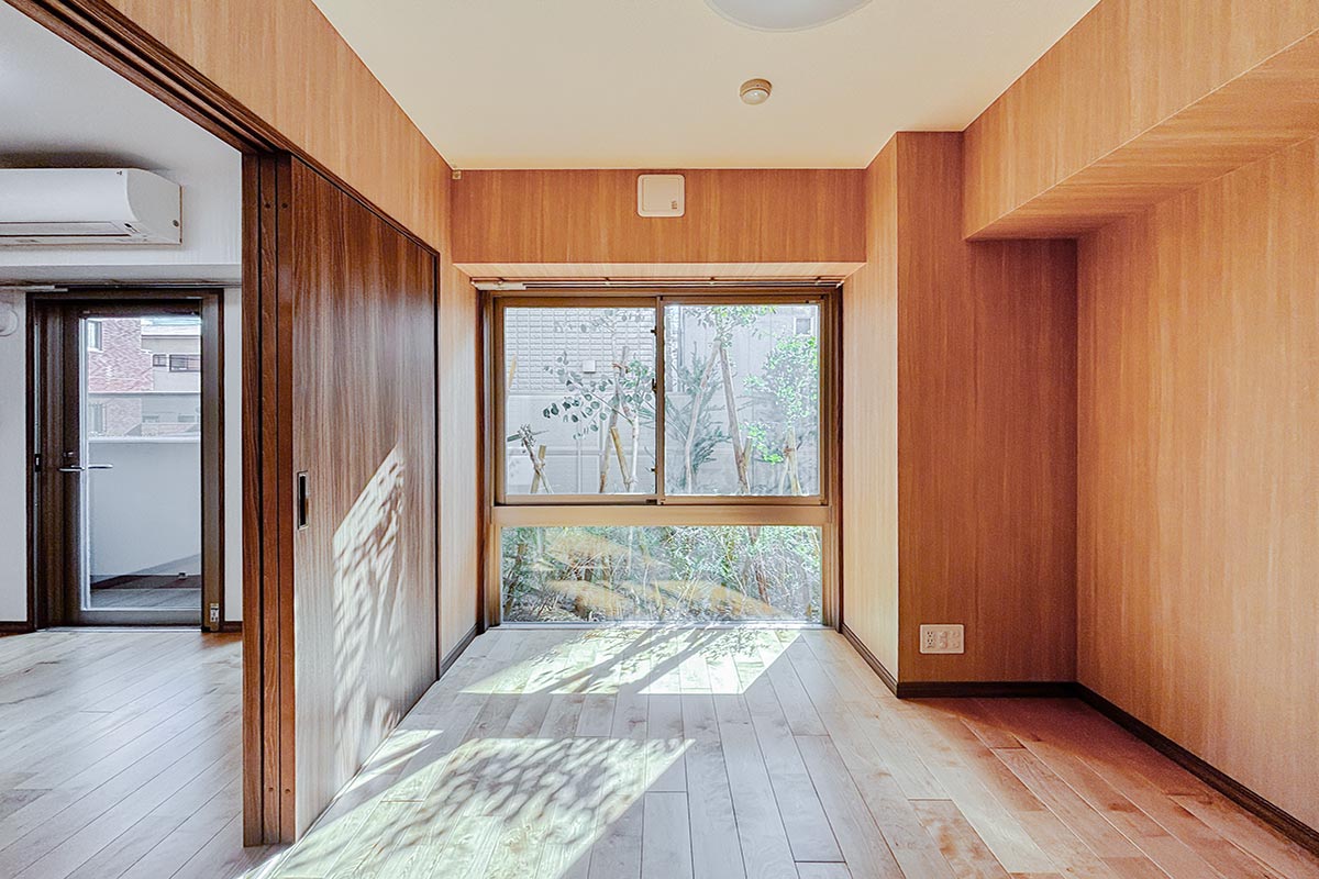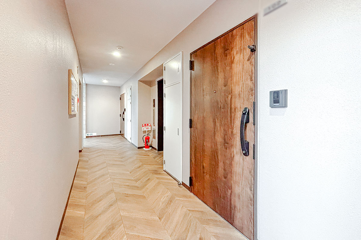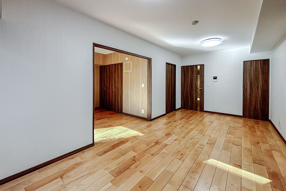 木調のフローリングに、ブラウンや木肌の表情を模したような凹凸あるクロス。
