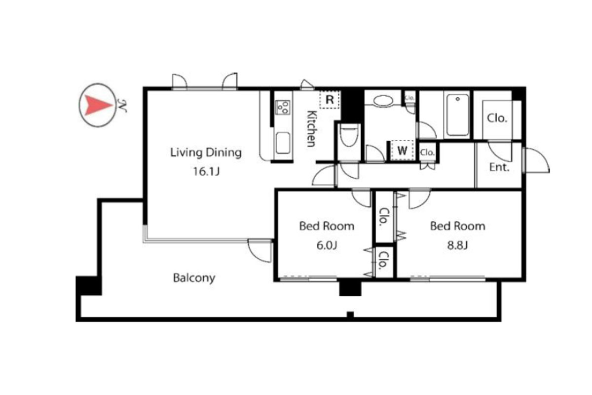 室内は約80㎡、全室がバルコニーに面した2LDK。