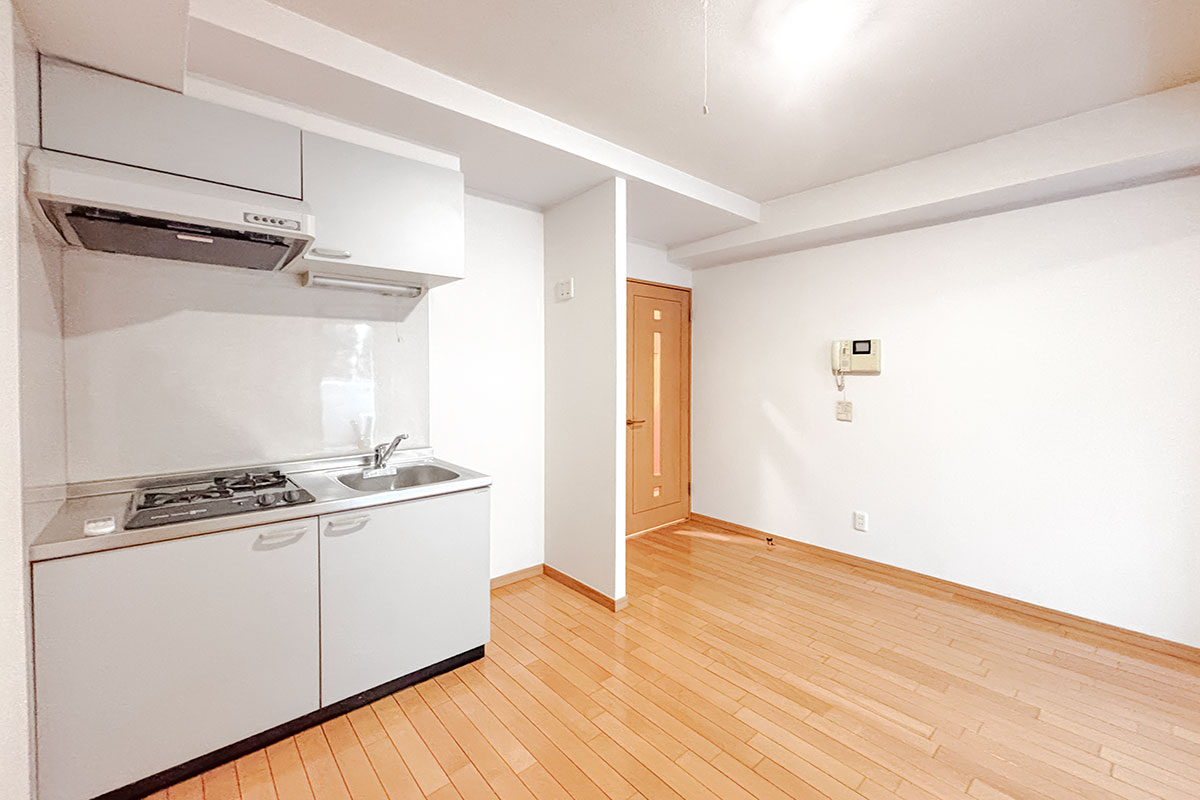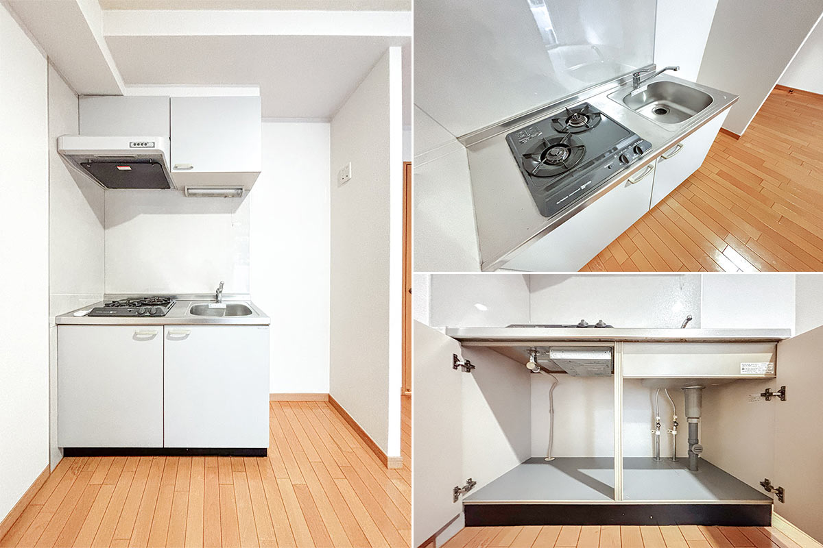 キッチンは2口、作業スペースはコンパクトなので自炊多めの方は補助スペースを設けるとよさそう。