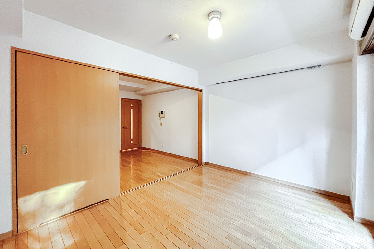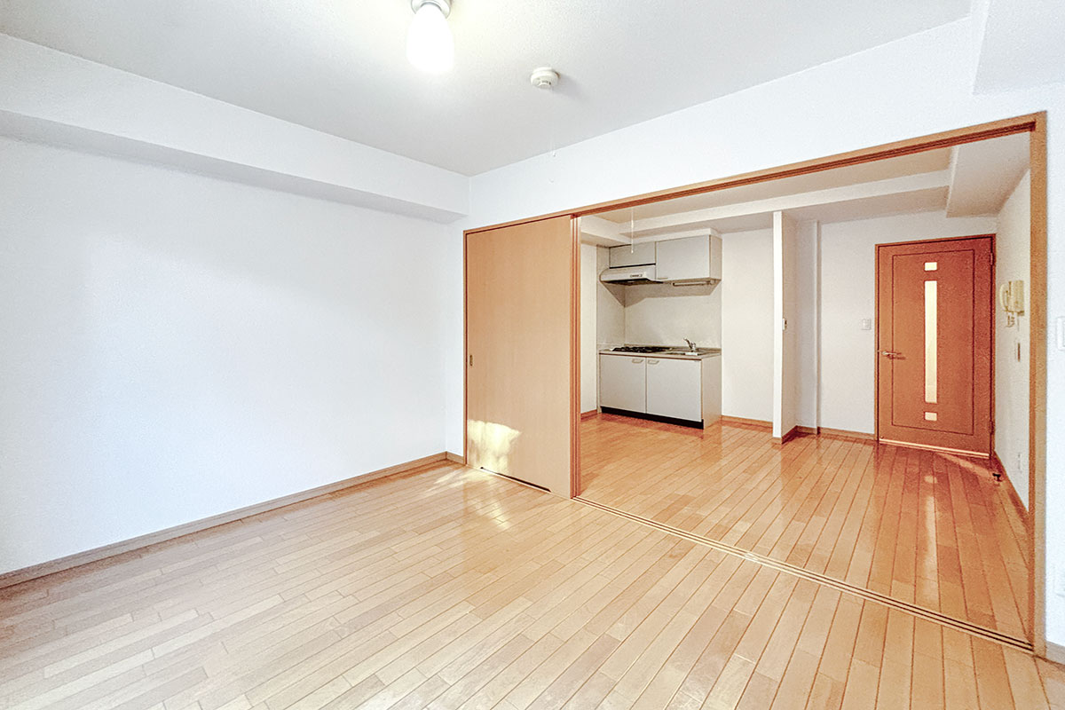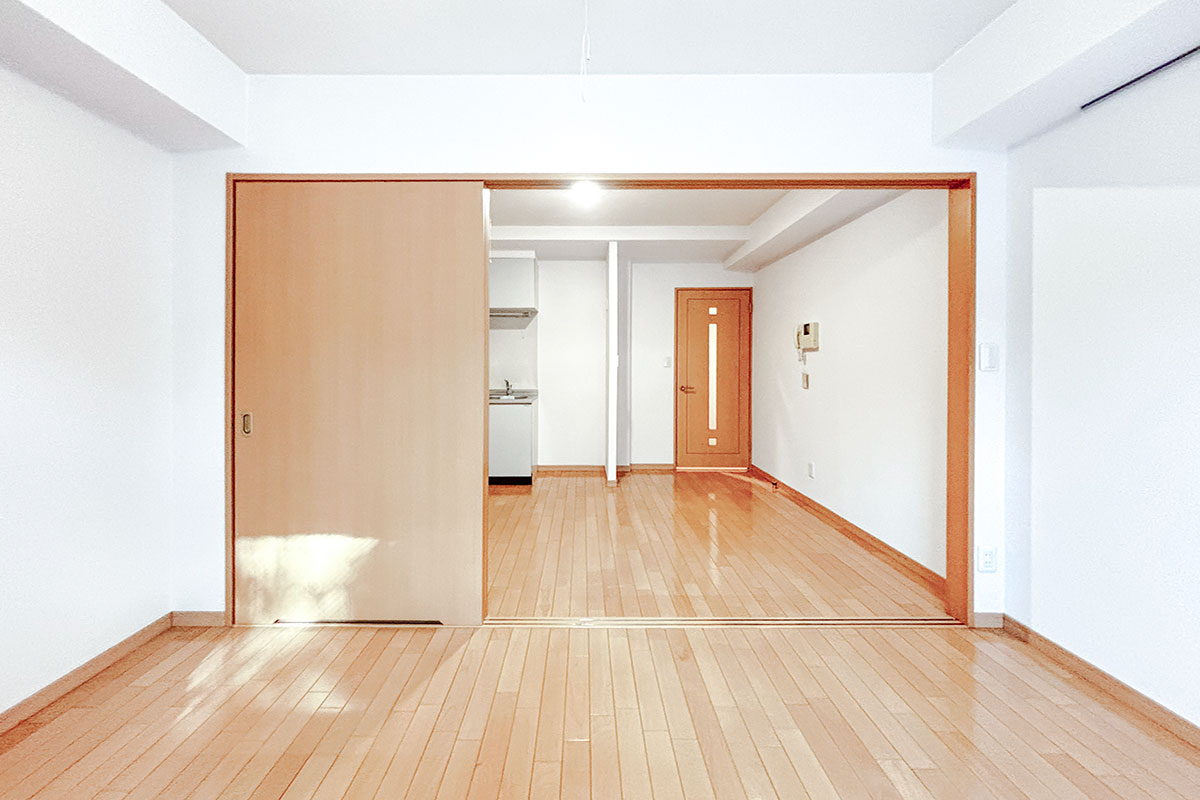 ドアの開閉で寝食を分けることができ、約13帖のワンルームとして使っても◎