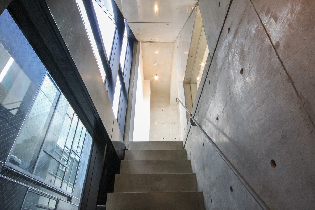 2007年築のデザイナーズ物件で、シックな外観です。オートロックを抜けると、武骨な雰囲気の共用部分。