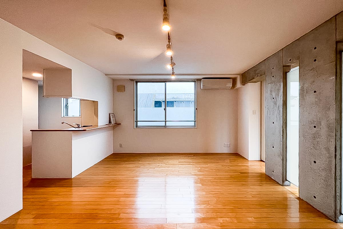 室内の内壁はコンクリートと白壁。大きめの腰窓が南北と西の3方向あるので日当たりも風通りも期待できそうです。