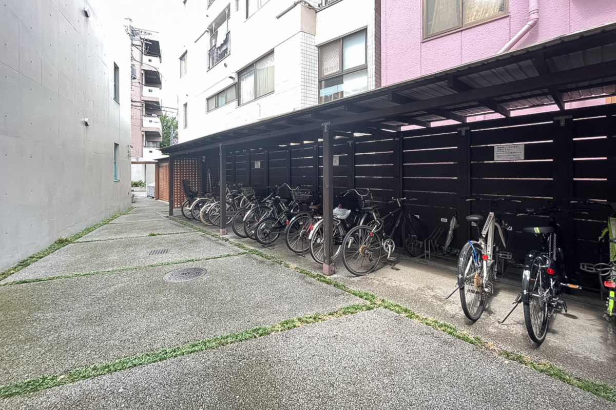 建物を1周囲う形で駐車場が点在しており、駐輪場と宅配BOX、ゴミ置場はエントランスのすぐ裏に。必要な設備がキュッとまとまっています。
