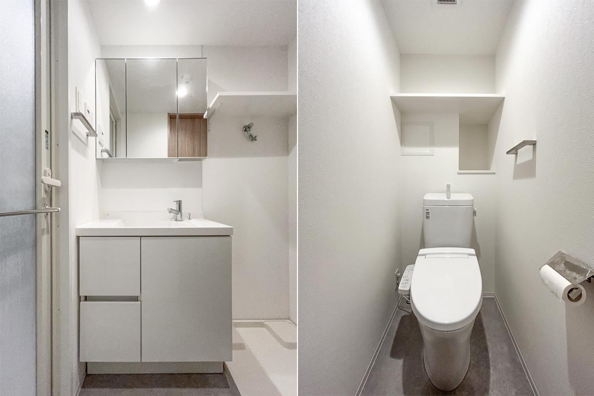 中は可動棚で、傘収納のスペースも設置。入口横には姿見も。