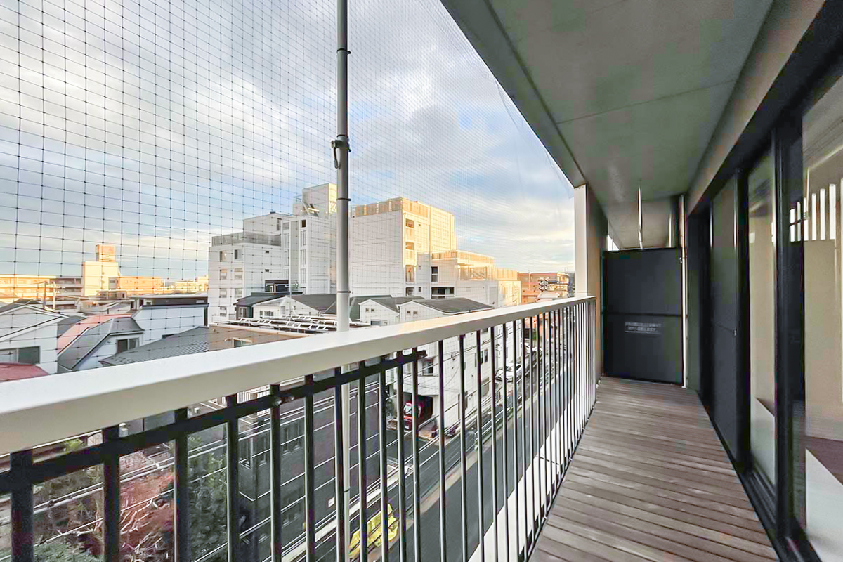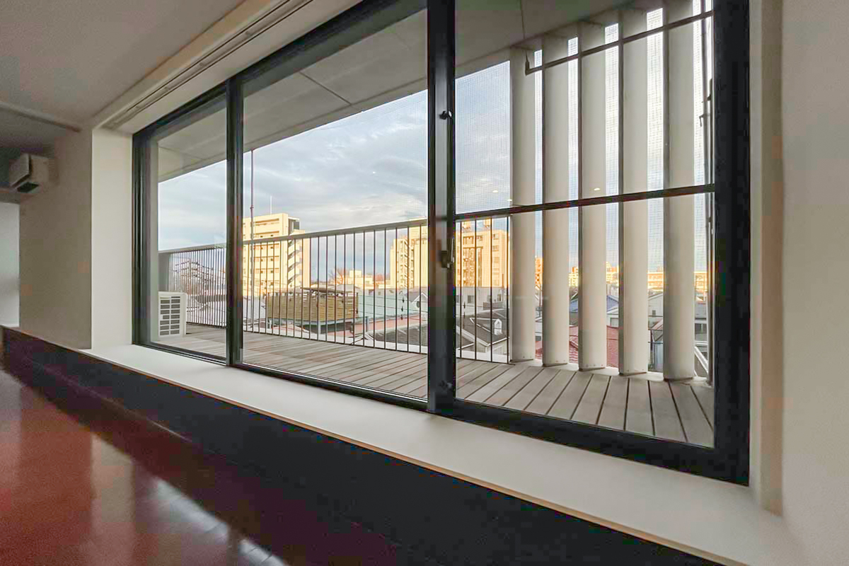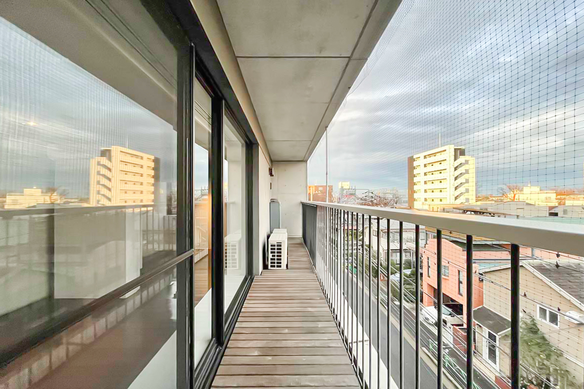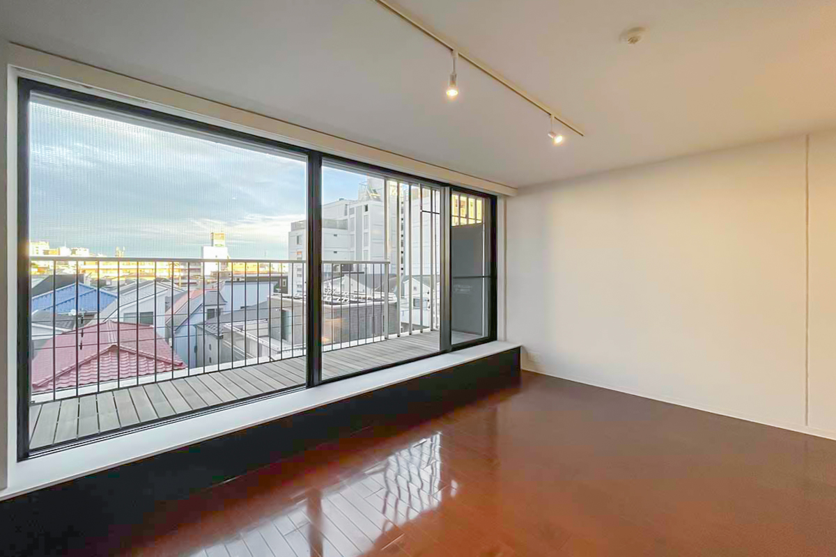 LDKは11.6帖。窓辺の腰掛けとウッドデッキのバルコニーが奥行きを演出し、天井まである大きく幅広の窓が気持ち良く光を取り込みます。