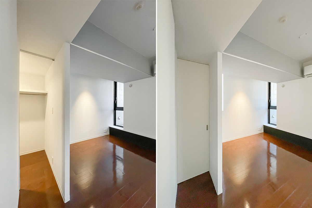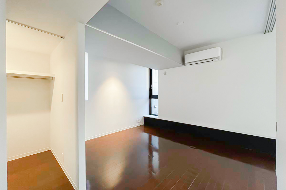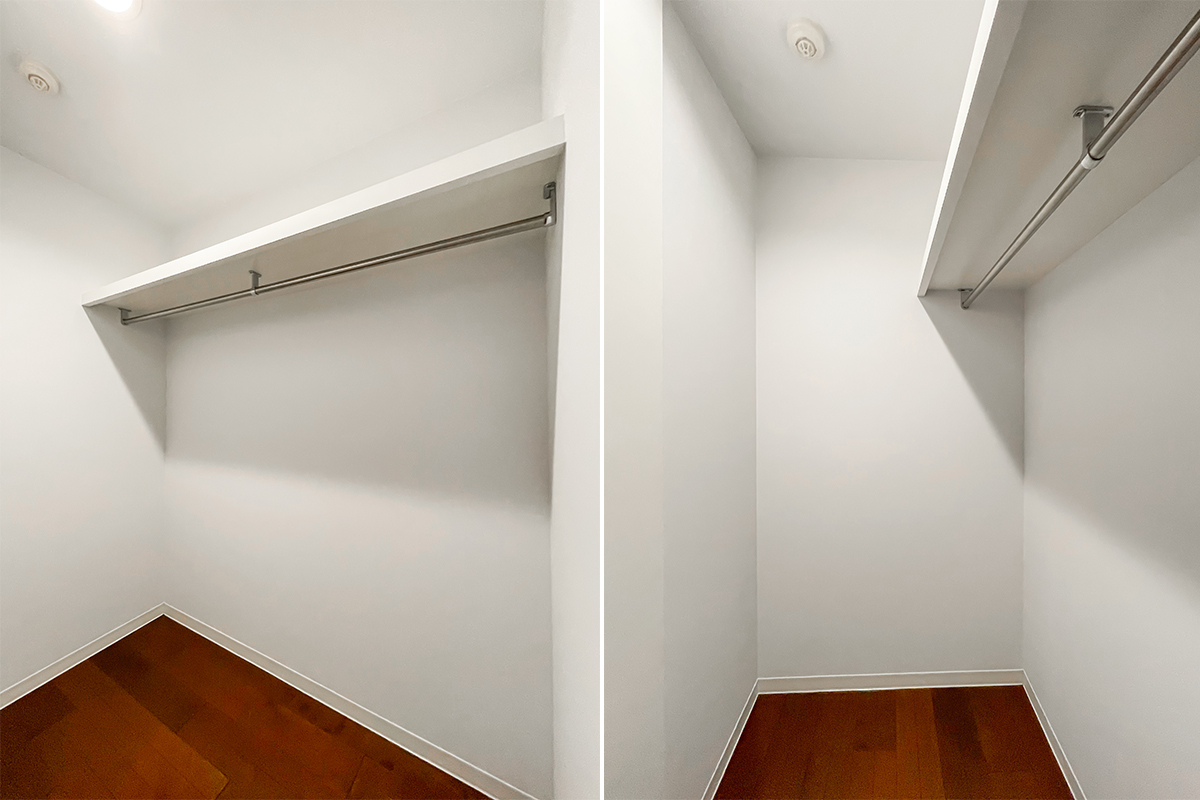 ベッドルームの隅にはウォークインクローゼットもあり、安心の収納量!