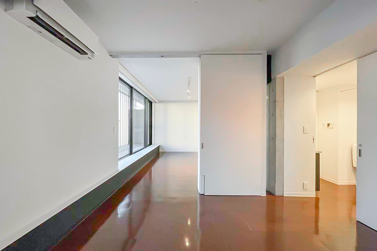 間取りは1LDKですがスライドドアを開けると、ワンルーム使いにもでき、回遊できる一体のお部屋。