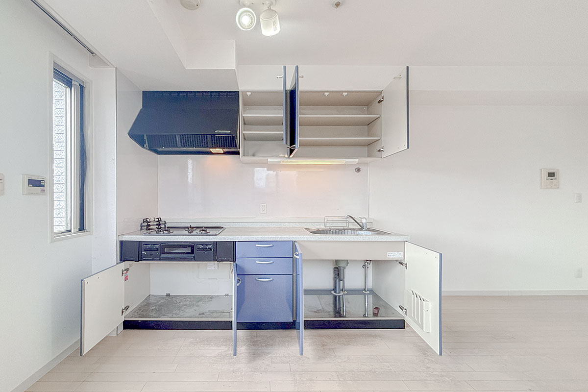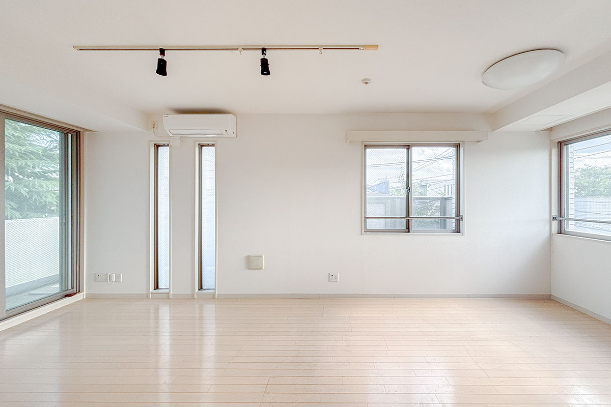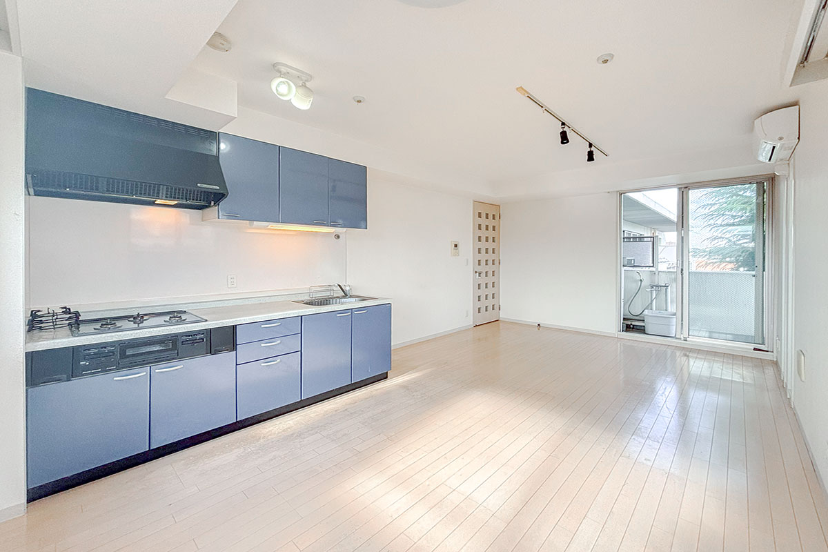 バルコニーから緑を臨むリビングは約12帖、壁付キッチンですっきりと空間を使うことができます◎
