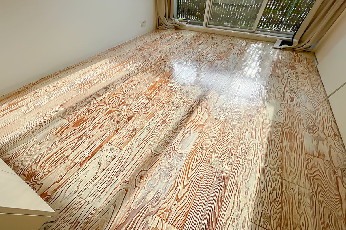 玄関からお部屋までタイル床の土間、それから木目フローリングの居室へと変わります。段差はなく床材で空間を分けています。