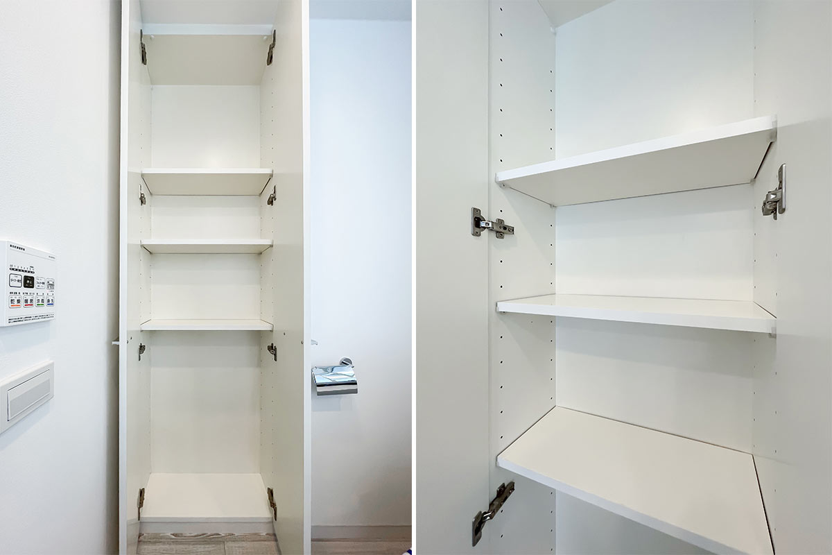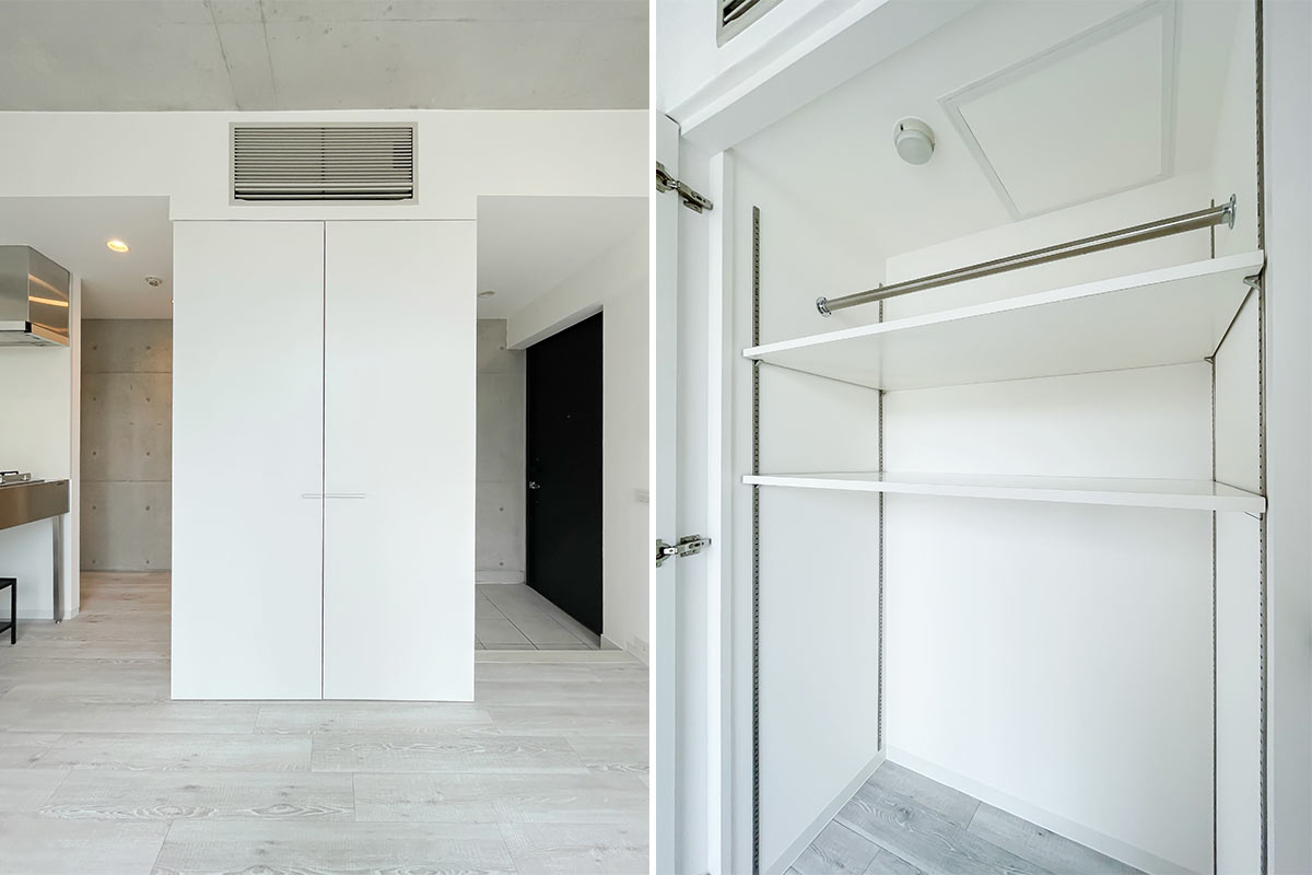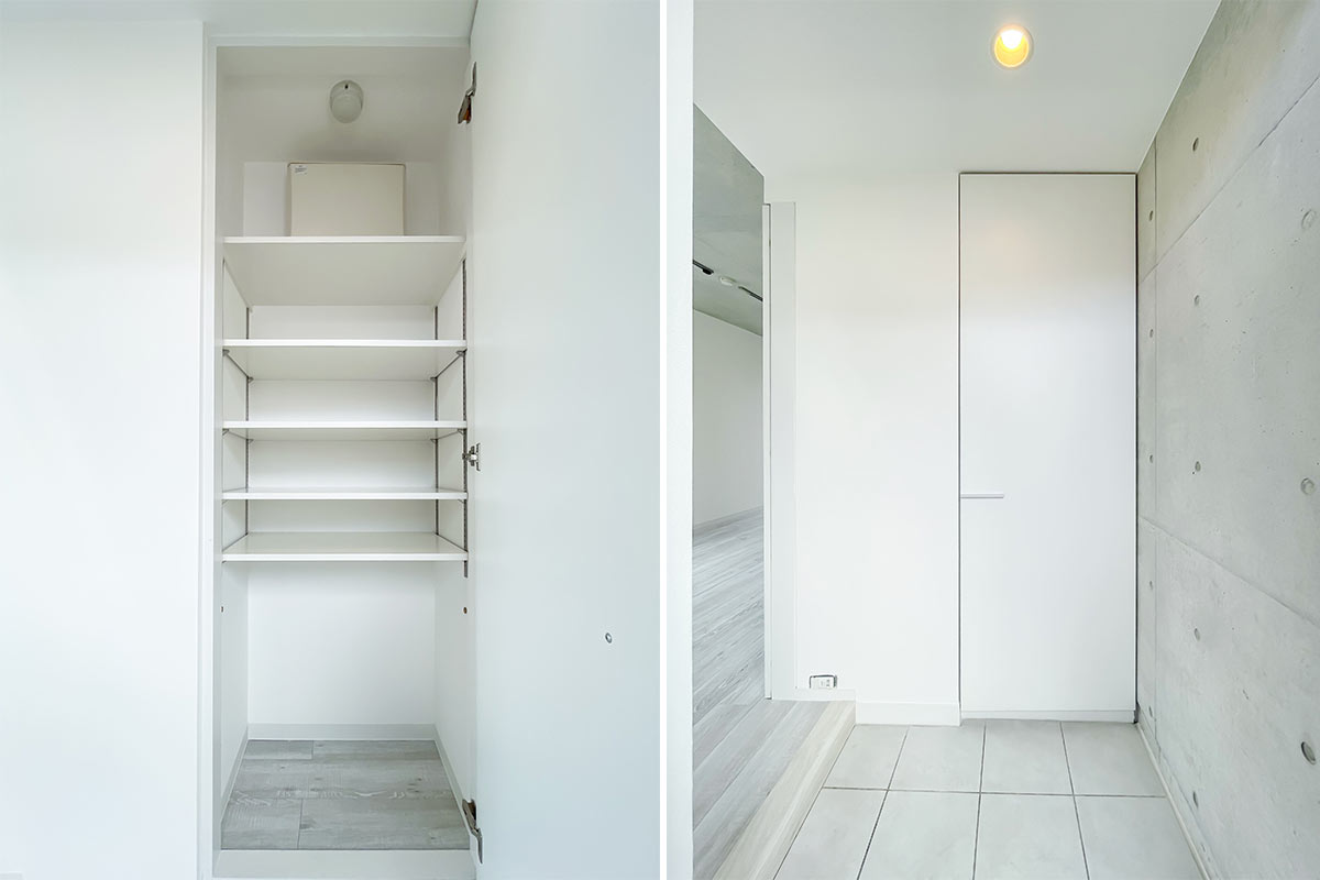 玄関・居室・洗面所それぞれに大きな収納も備え付け。