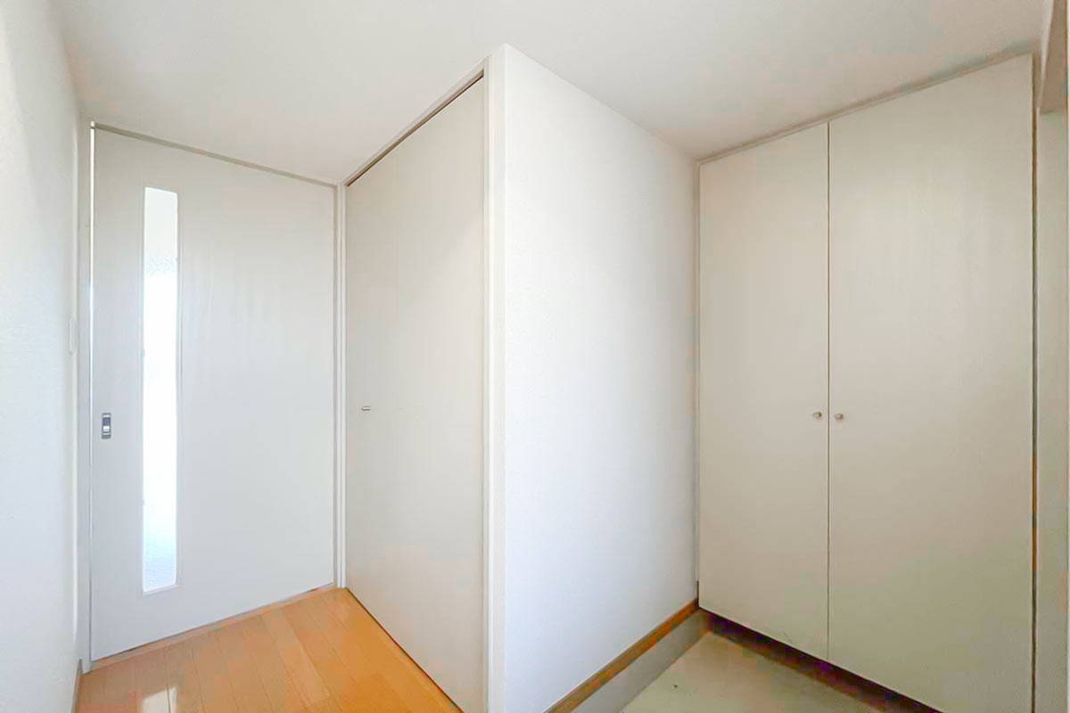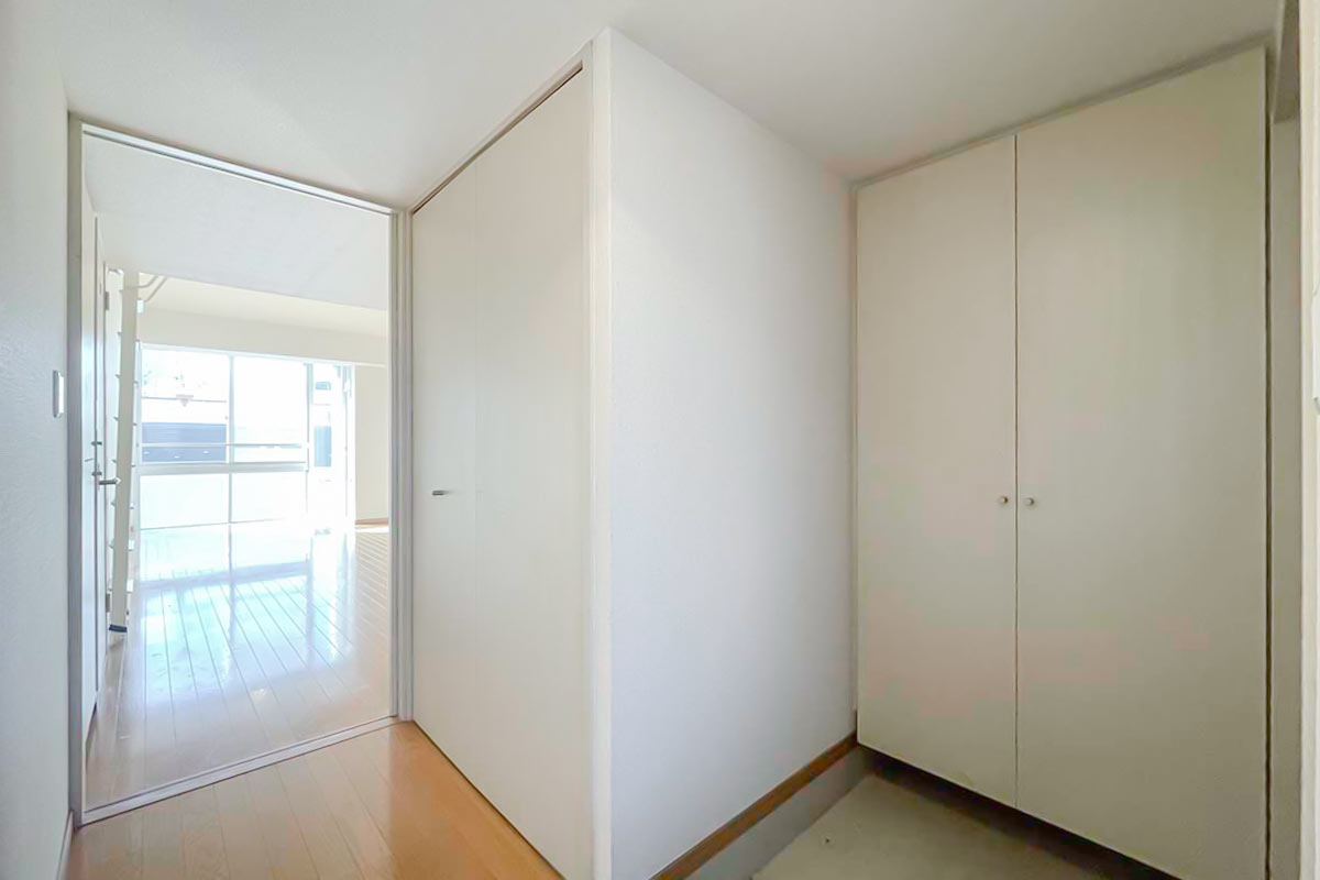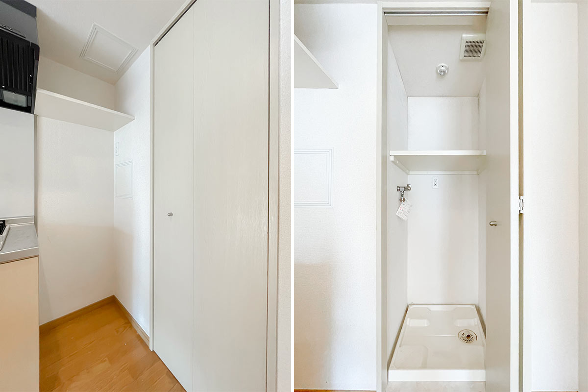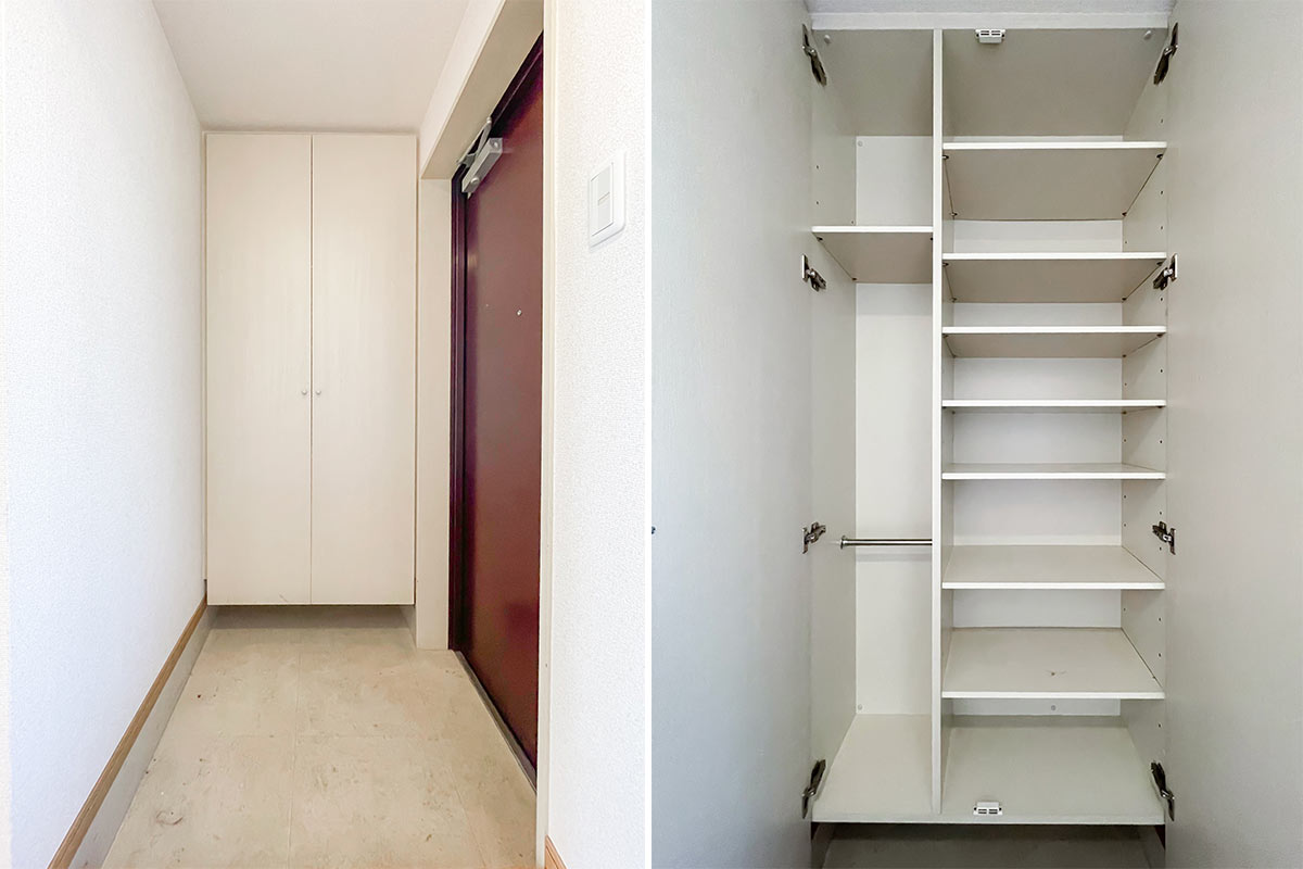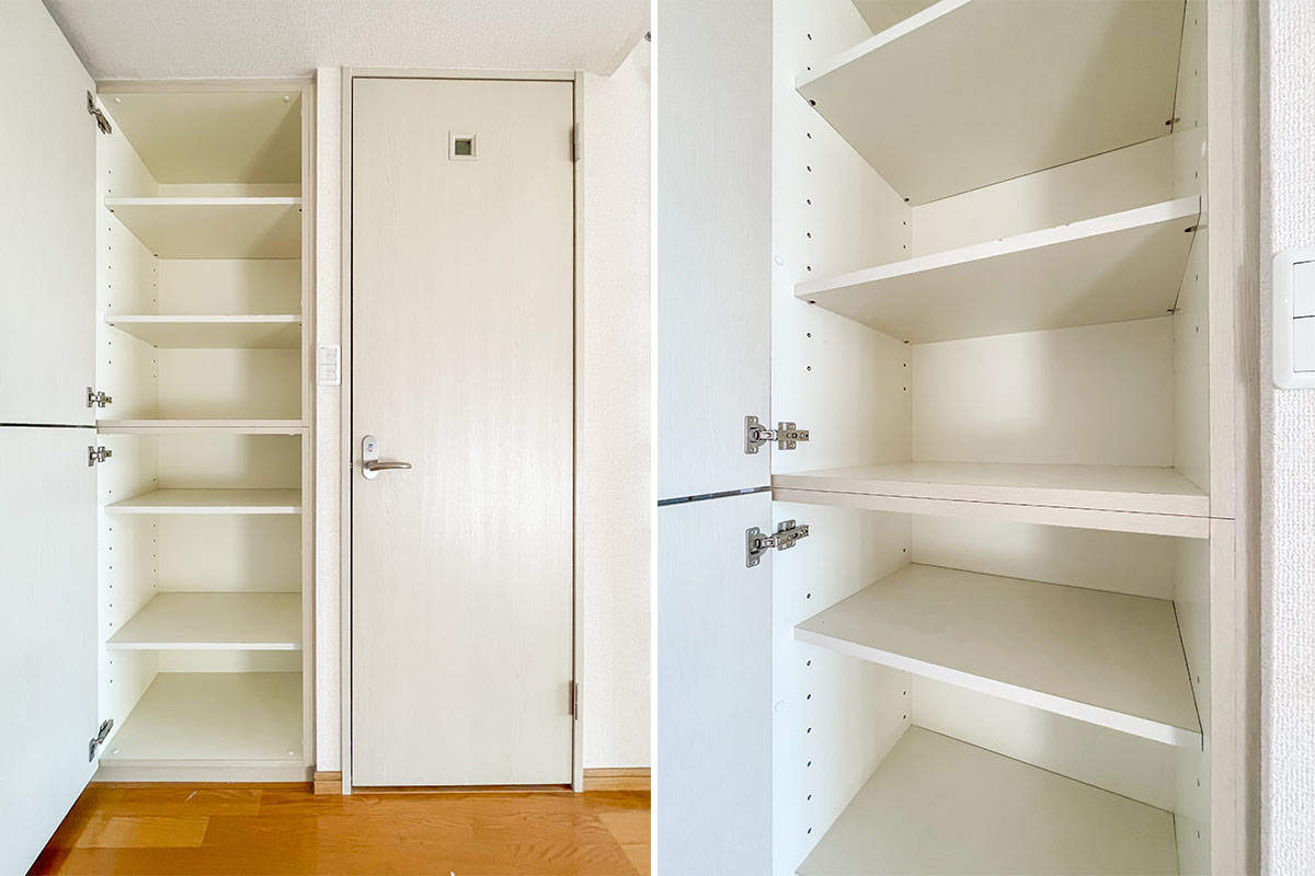 靴箱や居室内(洗面所入口横)の棚収納もたっぷり。
