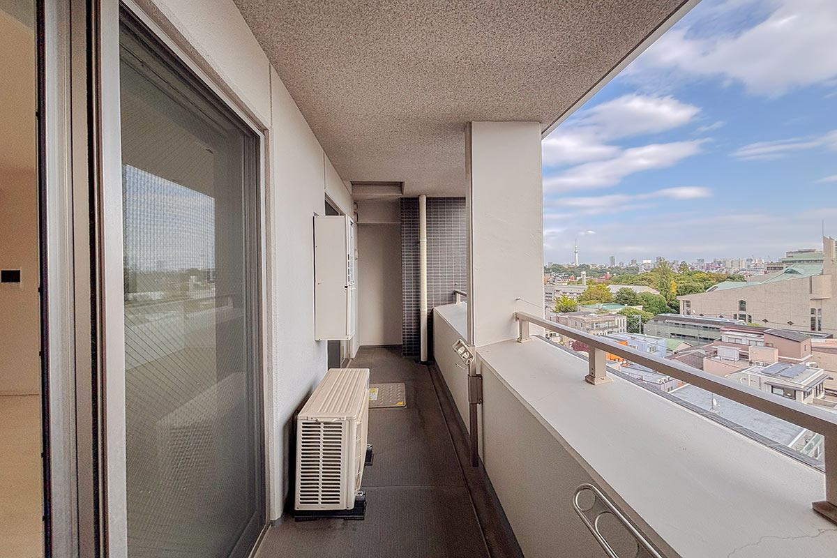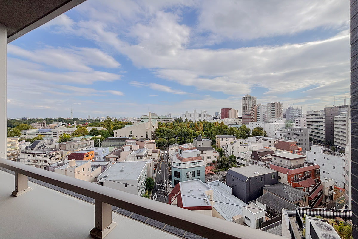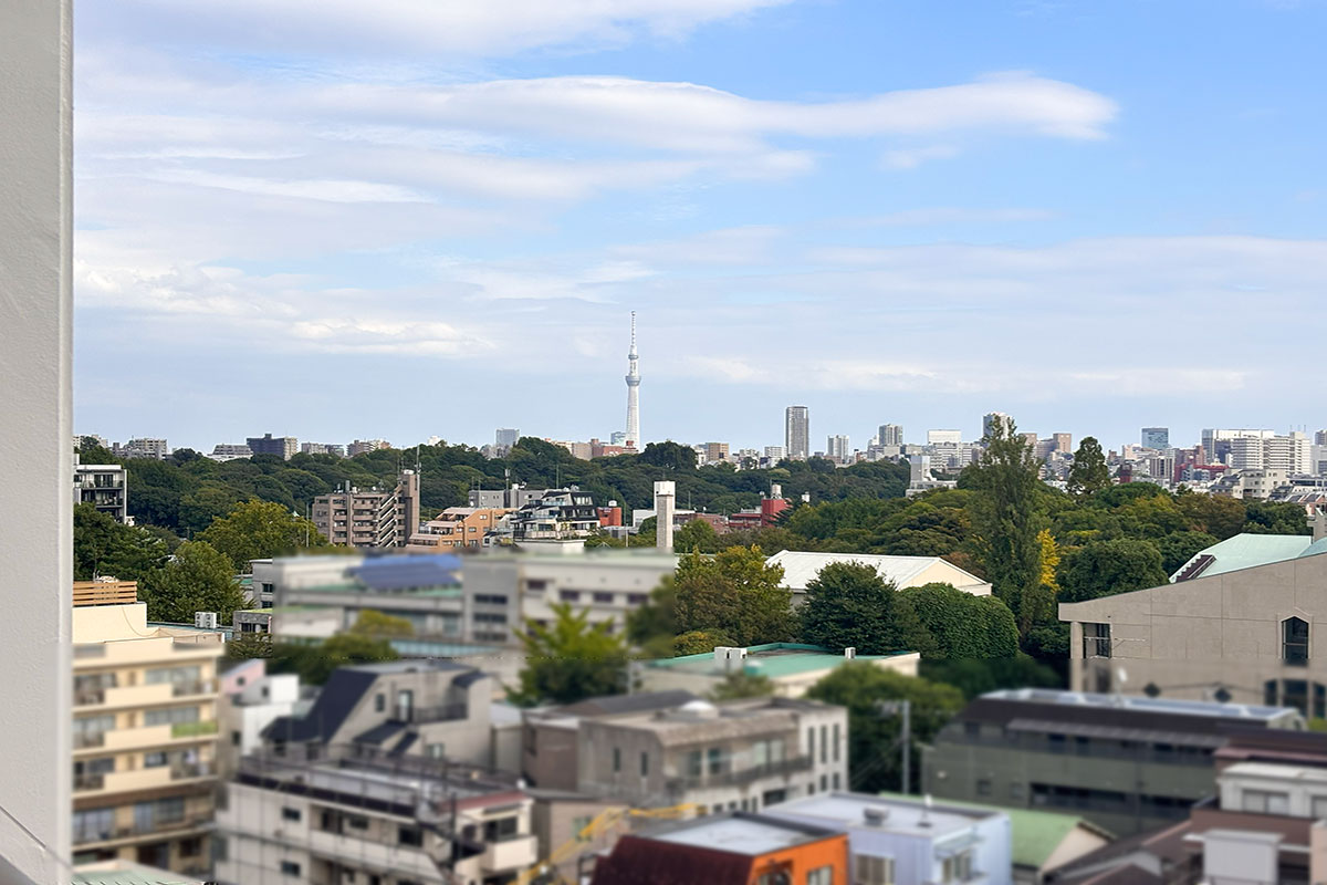 正面には公園敷地内の樹々の緑、左手にはスカイツリーが綺麗に臨めます。