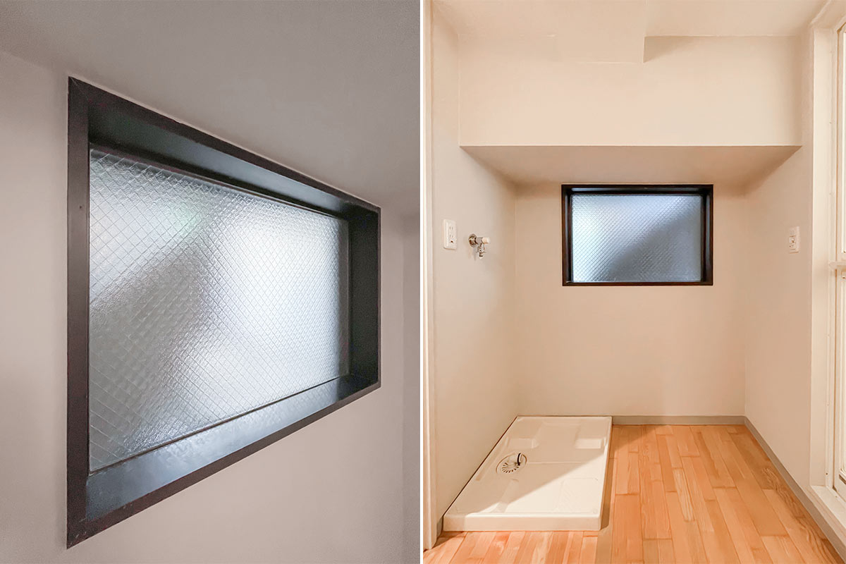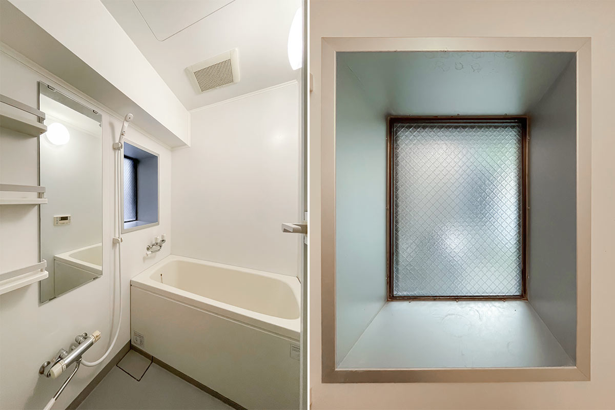 キッチンと同じくタイル張りの洗面台も可愛らしいです。洗面所はゆったりとしており、洗面所も浴室も窓付き。取材時は通電しておりませんでしたが、十分明るく感じました。