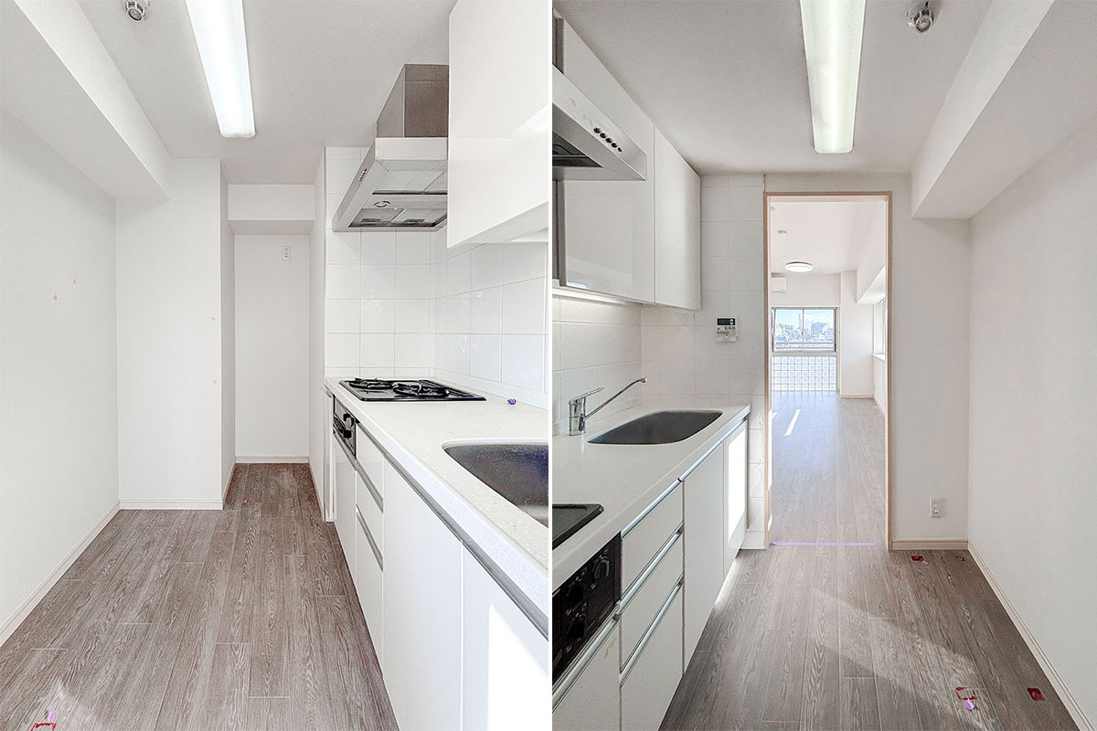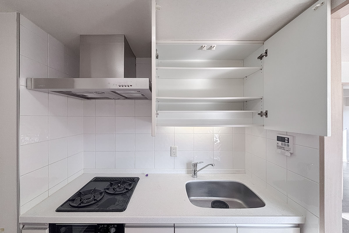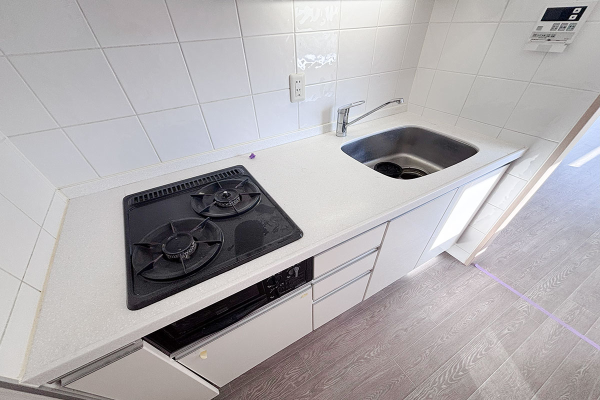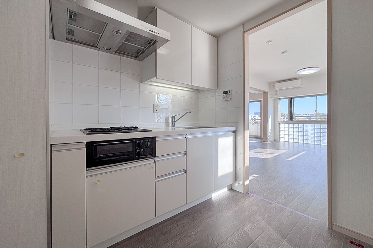 キッチンは半独立空間のため、リビングへの生活感を控えめにできる仕様。