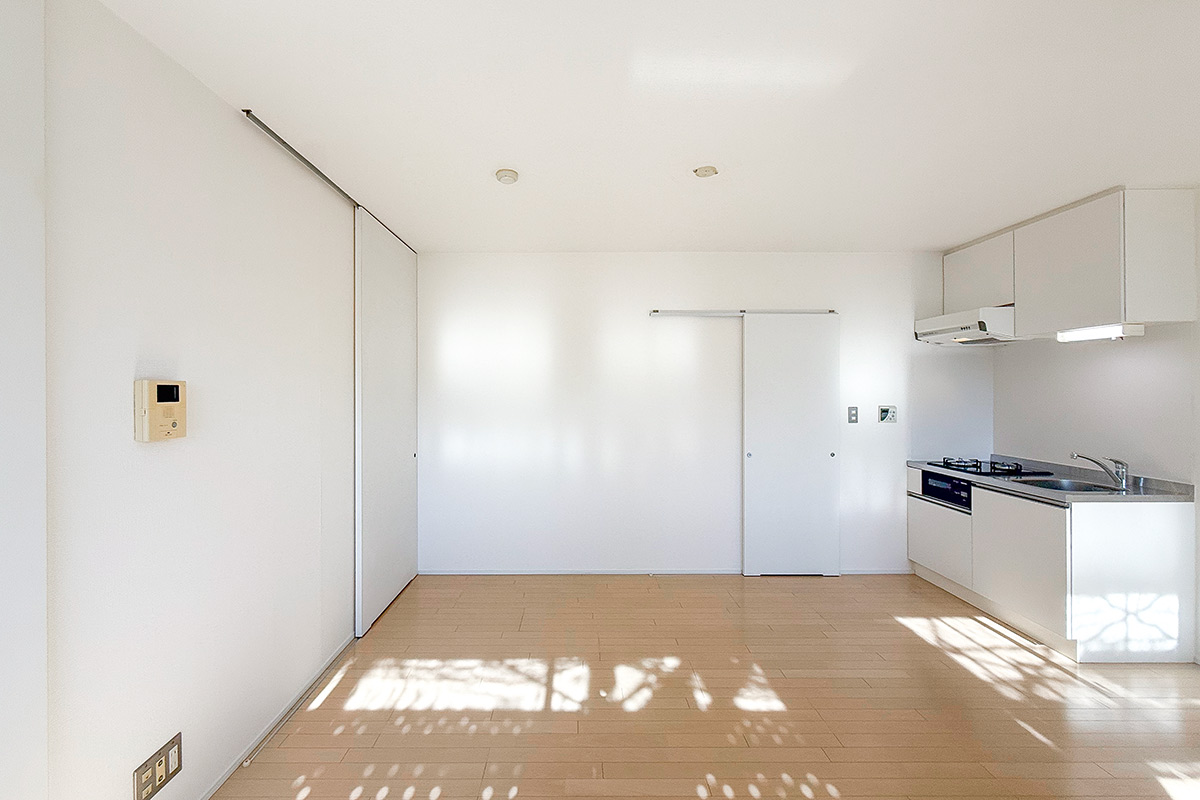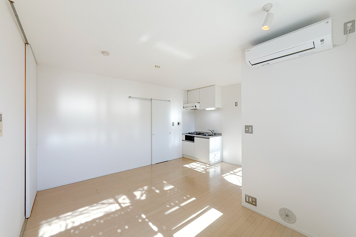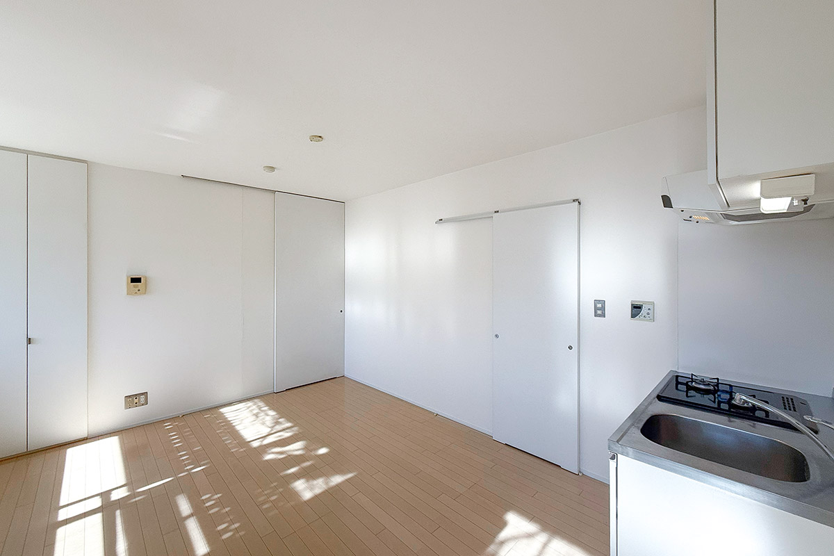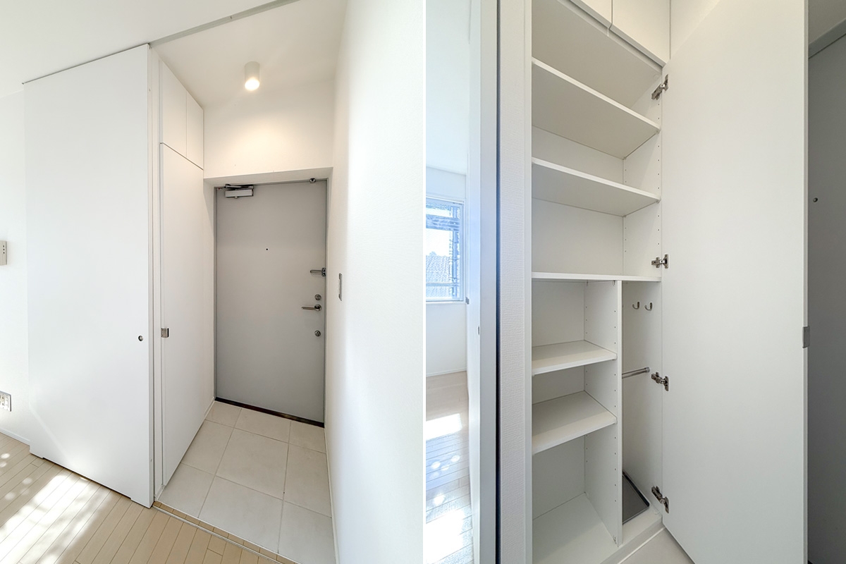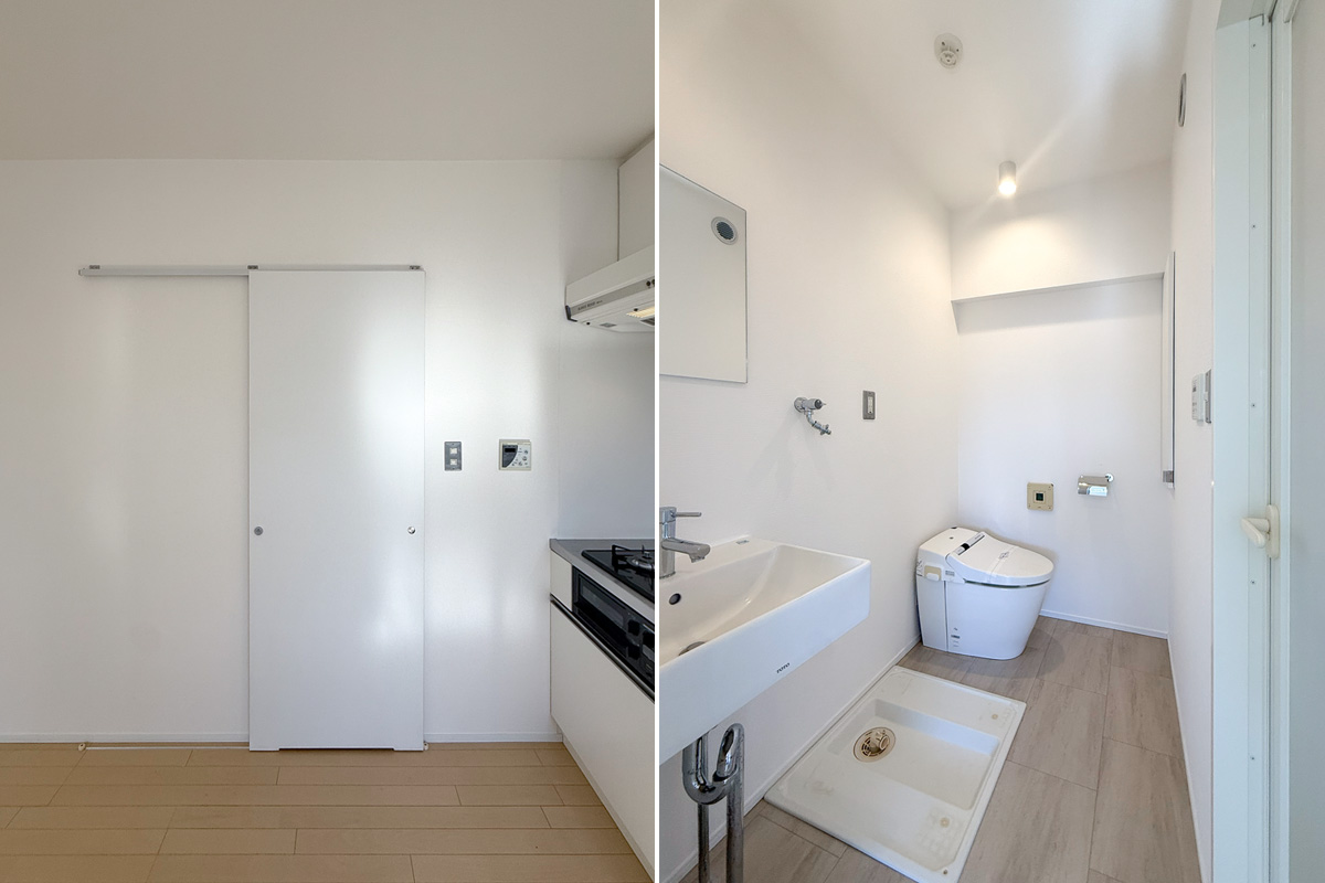 玄関は居室の間にスライドドアがあり、ワンルームでも来客時の目隠しができる嬉しい設計◎