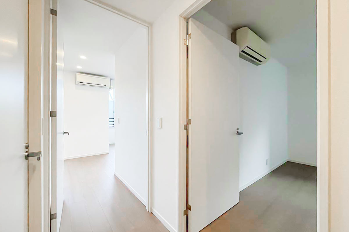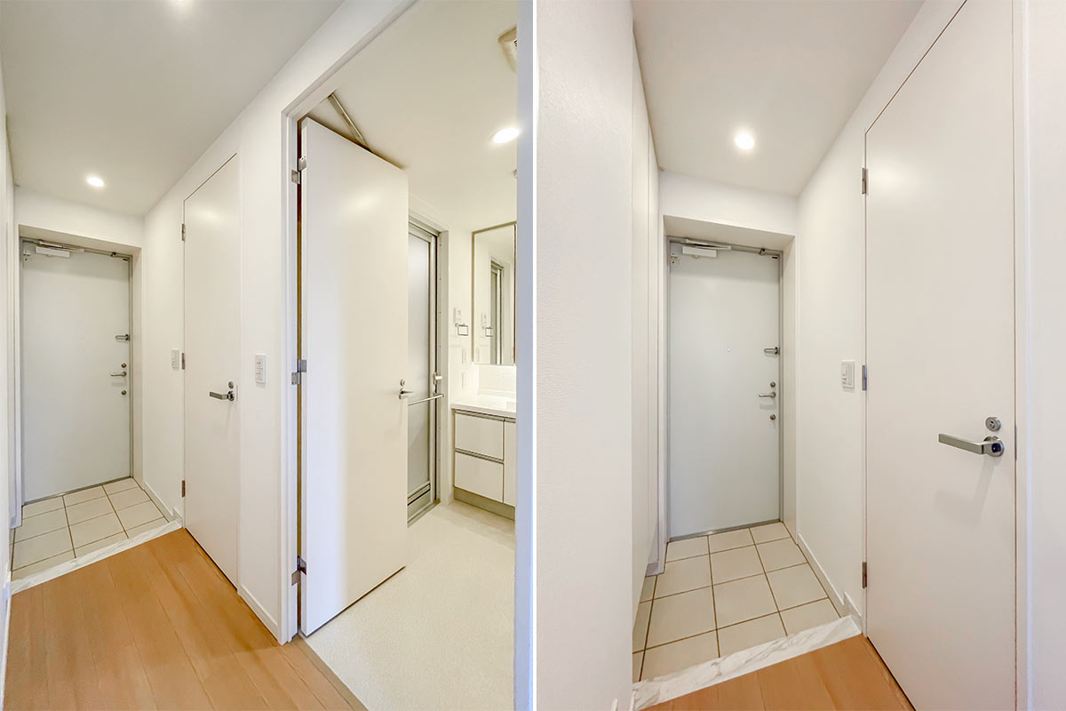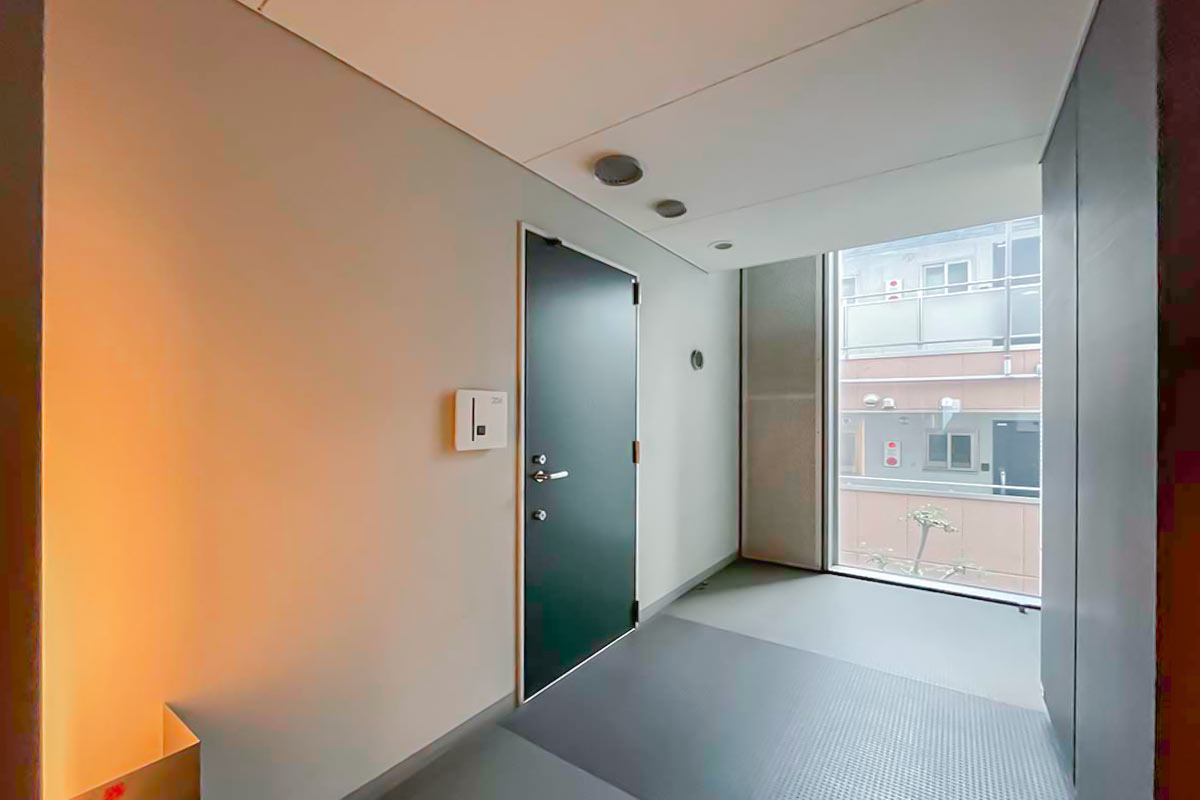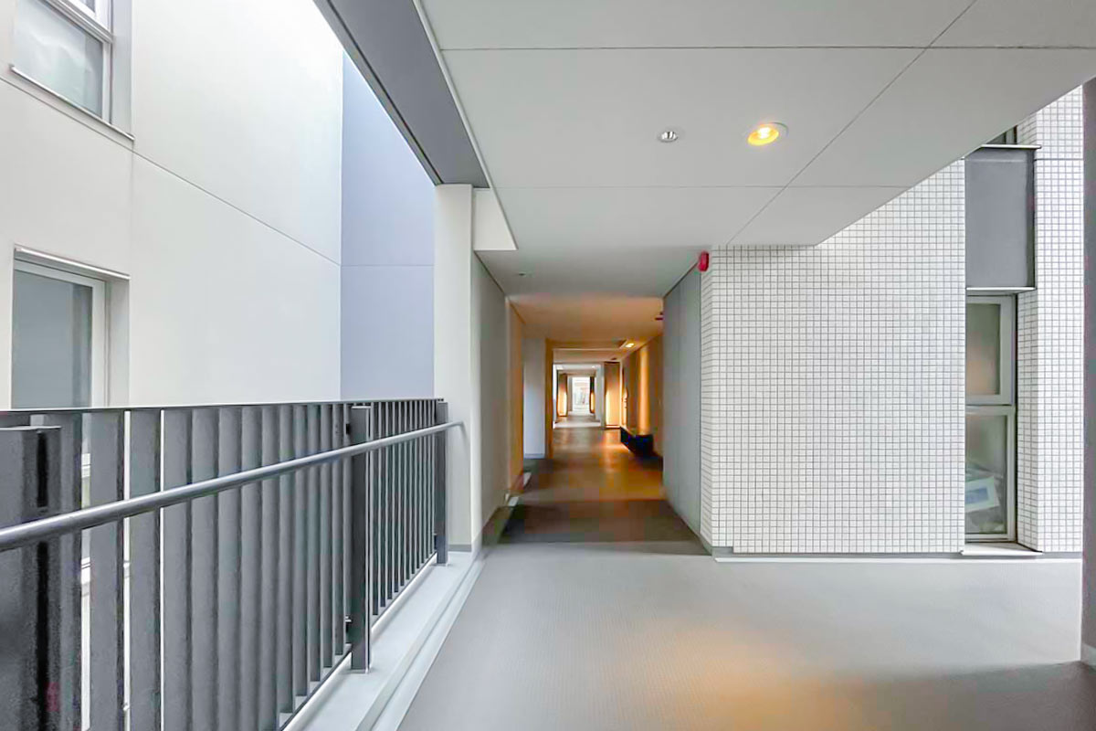 エントランスは自動ドアが開いて、階段を上がる形。1階でも地上から少し高さがでるように作られています。共用部の廊下は美術館のような雰囲気でした。