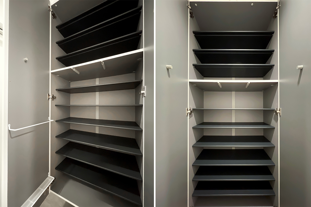 棚の高さが調整できますので、靴以外にもストック用品の収納やペット用品も扉付きの収納スペースに仕舞えます。
