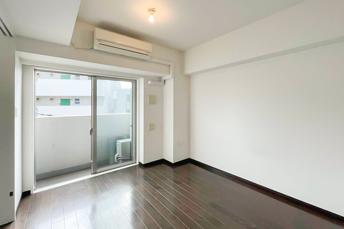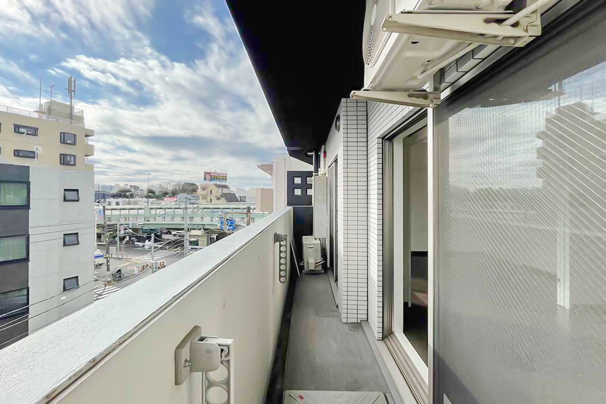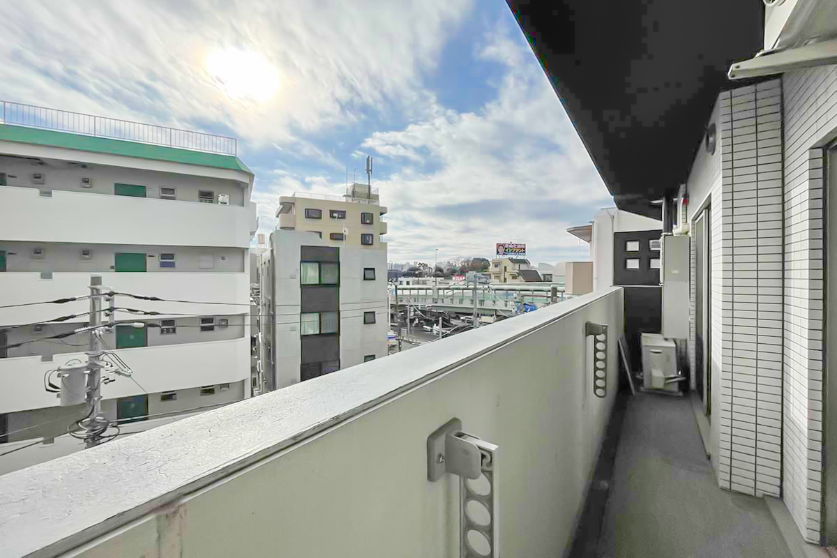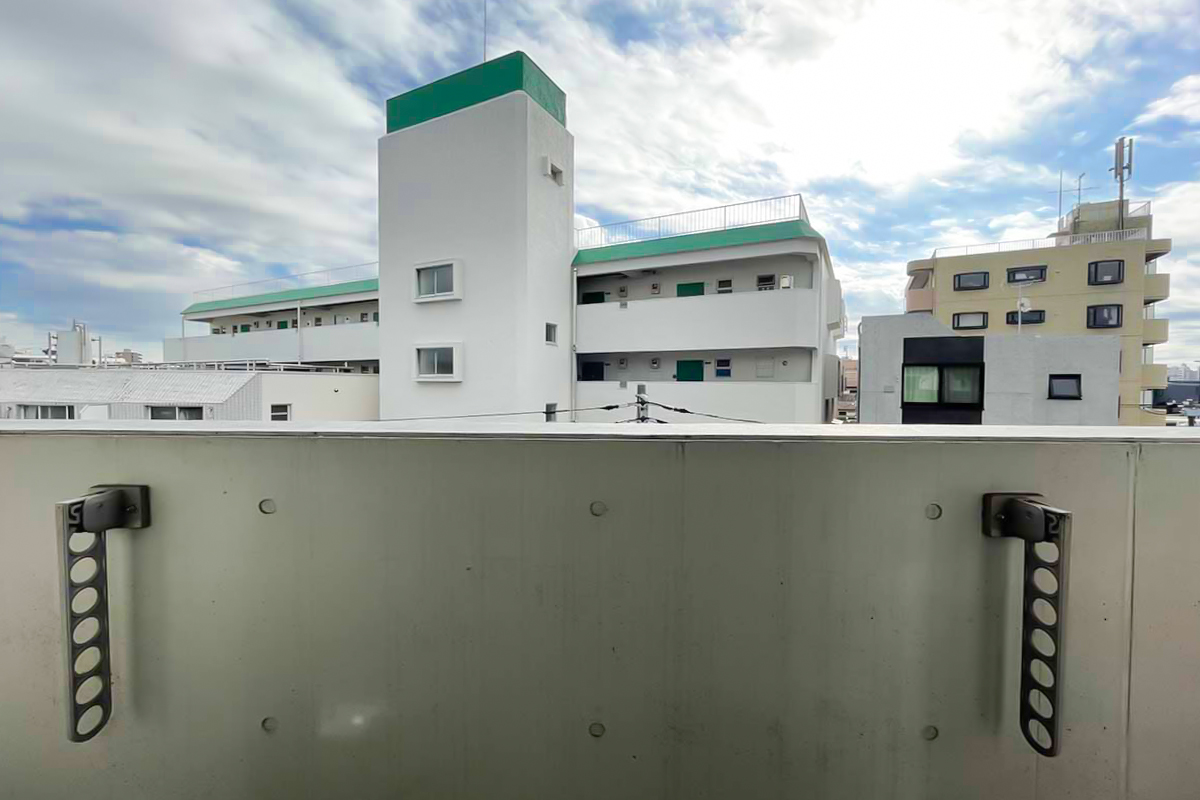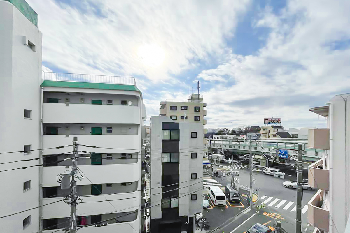 洋室の窓からは共用廊下が見えますが、その先は抜けた眺望に。