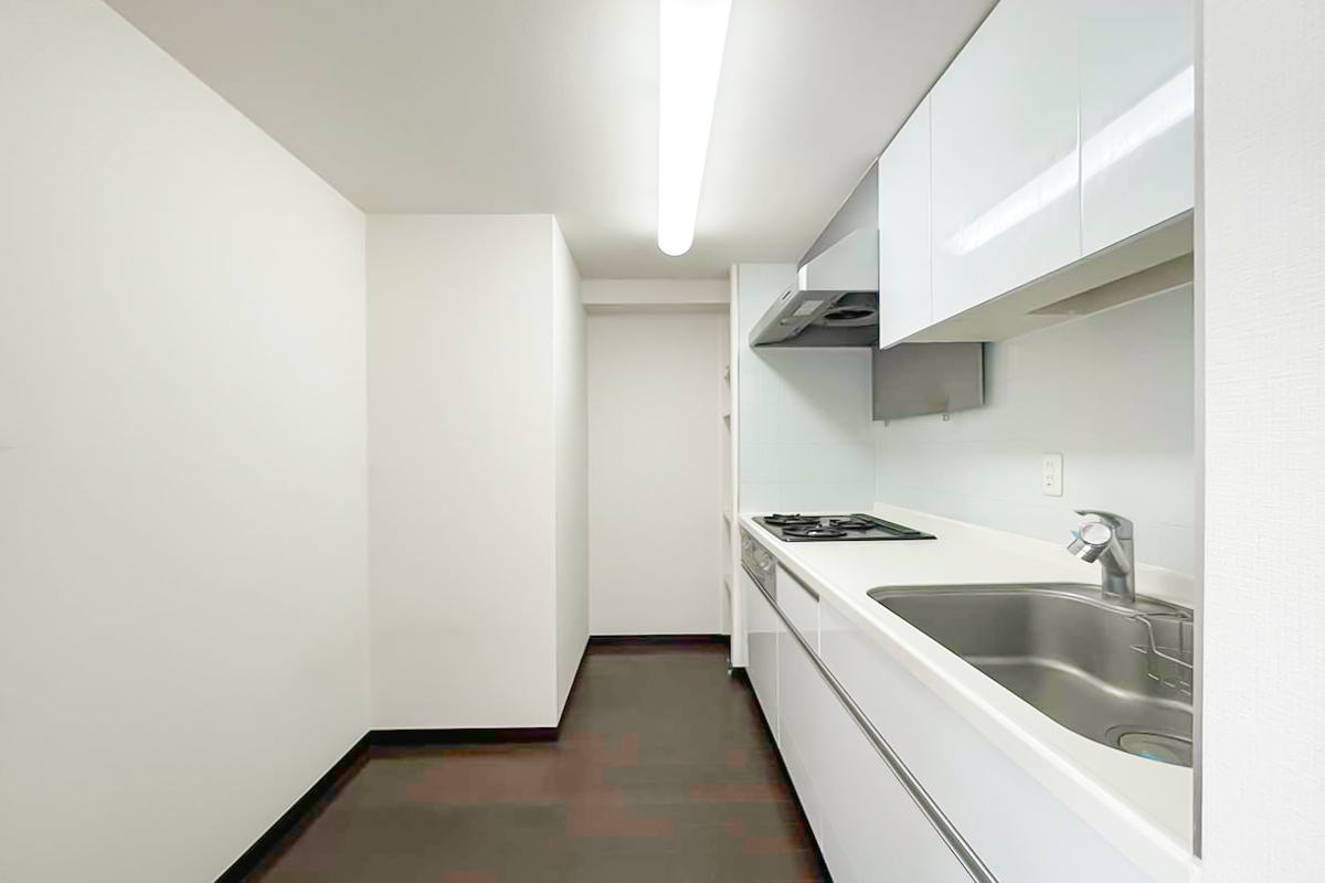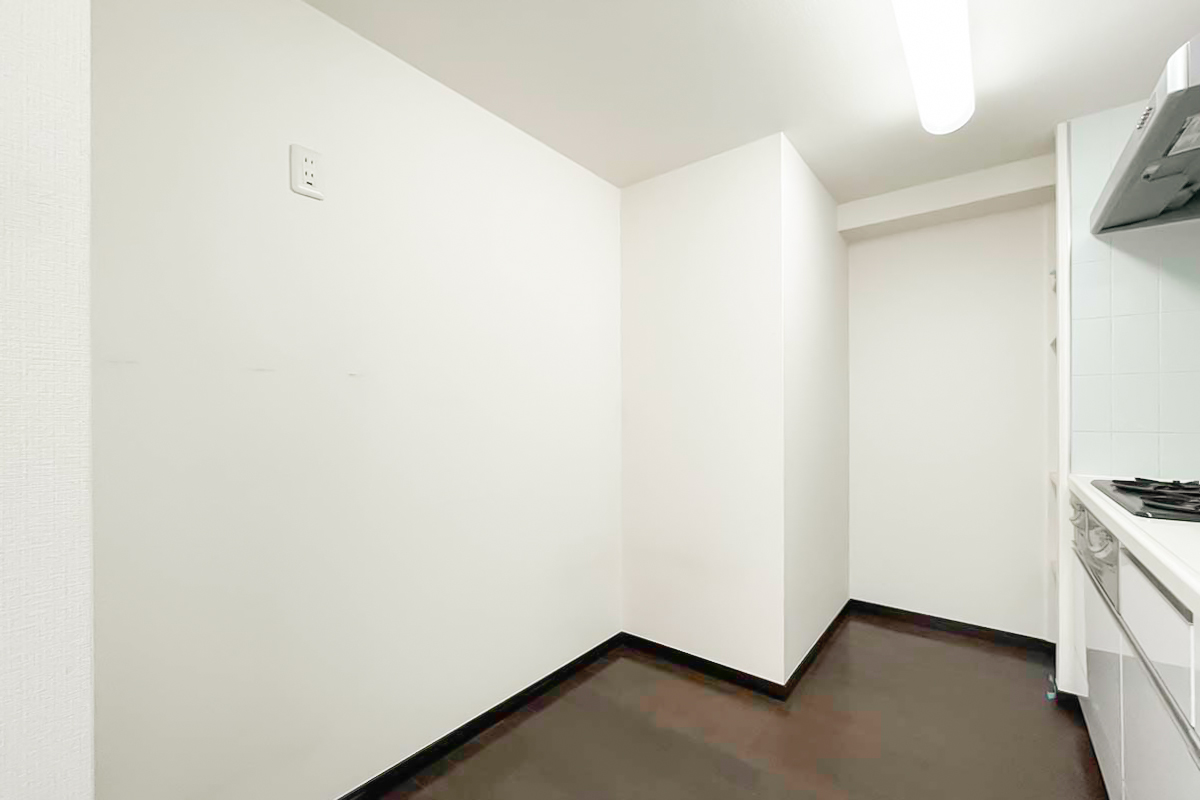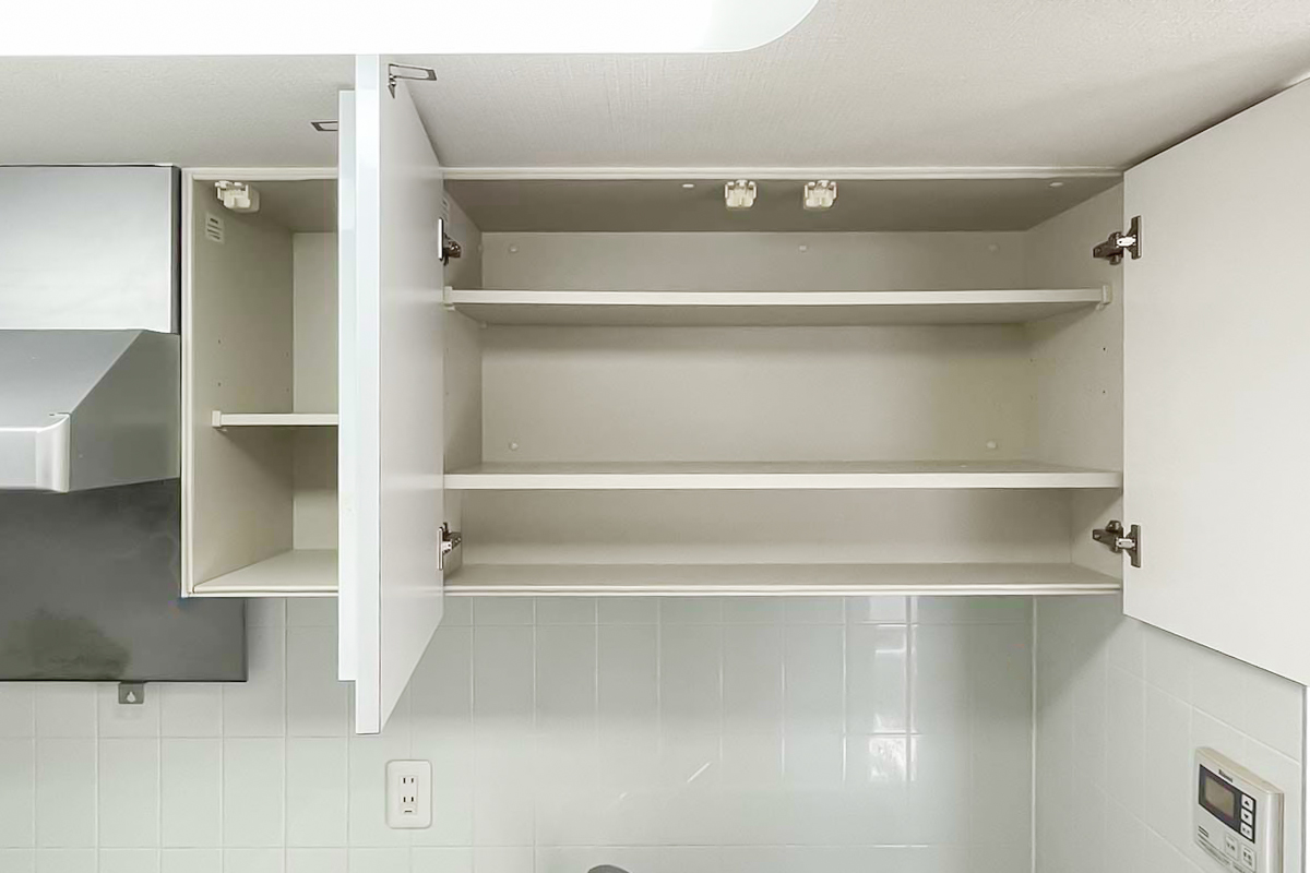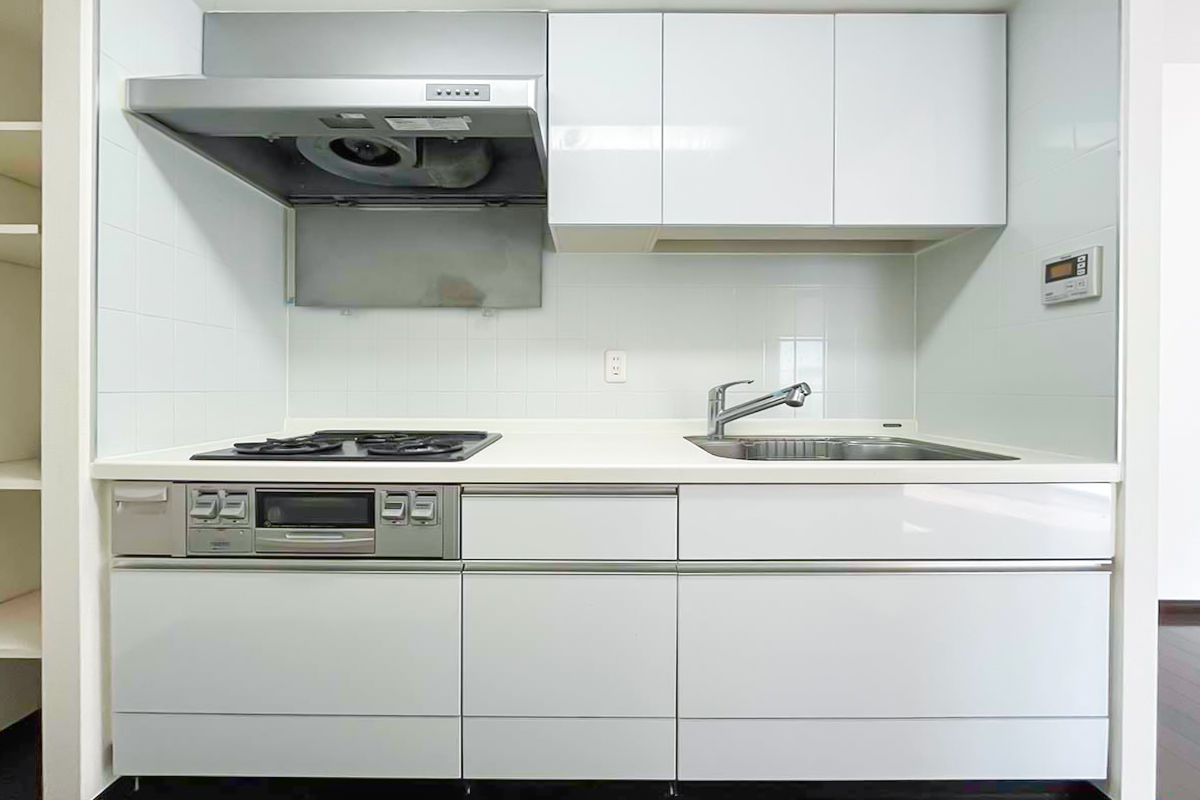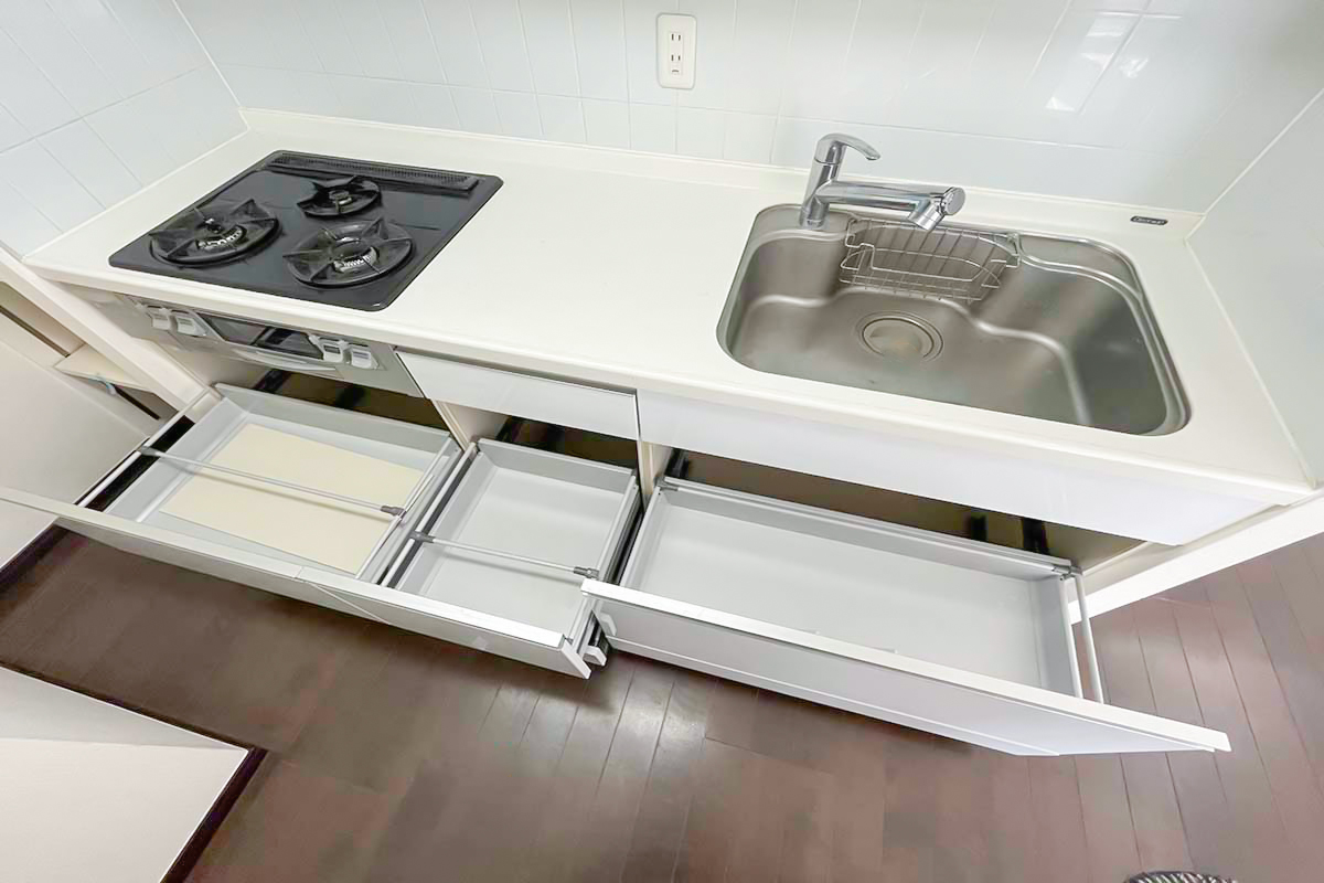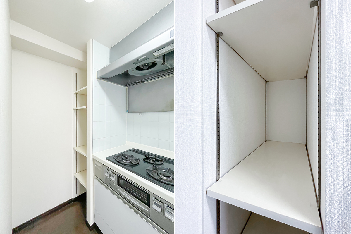 キッチン本体に2段分収納付きで、コンロ奥には奥行深い可動式棚もあり、さらに背面スペースも広々!