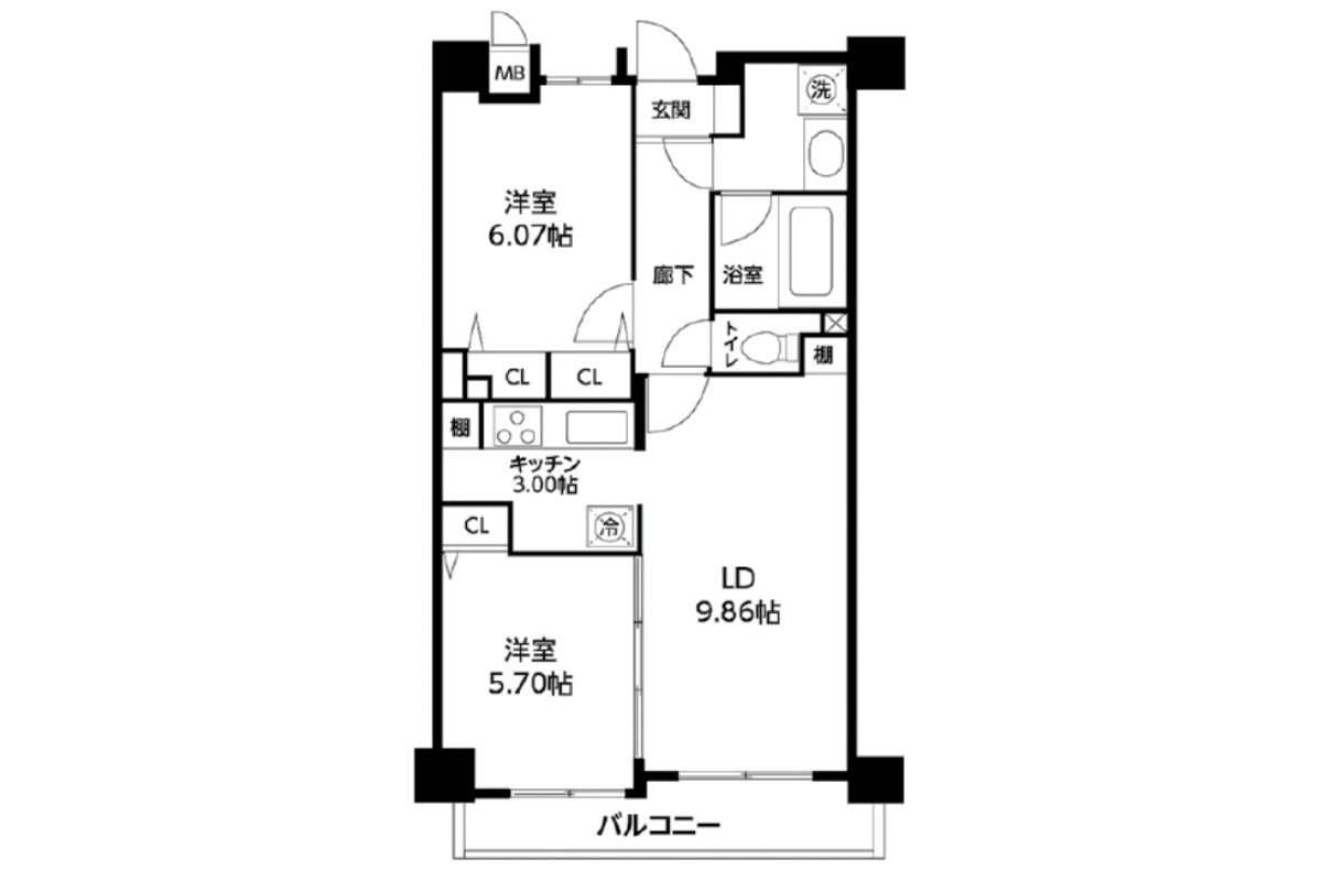お部屋は5階、南東向きの2LDKのお部屋。50㎡台の2LDKなので2~3人暮らし向けの広さです。