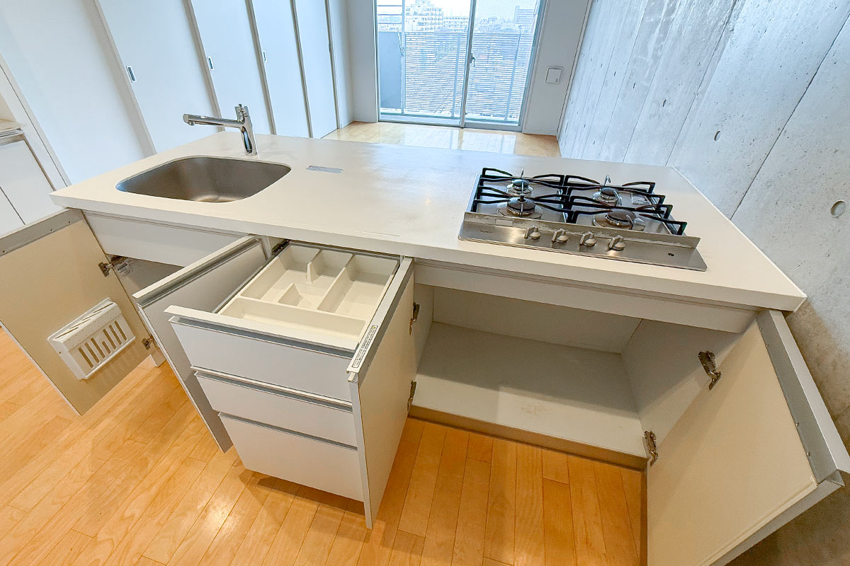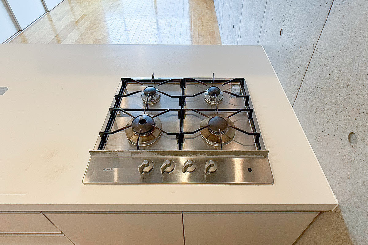 12.8帖のリビングにはカウンターキッチン。4口コンロで効率よく料理が捗りそう!