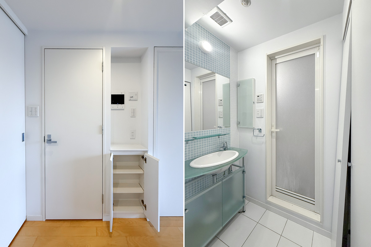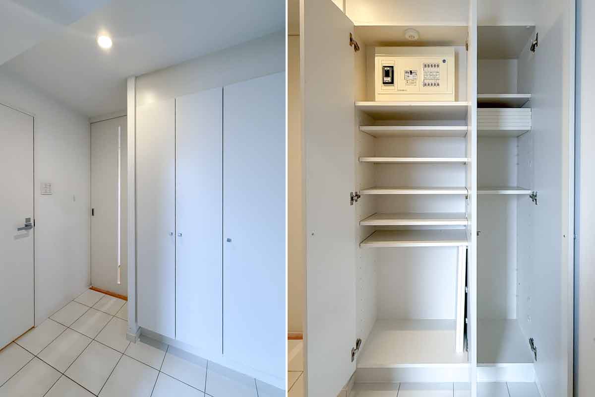 エントランスには大規模災害の備えとして救急セットや蓄電池、急病時の救命活動のためにAEDなどが設置されています。