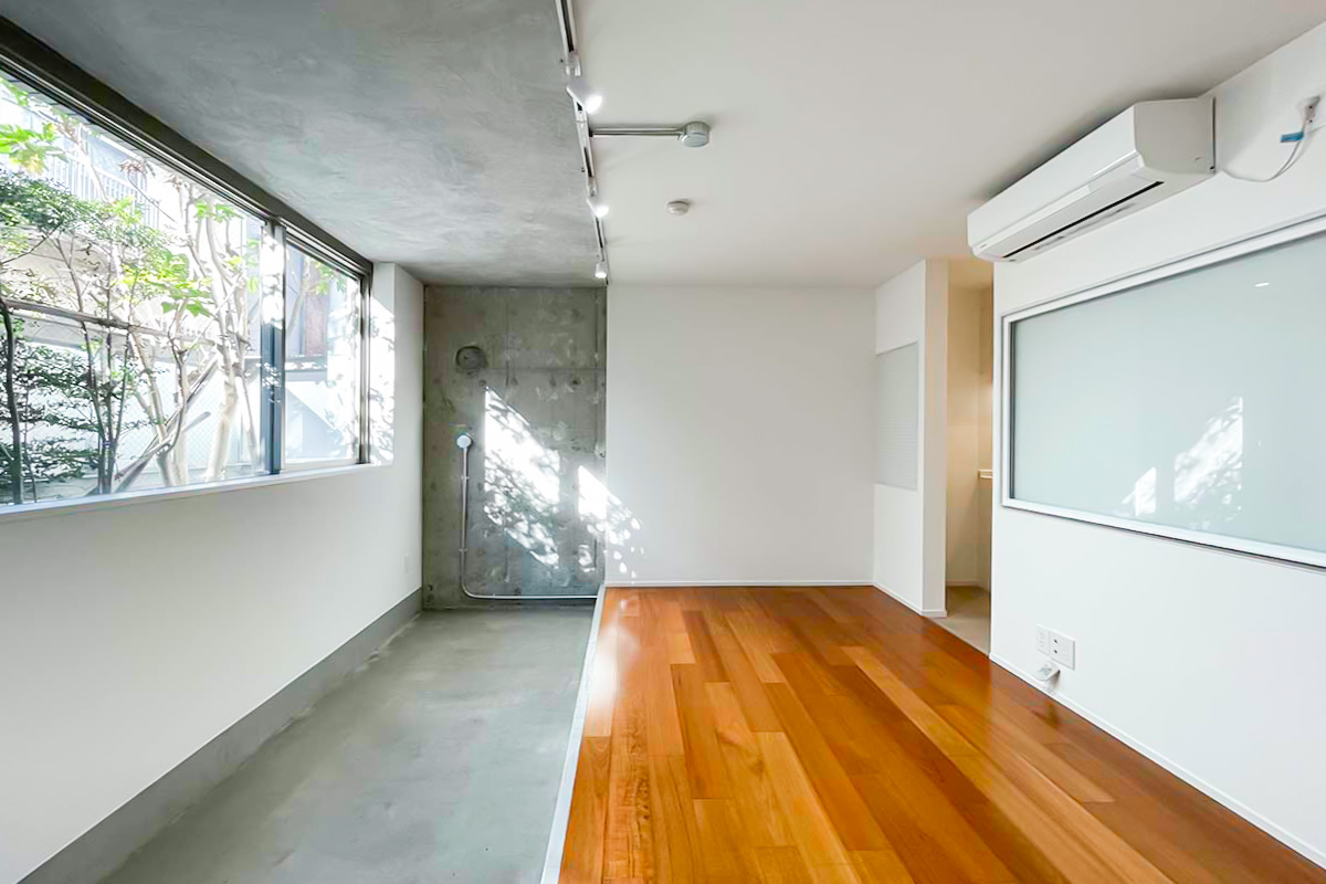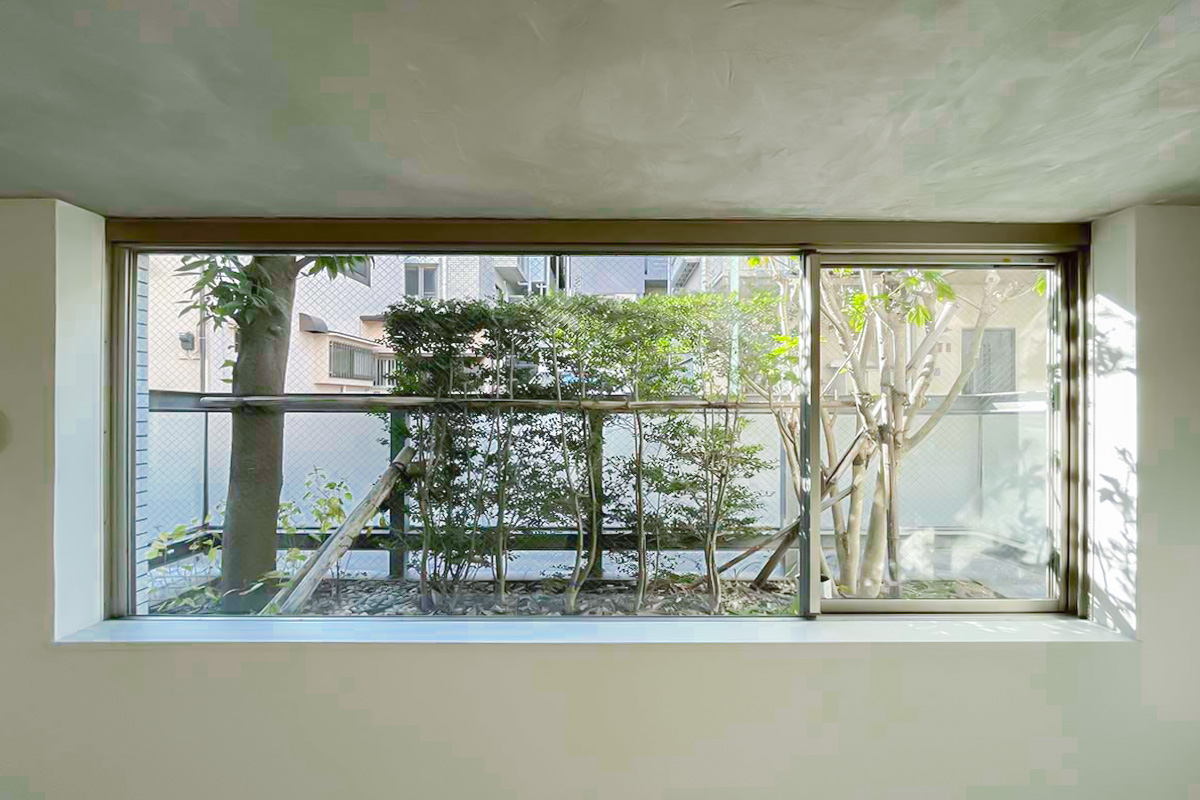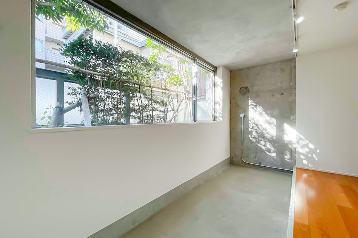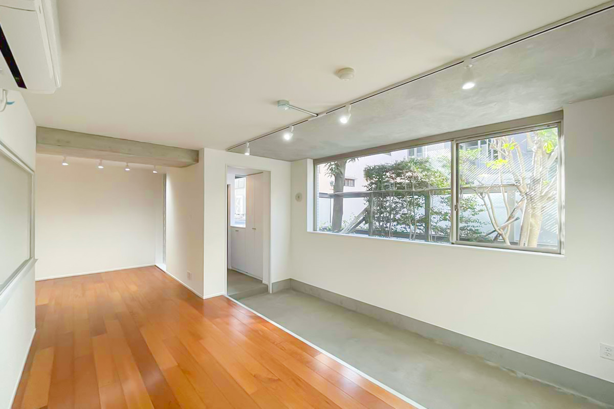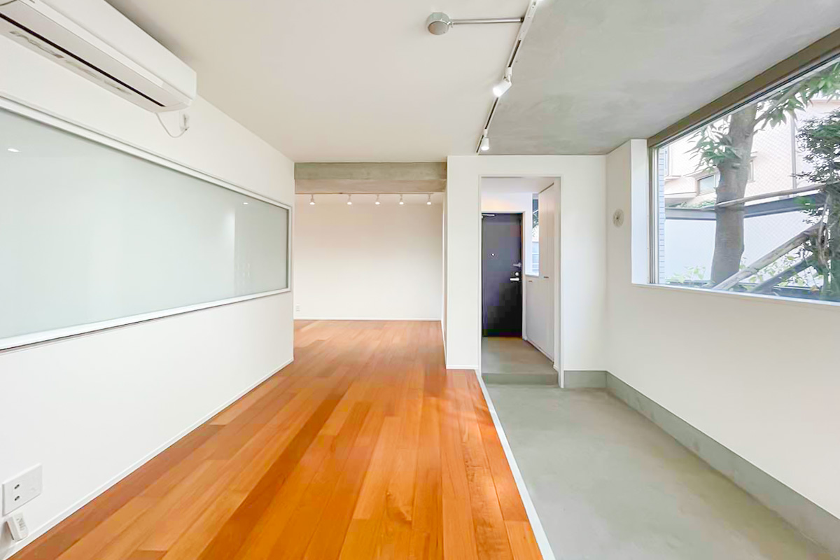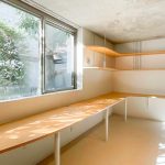 事務所・SOHOとして使うなら、手前の空間は木洩れ日降り注ぐ中で、来客や打ち合わせスペースに。
