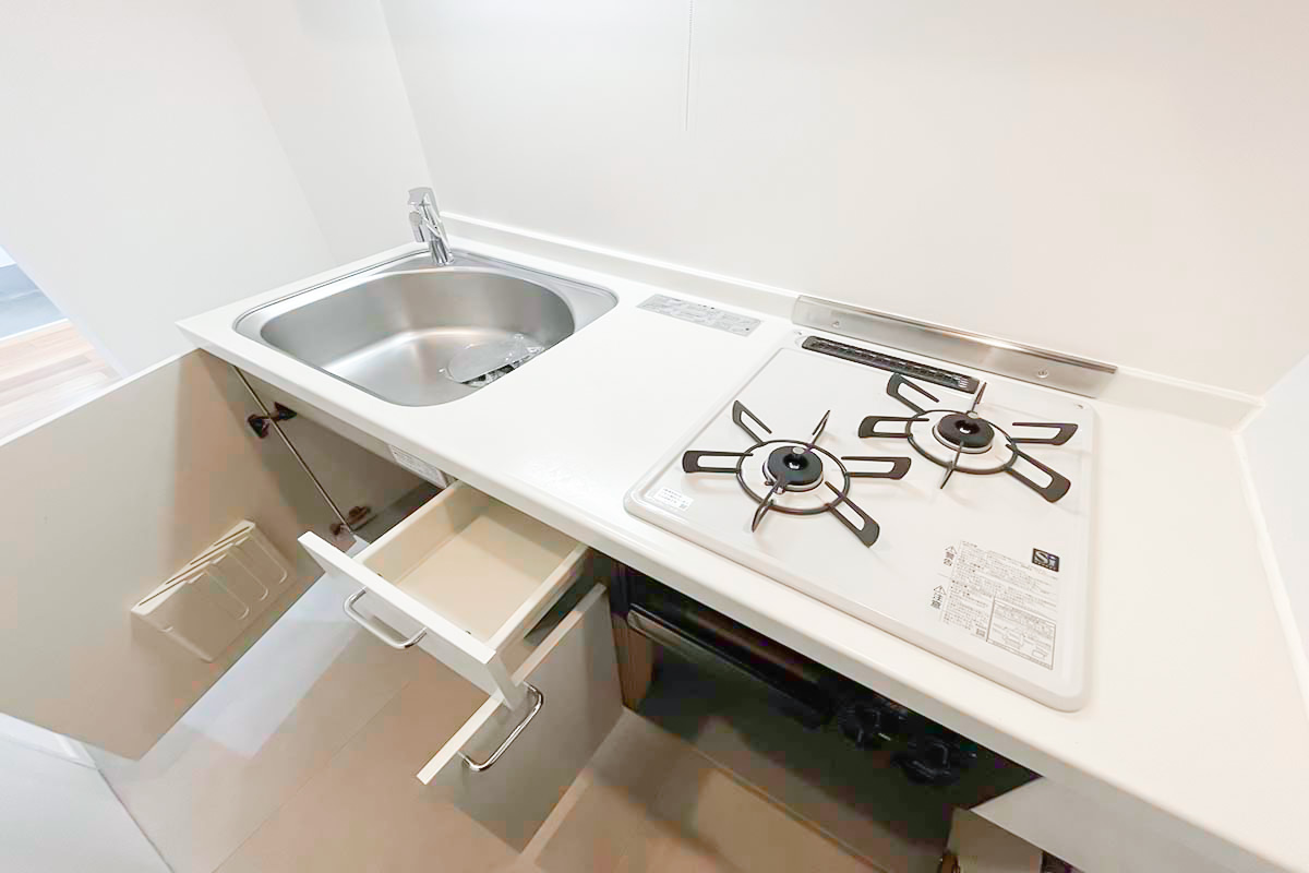 キッチン空間はややコンパクトですが、グリル付きである程度の調理も行えます。