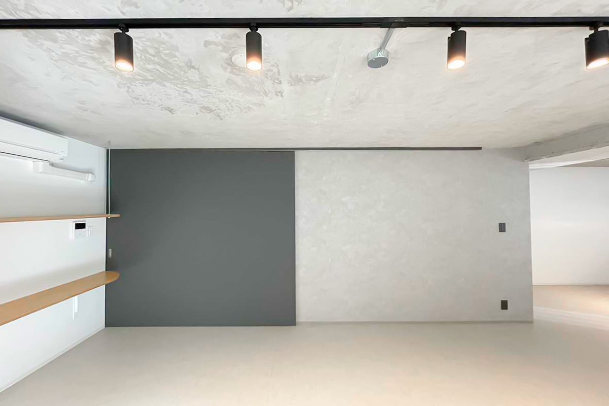 コンクリート打ち放しの天井、グレーのアクセントクロスとドアといった武骨な雰囲気を、曲線のカウンターが絶妙に雰囲気を和らげてくれているのでしょう。