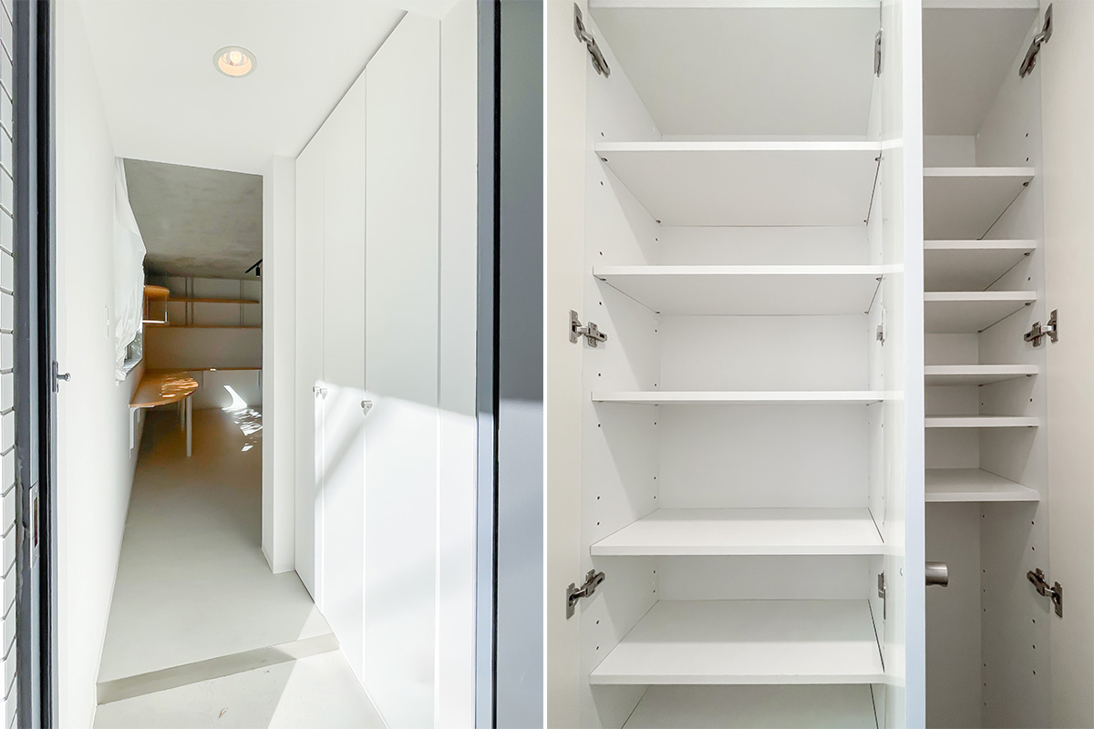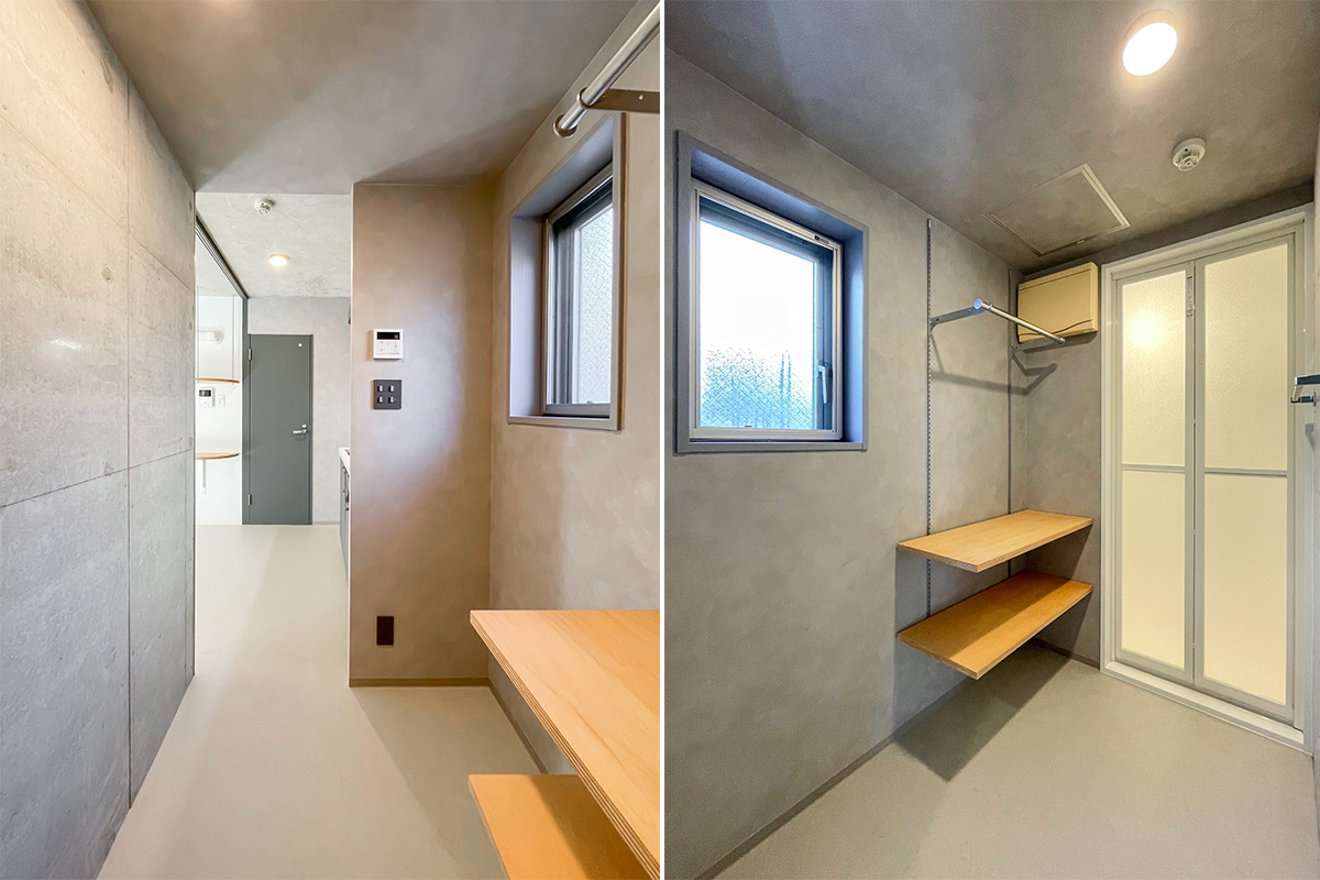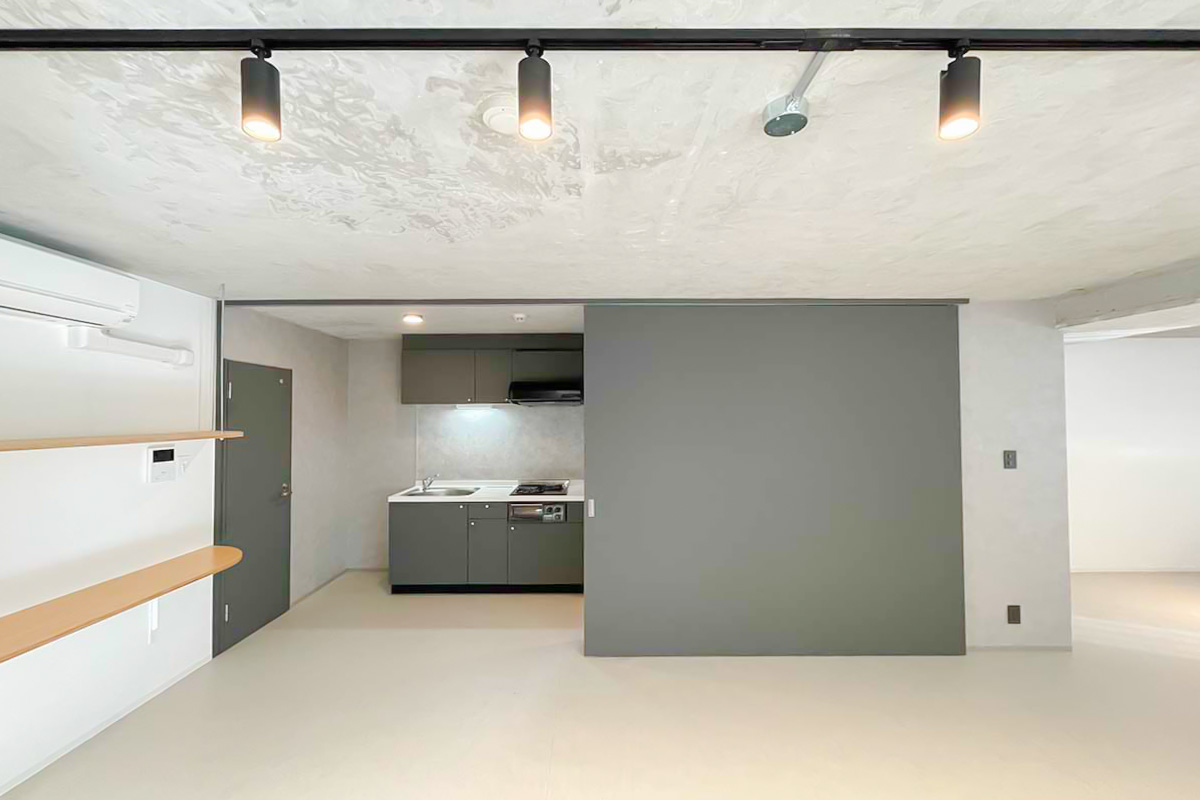 お手洗い・キッチン・WIC・シャワールームは大きなグレーの扉に隠されており、なんともスタイリッシュに生活感を隠せる仕様です。