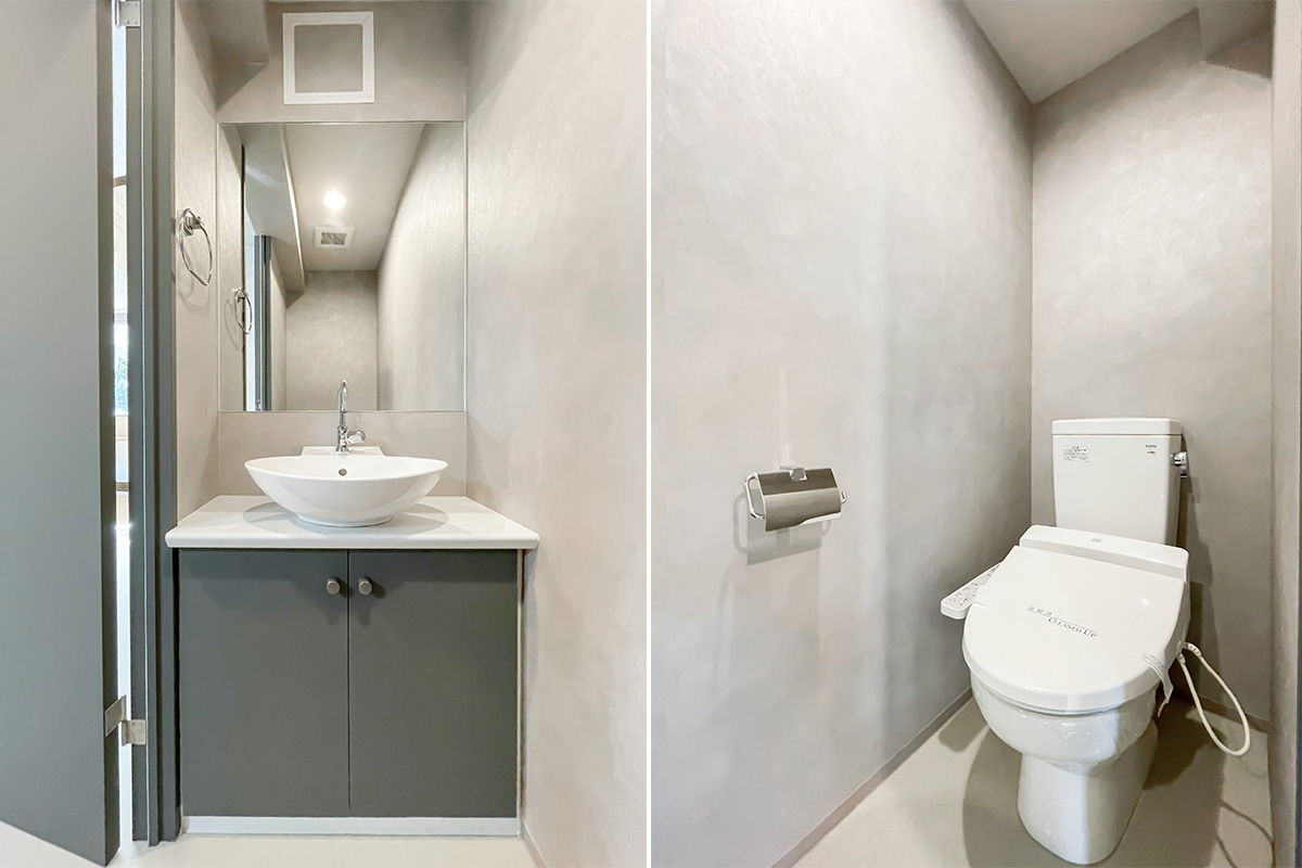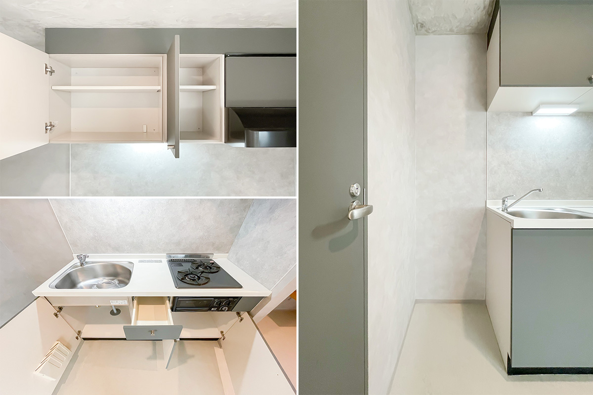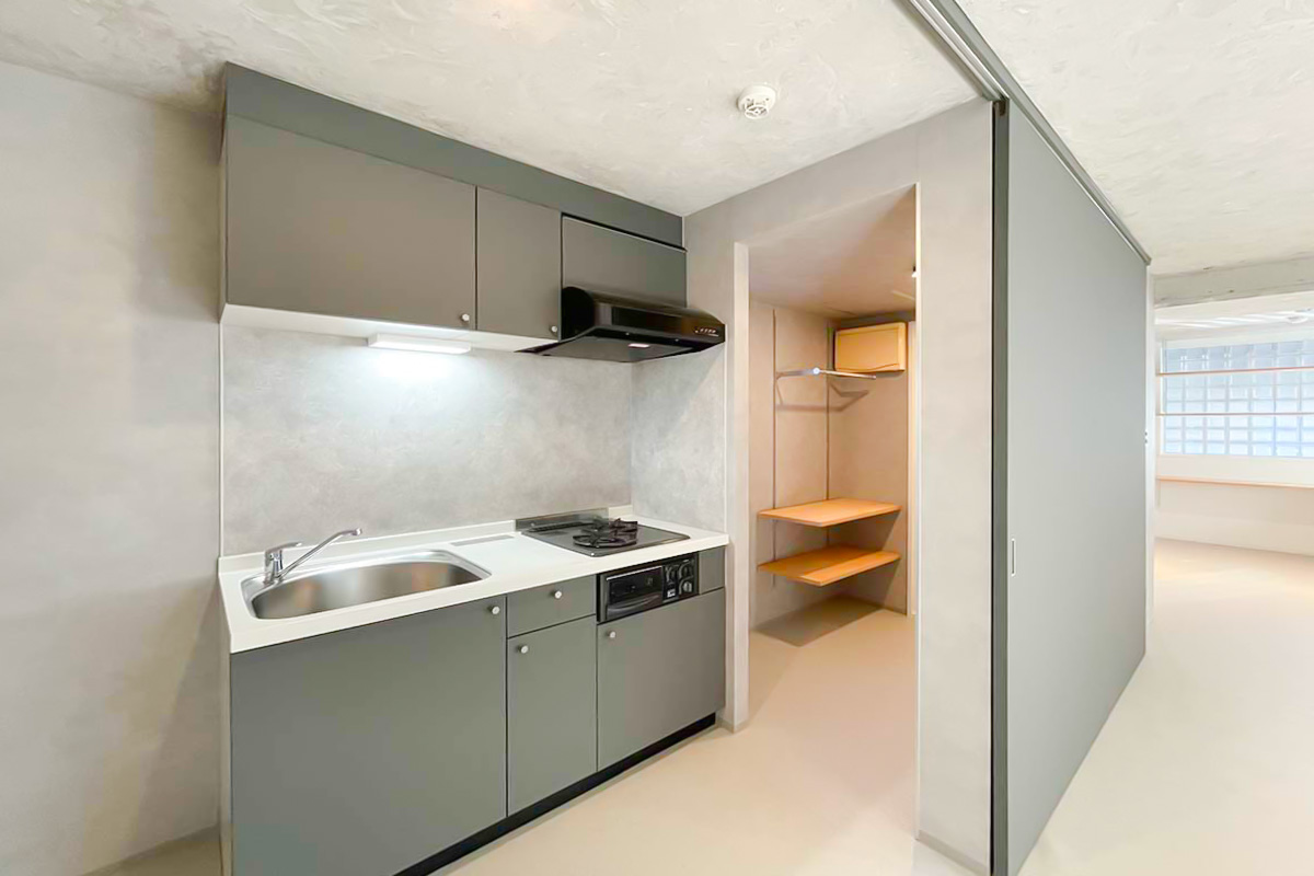 お手洗いにはしっかりとした洗面台付きで、キッチンもミニキッチンではなくグリル付きの調理もできるしっかりとしたタイプなので、一見事務所・SOHO使いになってしまいそうな物件ですが、住居としても十分使えそうな仕様です。