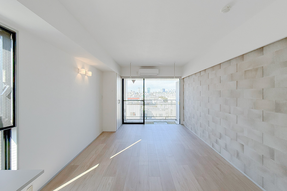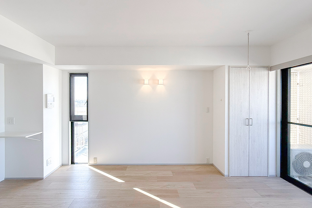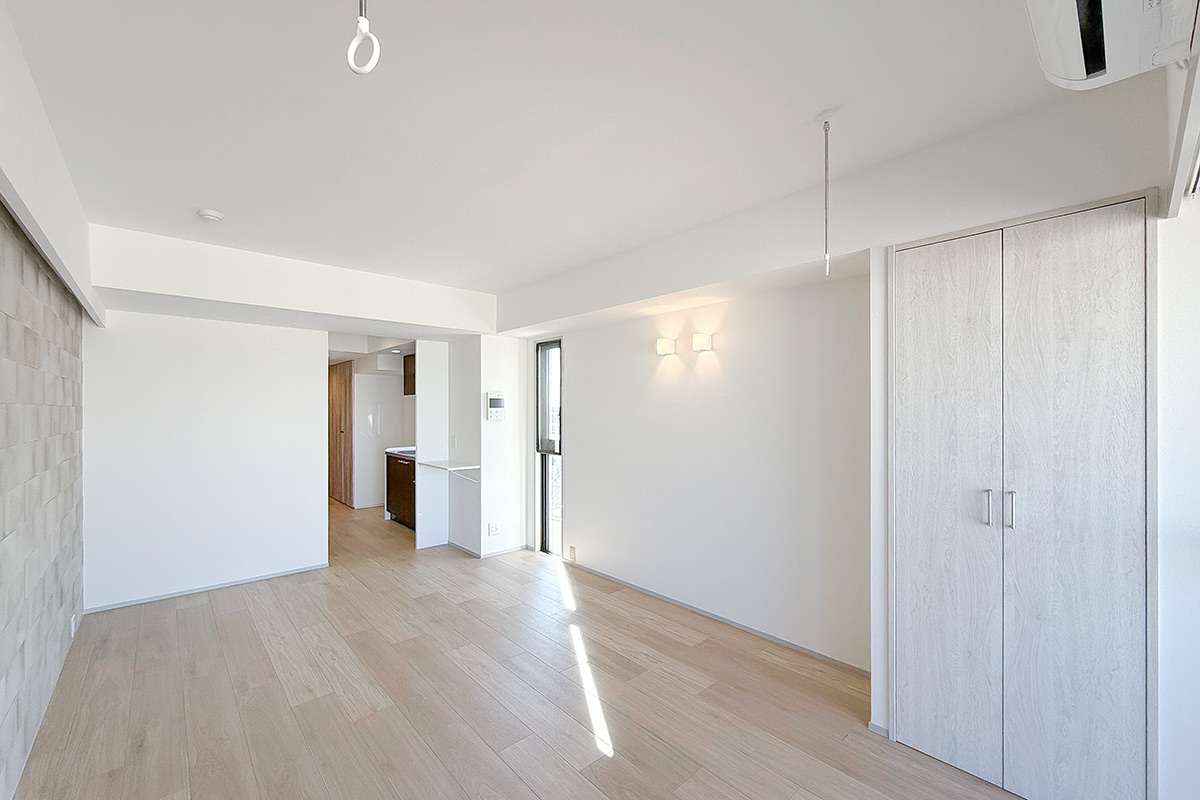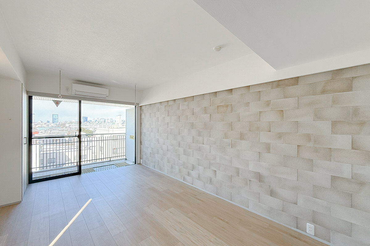 角部屋で西側に縦長の窓もあり、差し込む細い光とアクセントウォールが良いコンビネーション。