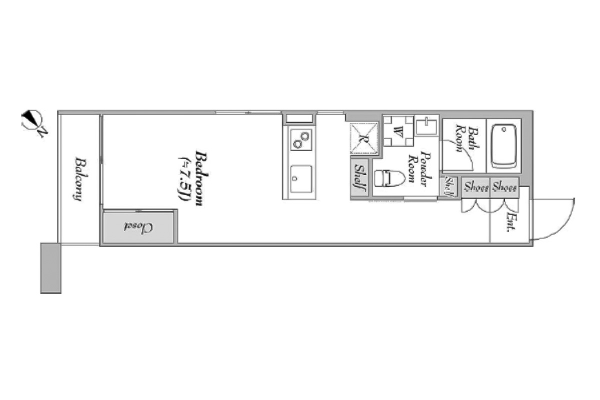 写真の部屋はキッチンが壁付けタイプですが、募集のお部屋はカウンターキッチンタイプで、冷蔵庫置き場の横にシェルフ付き。