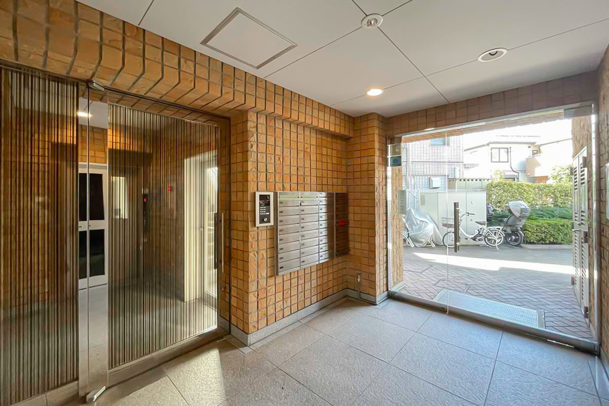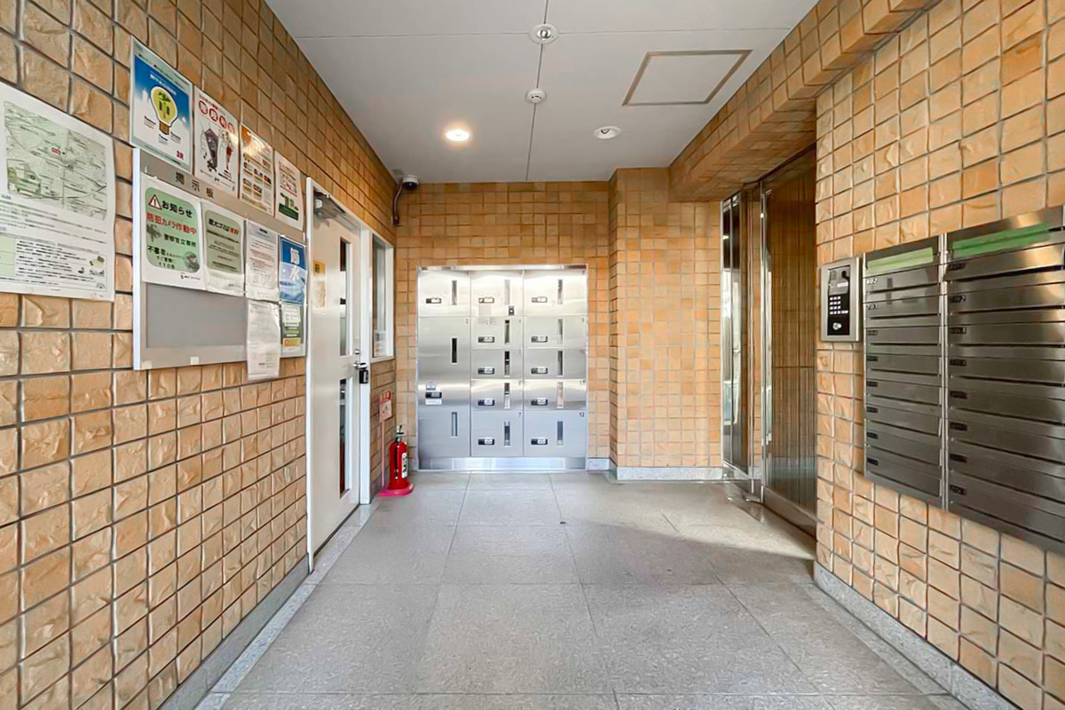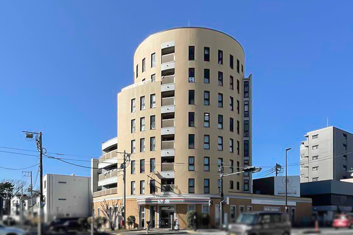 円柱のような外観が特徴的で、1階部分にはコンビニや歯科医院が入っており、マンションの入口は大通り沿いではなく側道を入ったところにあります。