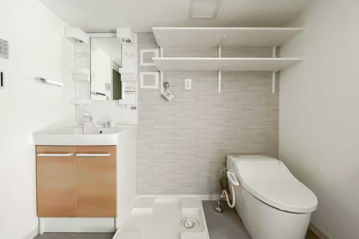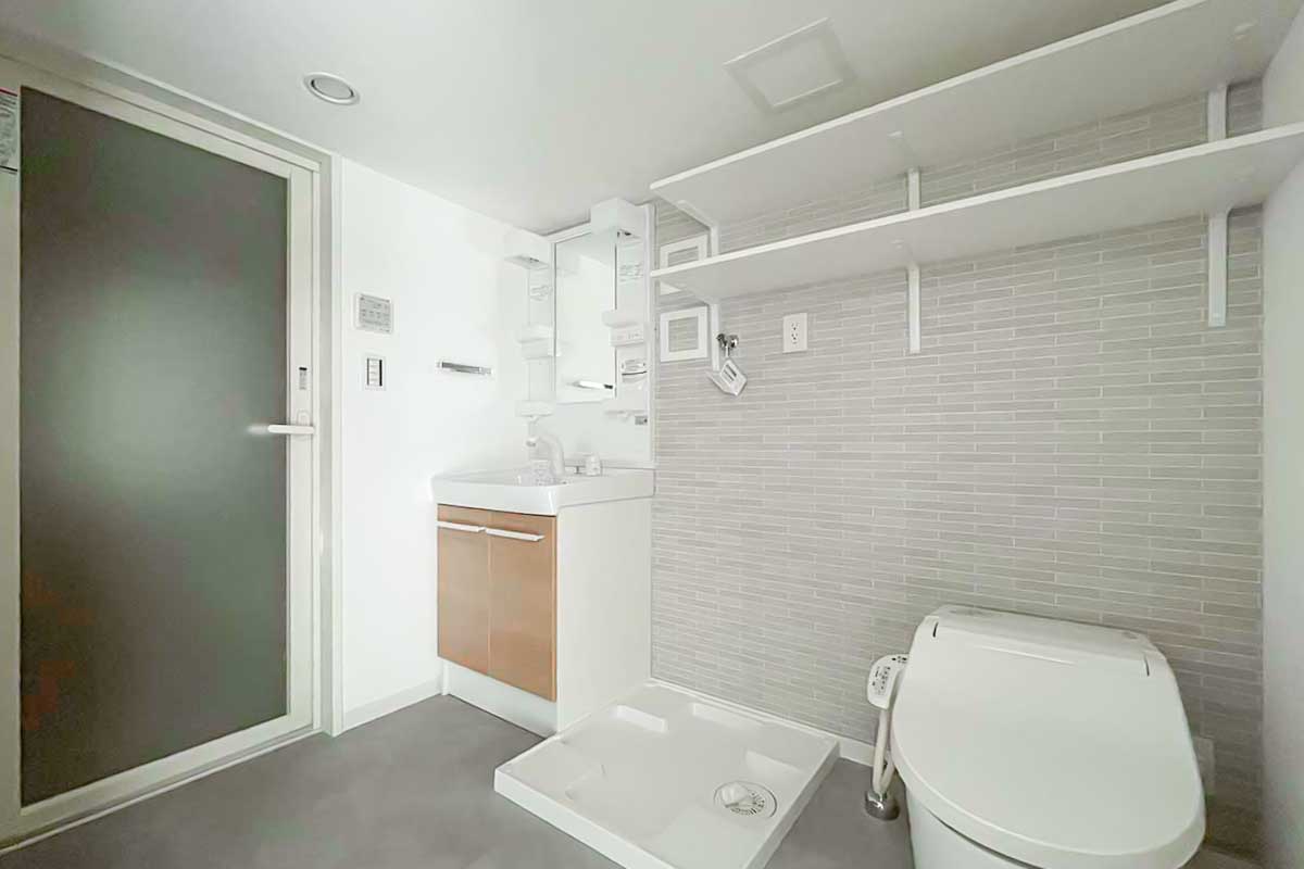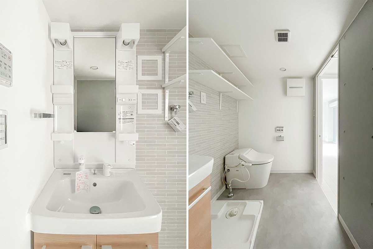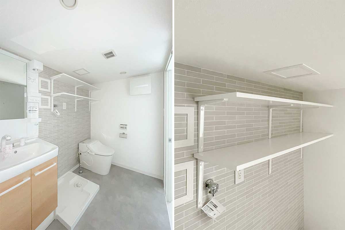 洗面脱衣所とお手洗いの空間は1つにまとまっていますが、仕切りや扉が無いことで空間自体は広く、棚等も設けられています。
