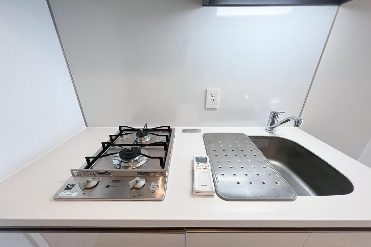 5.7帖のダイニングキッチンには2口コンロのシステムキッチン、調理場が狭いこともあり、シンクには付属の板がありました。