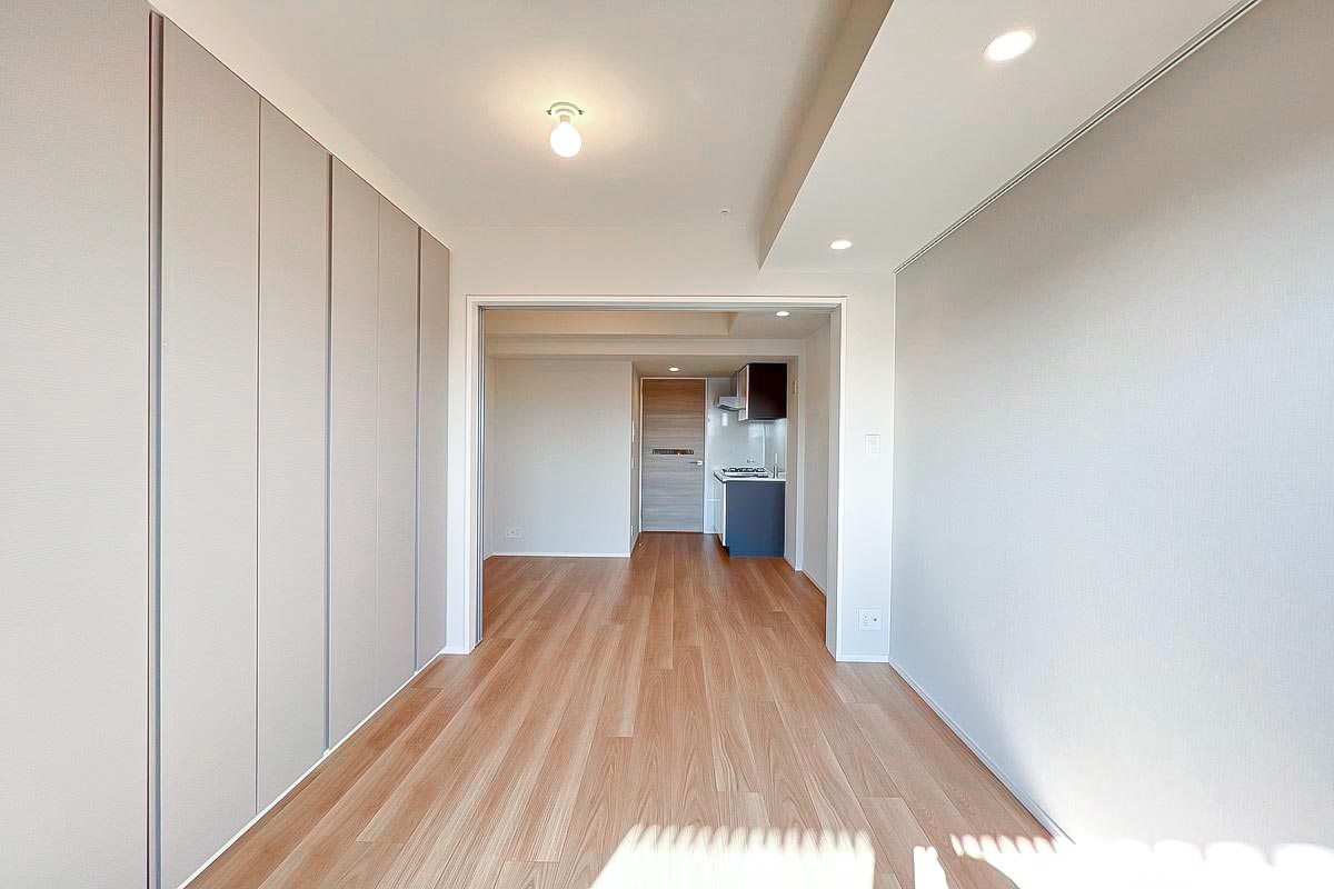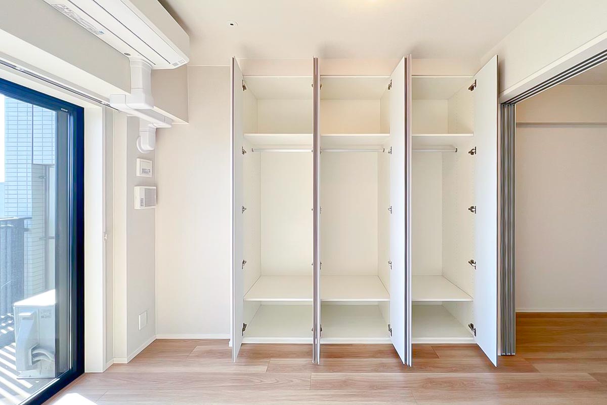 スライドドアを開けると4.3帖の寝室、こちらのお部屋には壁一面にクローゼット。お洋服や小物が多い方でも十分な収納量があると思います。たまにはクローゼットと窓を開け、風通しするのも良いかもしれません。