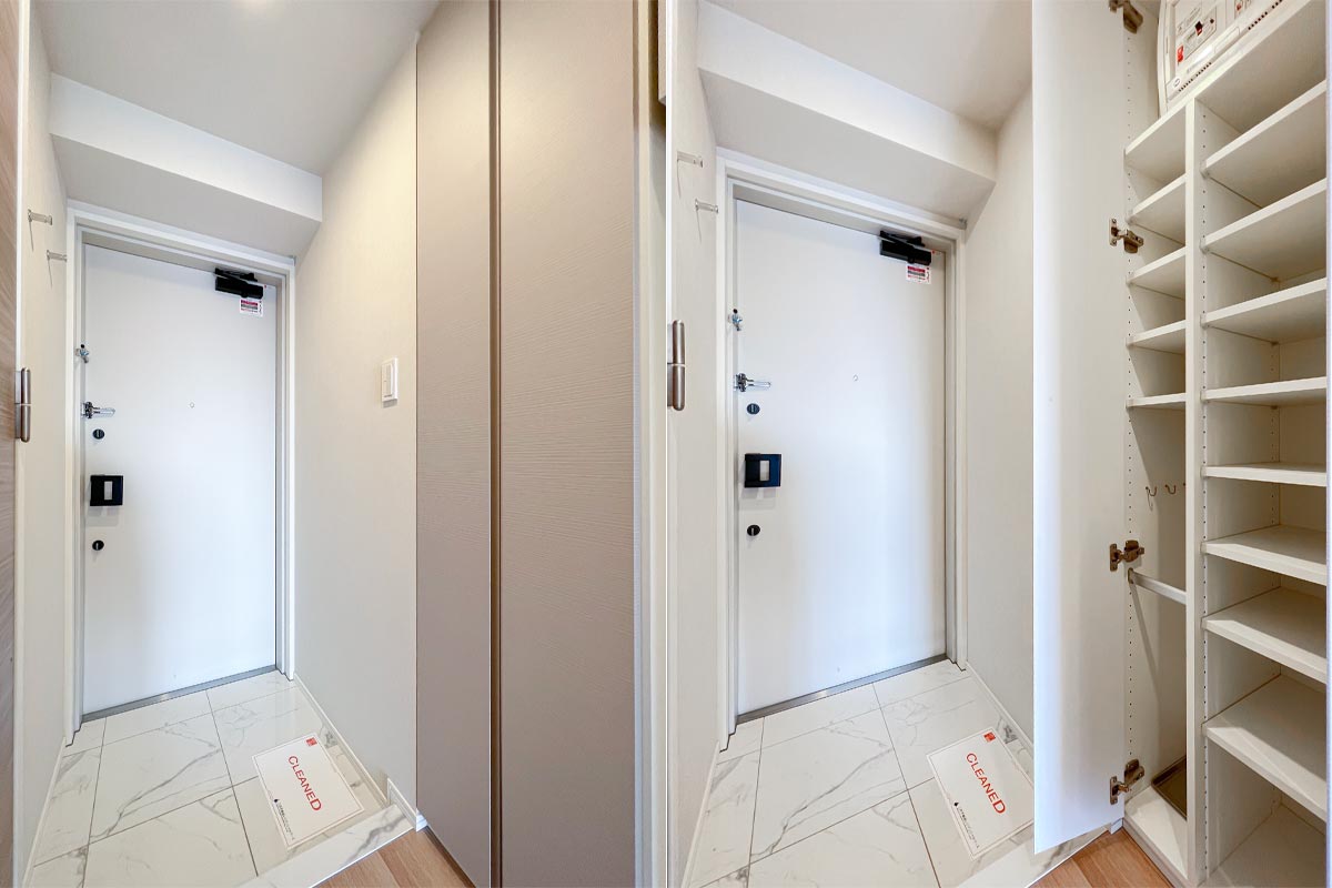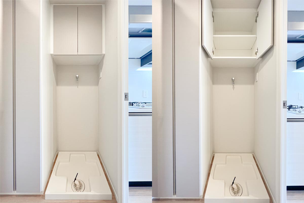 玄関入って左手には縦長いシューズボックス。その奥に進むと室内洗濯機置き場、洗濯機のすぐ上に戸棚がついているので洗剤類の収納などに使うと生活感を消してくれそう。